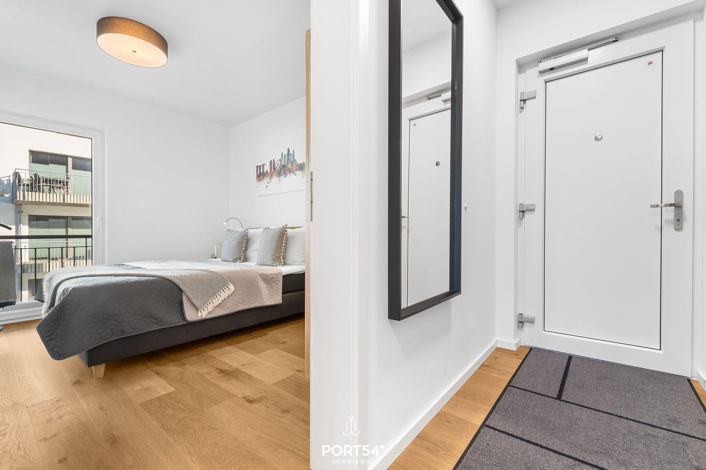Die 76m² große Ferienwohnung "Zuhause am Meer" im 2. Obergeschoss bietet Platz für bis zu 4 Personen. Zwei Balkone bieten herrliche Ausblicke auf die Ostsee und das Resort. Die Wohnung verfügt über ein Schlafzimmer mit Boxspring-Doppelbett, ein weiteres mit zwei Einzelbetten, ein modernes Bad, eine gut ausgestattete Küche sowie einen gemütlichen Wohnbereich mit Kaminofen. Zudem gibt es einen Tiefgaragenstellplatz, Fahrradschuppen und einen Aufzug. Der Strand ist nur wenige Minuten entfernt.