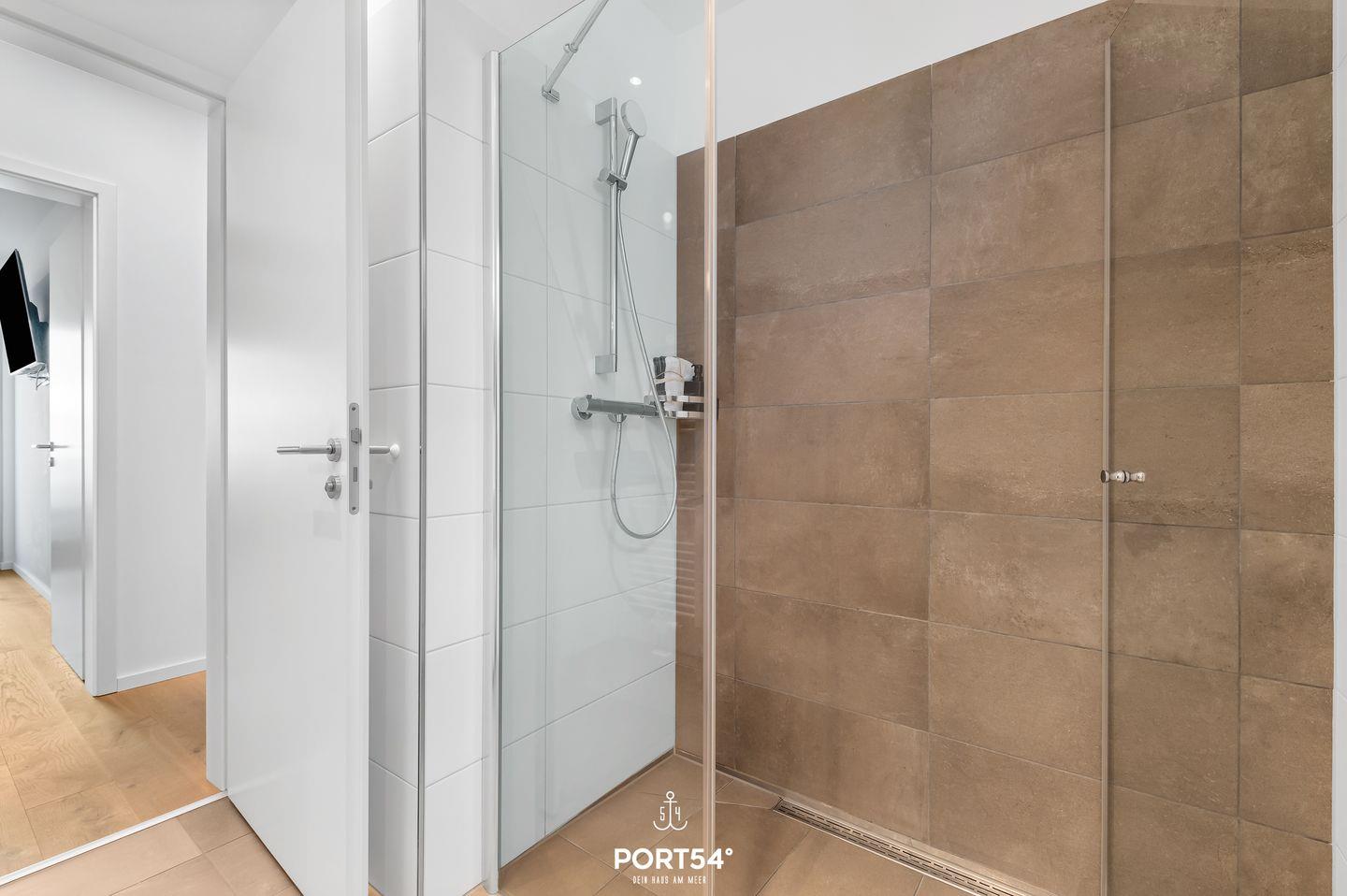 Gegenüber der Schlafzimmer befindet sich das Tageslichtbad, das mit einer bodengleichen Dusche ausgestattet ist. Zudem stehen Dir hier ein Handtuchheizkörper, ein Kosmetikspiegel, ein Föhn sowie eine Waschmaschine zur Verfügung.