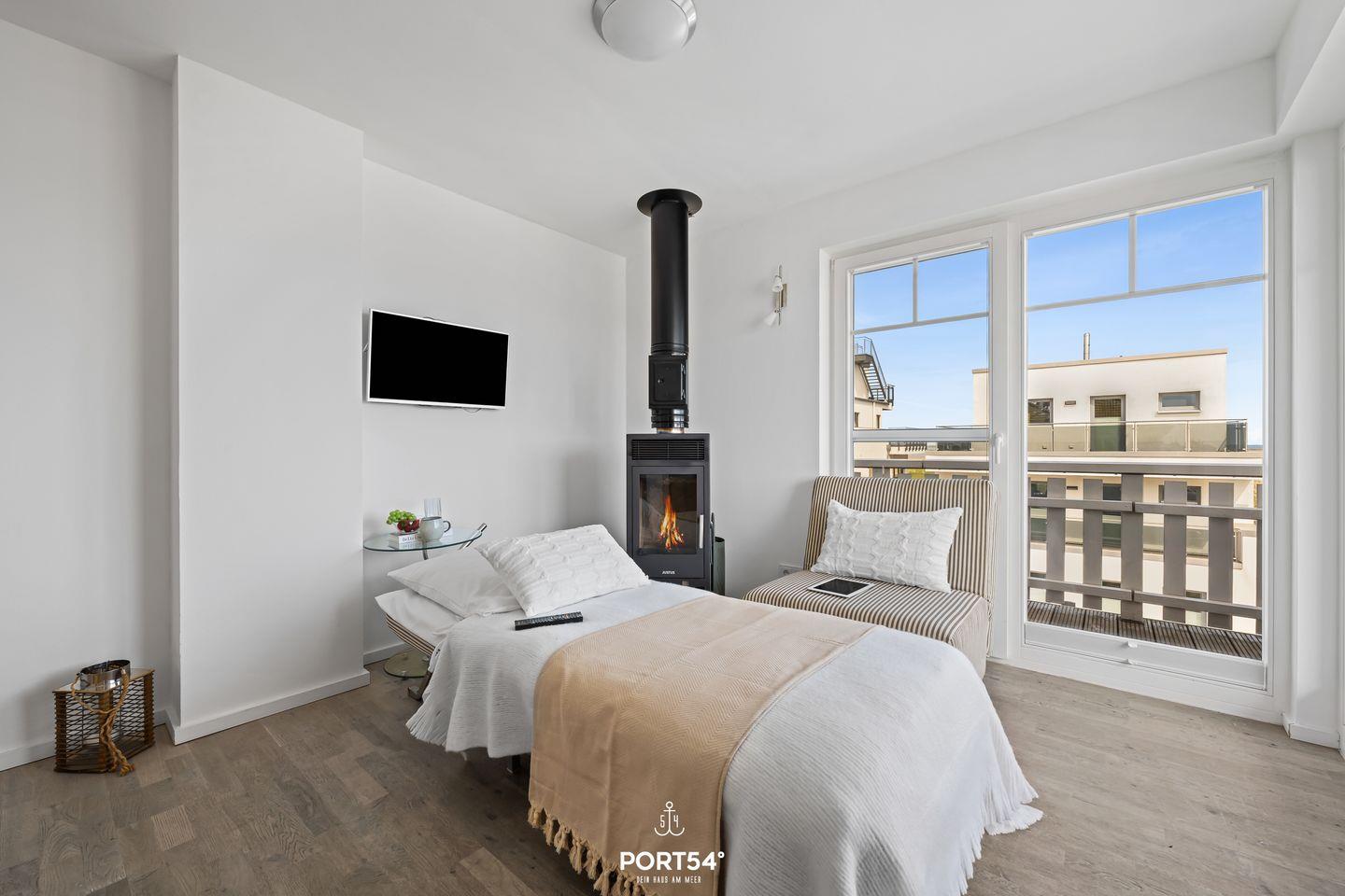 Im 2. Obergeschoss befindet sich das beeindruckende Studio der Wohnung. Mach es Dir auf den zwei Schlafsesseln (80x200?cm) gemütlich und lass Dich vom Flachbild-Fernseher unterhalten. Verdunkelungsmöglichkeiten und Insektenschutzgitter ermöglichen es Dir, hier gut zu schlafen. An den kälteren Tagen ist das Studio das Highlight der Strandvilla: Ein Kaminofen sorgt für wohlige Wärme. Angrenzend befindet sich die finnische Sauna mit Dusche. Der Balkon auf dieser Etage verspricht Dir einen tollen Blick auf die Schlei, die Schleimündung und auf das an das Resort angrenzende Naturschutzgebiet. Relax hier oben auf den Sonnenliegen oder lass Deinen Blick weiter schweifen über den Privatstrand und die Ostsee. Beobachte das bunte Treiben an Land und zu Wasser und verbringe traumhafte Stunden.
