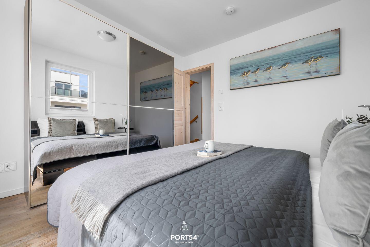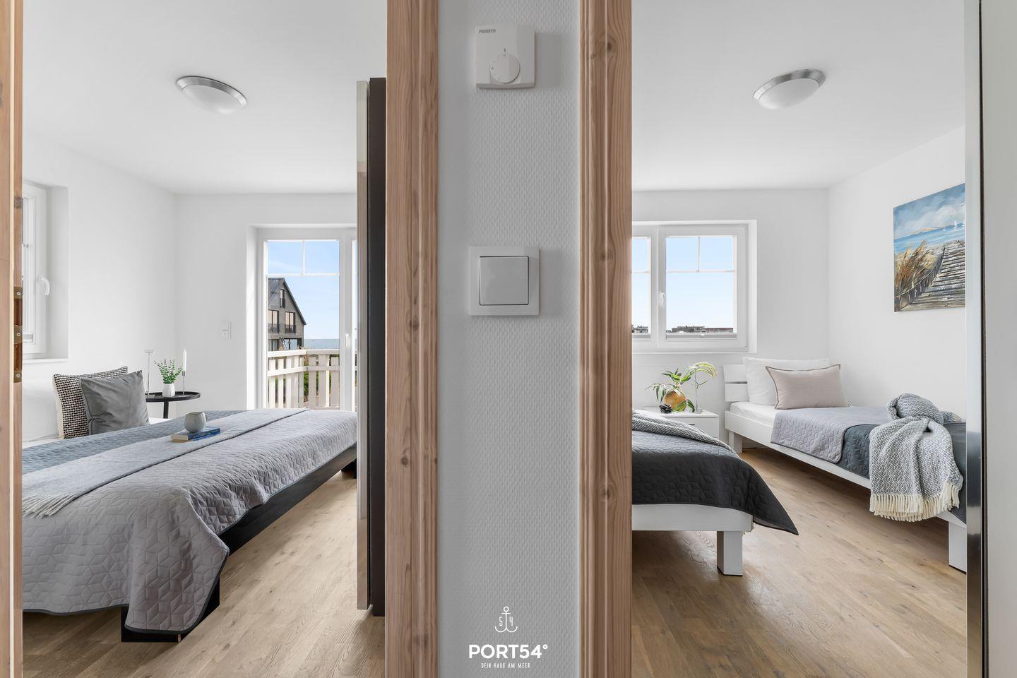 Im 1. Obergeschoss befindet sich ein Tageslichtbad mit einer Whirlwanne. Ein Kosmetikspiegel, ein Fön und Insektenschutzgitter sorgen für Komfort. Die beiden Schlafzimmer ermöglichen Dir dank Verdunkelungsmöglichkeiten und Insektenschutzgitter einen erholsamen Schlaf. Das Hauptschlafzimmer ist mit einem Doppelbett (180x200?cm), einem Kleiderschrank und einer Kommode ausgestattet und bietet Dir einen eigenen Balkon. So kannst Du direkt nach dem Aufstehen die frische Ostseeluft und die Aussicht auf den Strand genießen. Das andere Schlafzimmer verfügt über zwei Einzelbetten (80x200?cm) und einen Kleiderschrank.