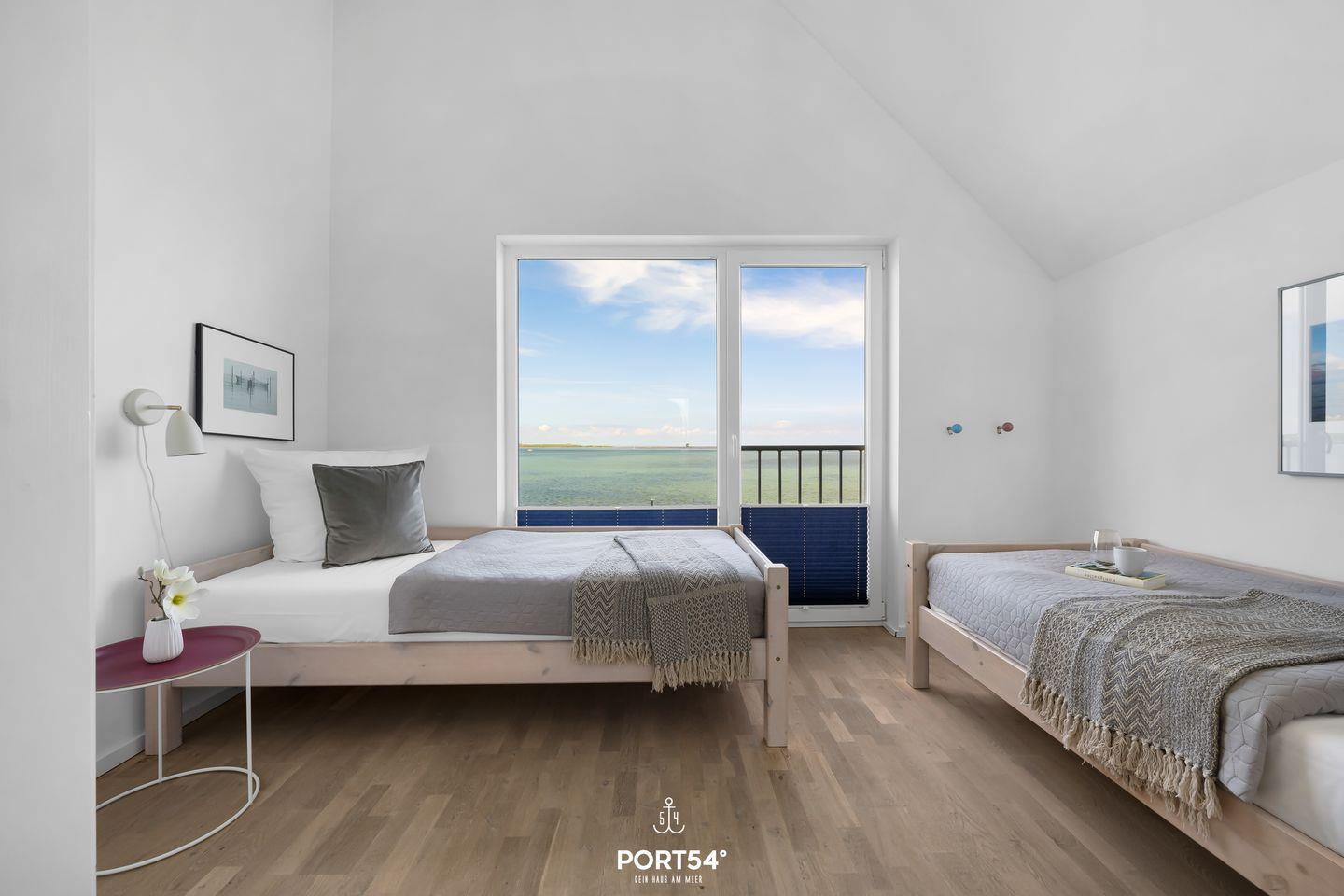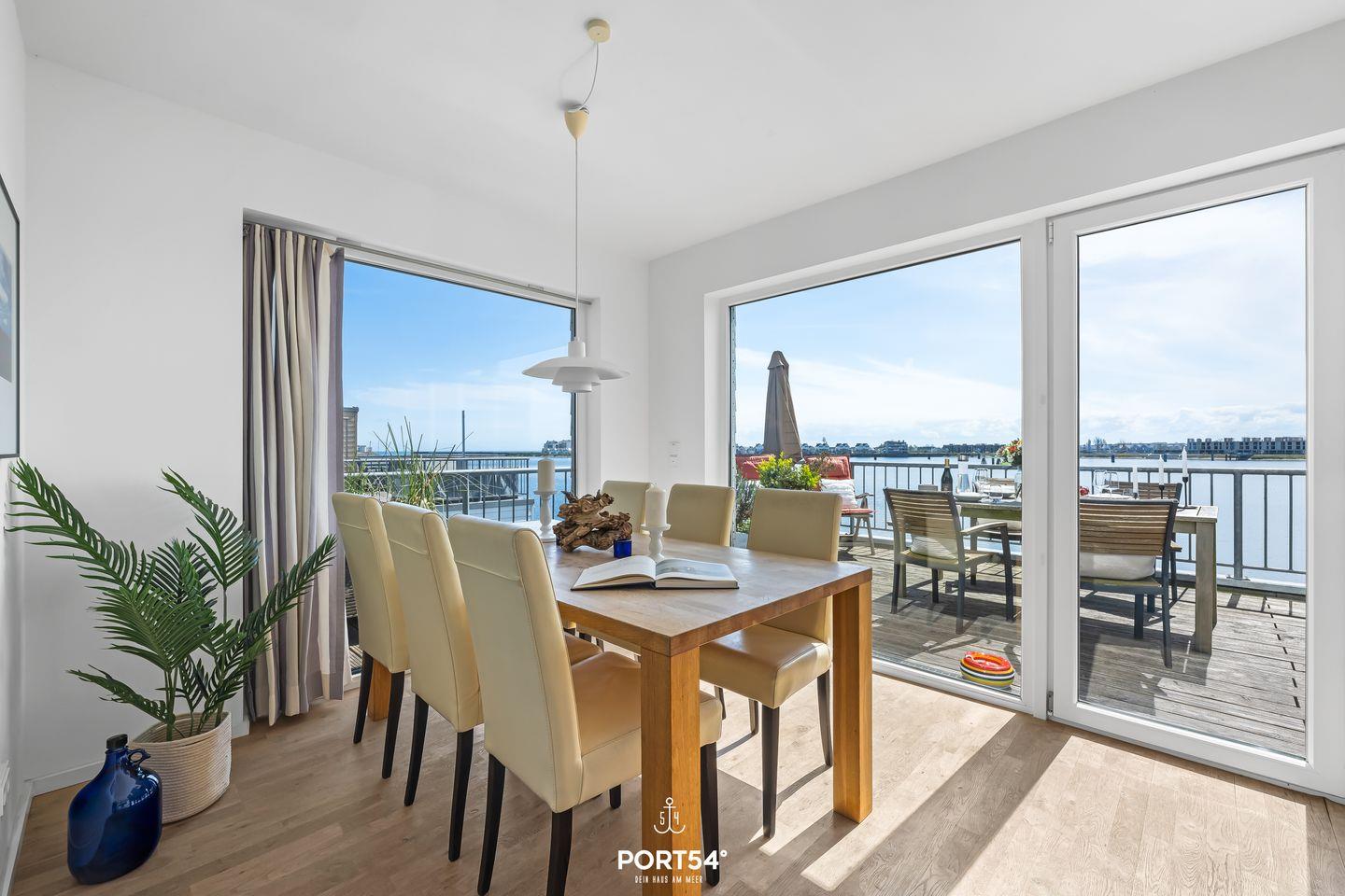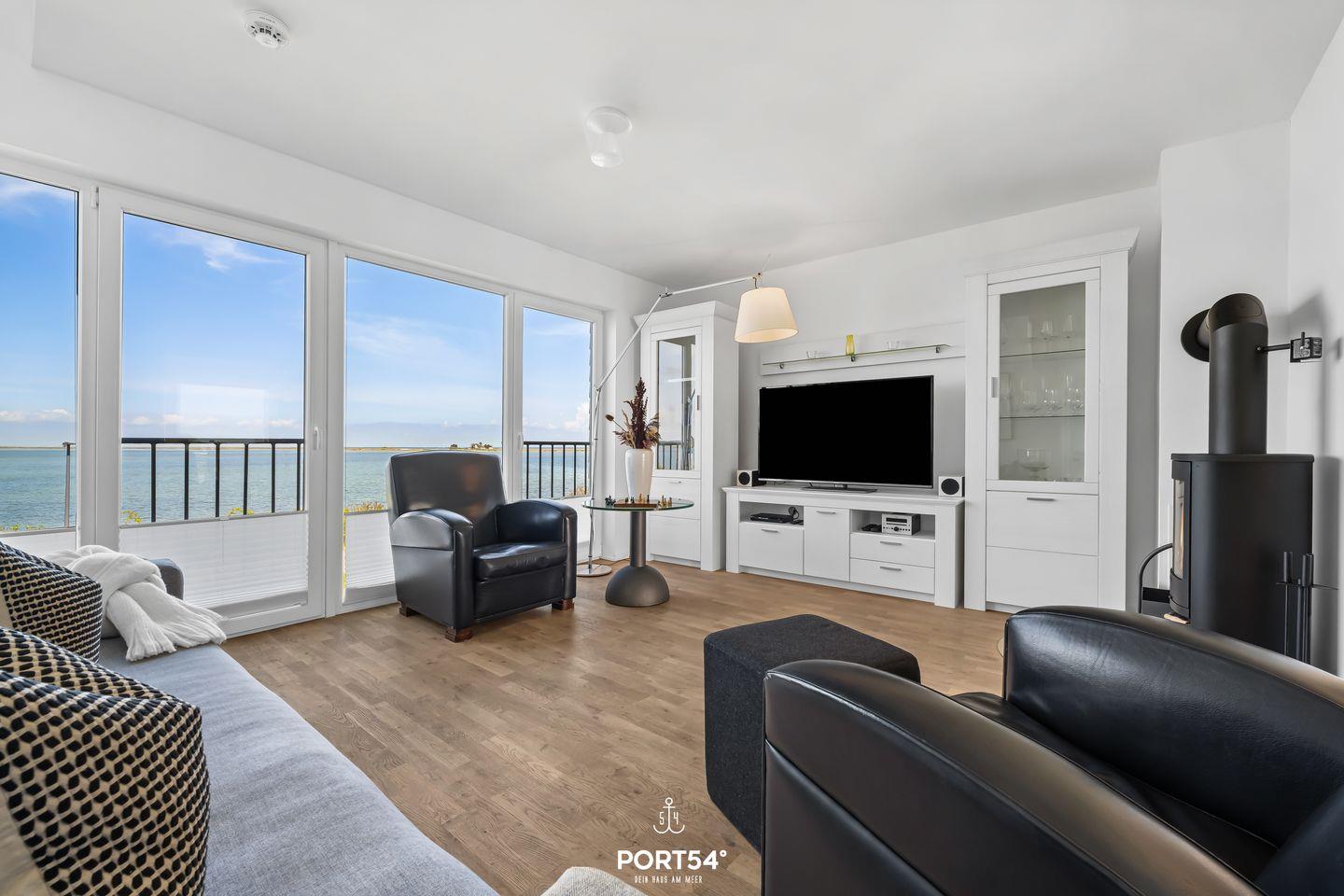 Die Ferienwohnung "Durchblick" bietet auf 97m² Platz für bis zu fünf Personen und liegt in erster Reihe am Wasser. Im ersten Obergeschoss befinden sich eine voll ausgestattete Küche mit Essbereich, ein Balkon mit Hafenblick, ein Duschbad sowie der Wohnbereich mit TV und Kaminofen. Eine Treppe führt in die zwei Schlafzimmer im zweiten Obergeschoss. Highlight ist das Wellnessbad mit Whirlpool und Infrarotkabine. Ein Schlafsofa und ein kostenloser PKW-Stellplatz ergänzen das Angebot.