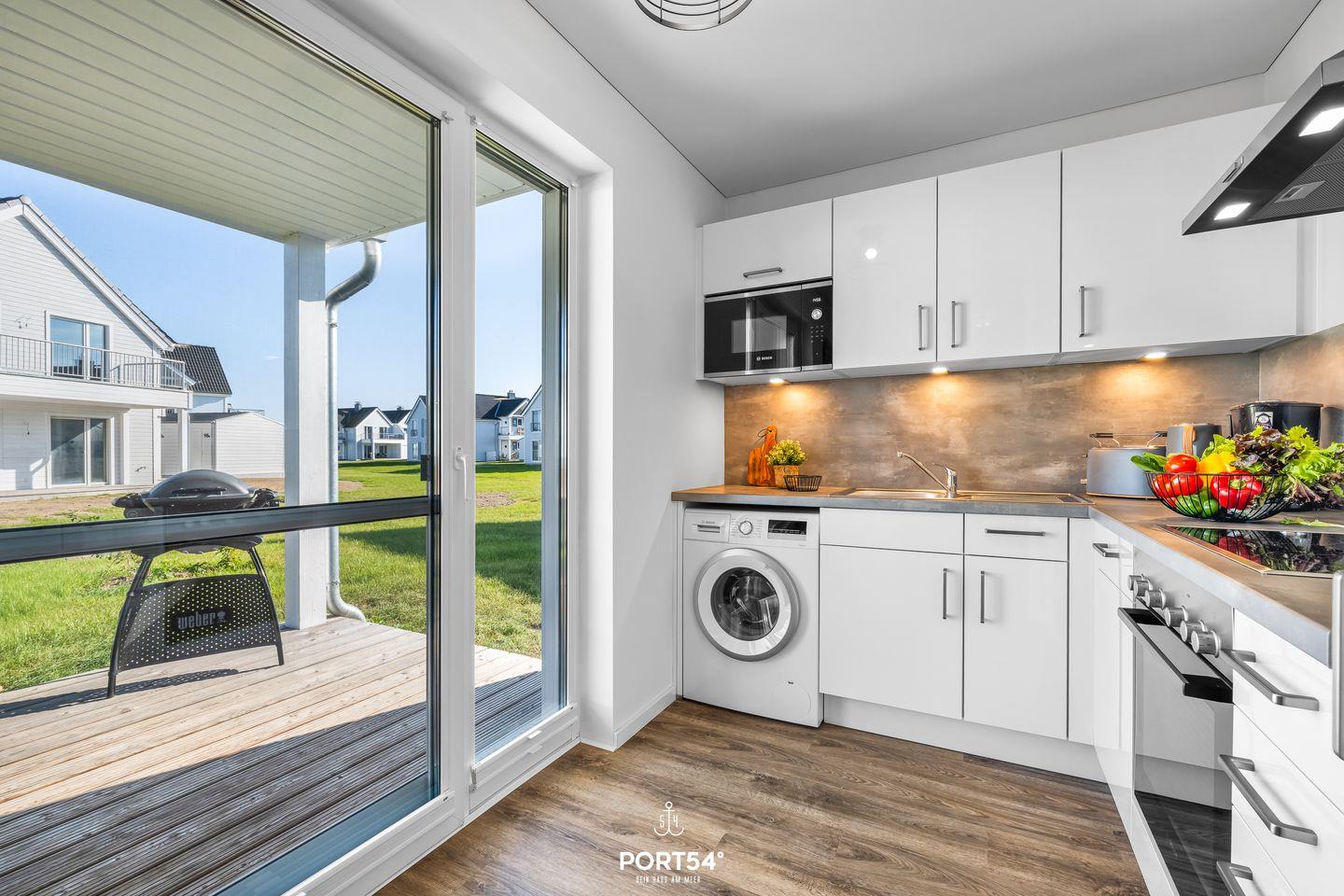 Im lichtdurchfluteten Wohnbereich kannst Du Deine Abende gemütlich auf dem Sofa vor dem Flachbild-Fernseher ausklingen lassen, während der Kamin für angenehme Wärme und Gemütlichkeit sorgt. Angrenzend befindet sich eine voll ausgestattete Küche mit Waffeleisen, Mikrowelle und Toaster, in der auch eine Waschmaschine untergebracht ist. Dein Frühstück kannst Du am großzügigen Esstisch oder auf der Terrasse genießen. Die Terrasse ist überdacht und mit bequemen Gartenmöbeln sowie einem Elektrogrill ausgestattet.