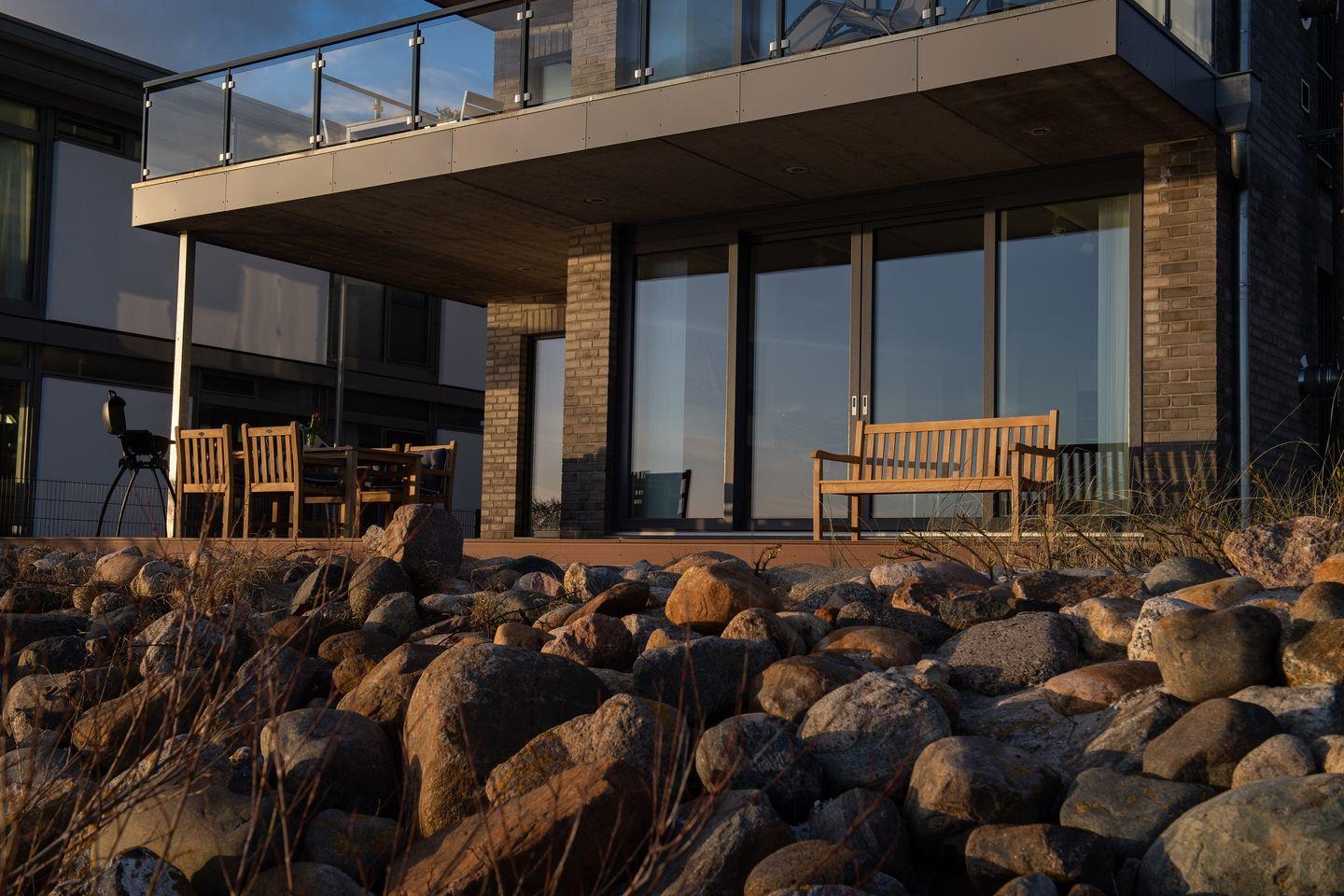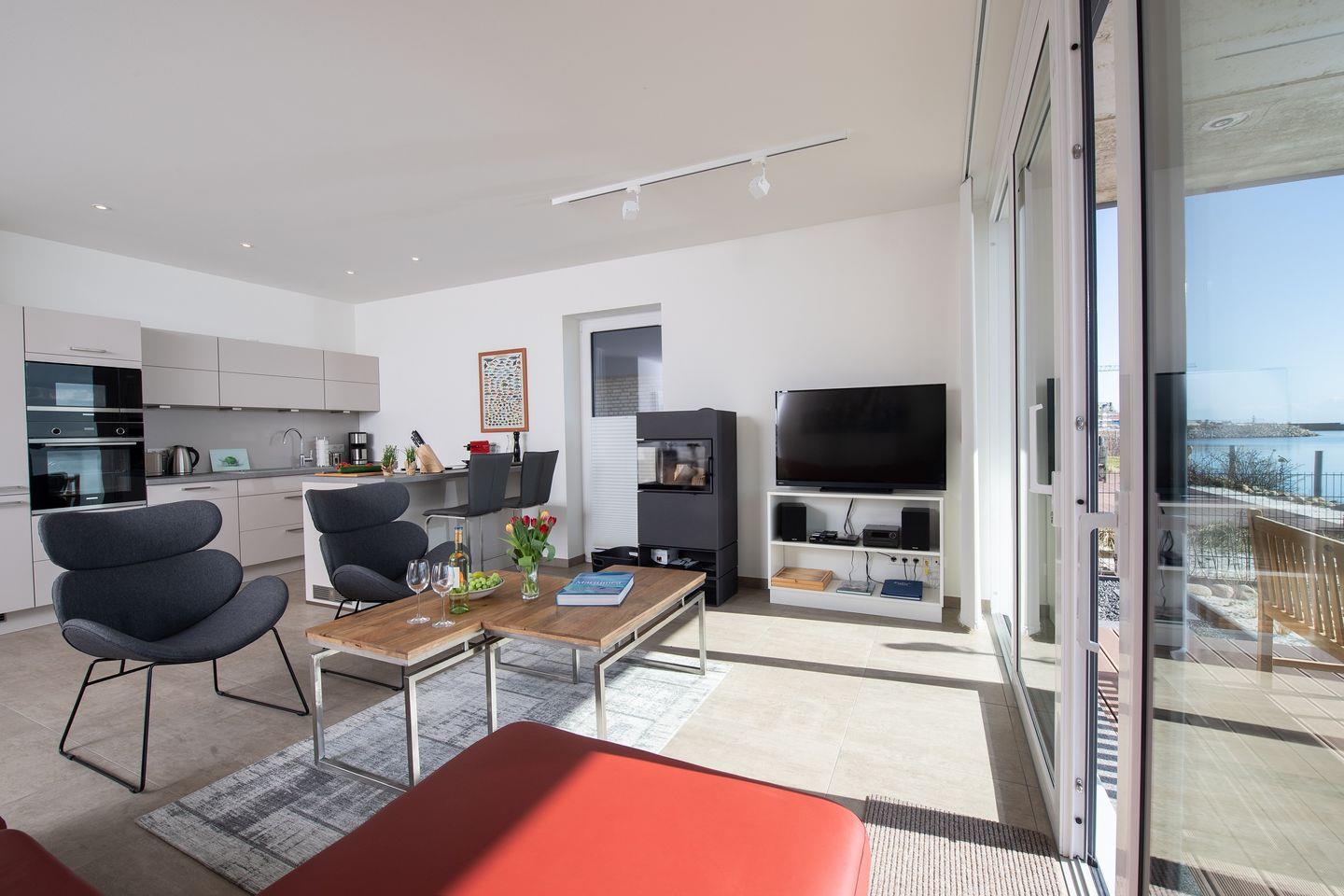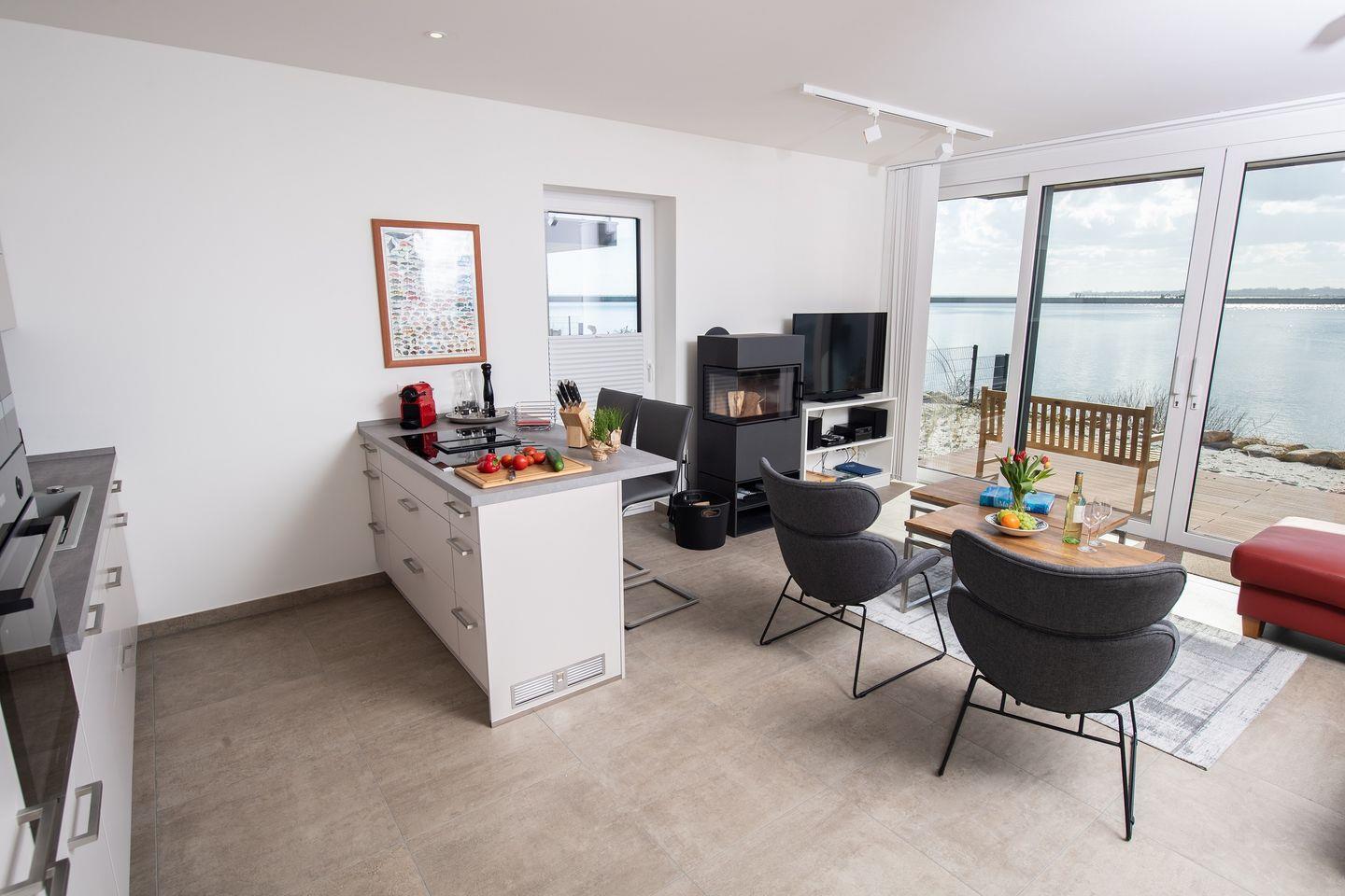 Entdecken Sie die Ferienwohnung "Dock 76 Main" für eine unvergessliche Auszeit. Diese gemütliche und moderne Ferienwohnung erstreckt sich über 86m² und bietet Platz für bis zu vier Gäste. Mit zwei geschmackvoll eingerichteten Schlafzimmern, die sowohl für Paare als auch für Familien ideal sind, können Sie entspannt die Zeit miteinander genießen. Die Wohnung befindet sich im Parterre und besticht durch ihren offenen Wohnbereich, der mit einer voll ausgestatteten Küche, einem komfortablen Essbereich und einem einladenden Wohnzimmer ausgestattet ist. Hier können Sie nach einem erlebnisreichen Tag am Strand bei einem gemeinsamen Abendessen oder einem Filmabend auf einem der drei Flachbild-TVs entspannen. Für gesellige Abende steht Ihnen ein Kaminofen zur Verfügung, der für eine gemütliche Atmosphäre sorgt. Ein Highlight der Ferienwohnung ist die großzügige, überdachte Terrasse, auf der Sie beim Frühstück im Freien den Blick auf die Ostsee genießen können. Die Terrasse ist mit Gartenmöbeln und Sonnenliegen ausgestattet, ideal für entspannte Stunden im Freien. Der direkt angrenzende Garten lädt zum Verweilen, Spielen oder Grillen ein – ein Elektrogrill steht Ihnen zur Verfügung, um unter freiem Himmel kulinarische Köstlichkeiten zuzubereiten. Nur 50 Meter entfernt liegt der schimmernde Sandstrand, der zum Schwimmen und Sonnenbaden einlädt. Die unmittelbare Nähe zum Wasser eignet sich hervorragend für romantische Spaziergänge am Strand. Die Ferienwohnung "Dock 76 Main" ist kinderfreundlich ausgestattet mit einem Hochstuhl sowie einem Babybett, sodass sich auch die kleinen Gäste wohlfühlen werden. Damit es Ihnen während Ihres Aufenthalts an nichts fehlt, stehen eine Waschmaschine, sowie eine voll ausgestattete Küche mit modernen Geräten, inklusive einer Spülmaschine und einer Nespresso-Maschine für Sie bereit. Ein Parkplatz mit einer E-Ladestation befindet sich vor der Unterkunft.