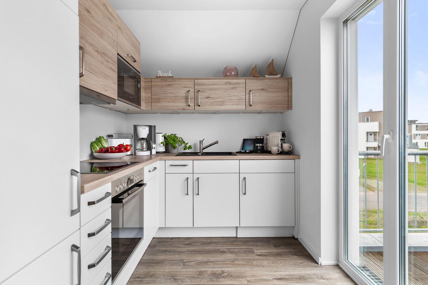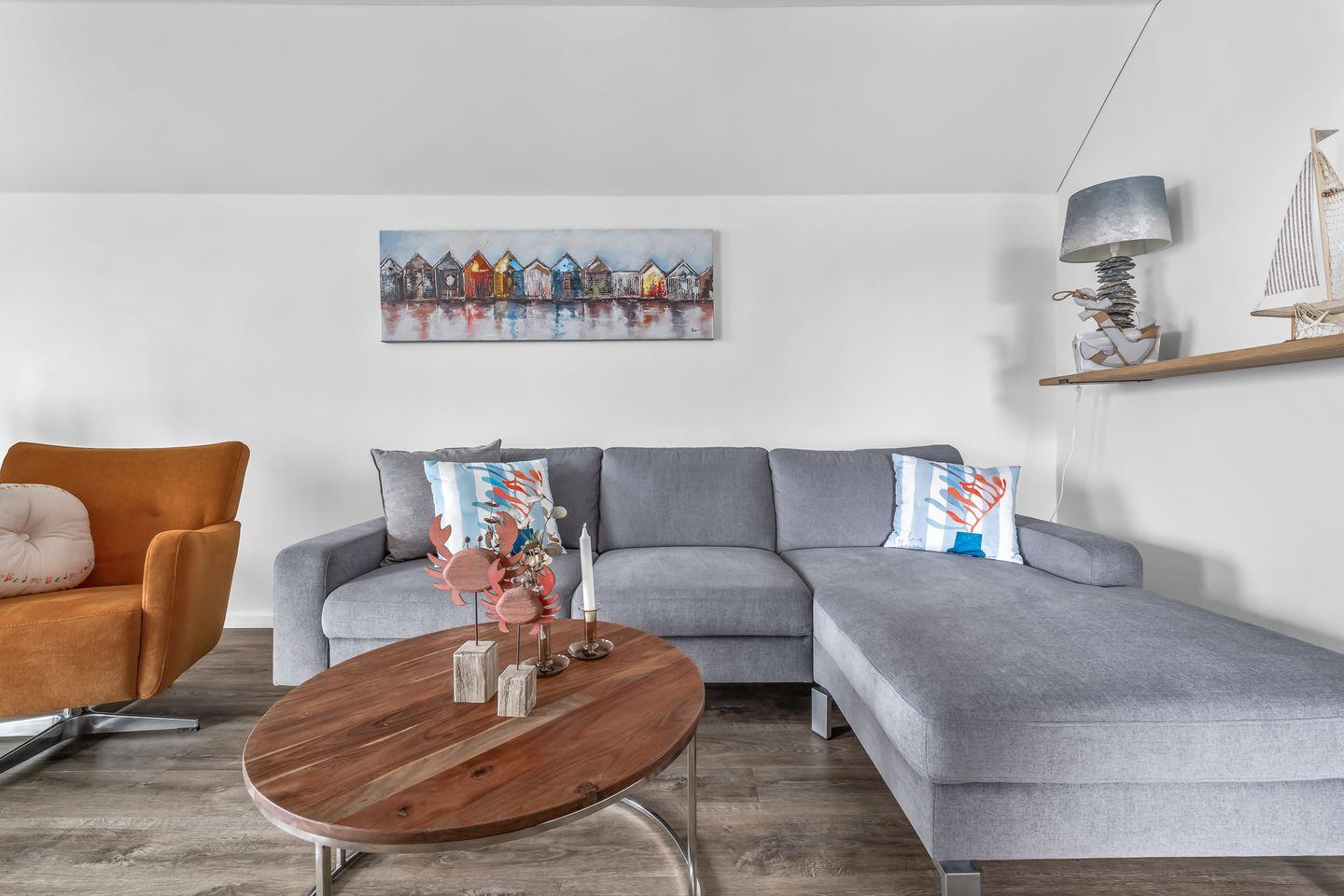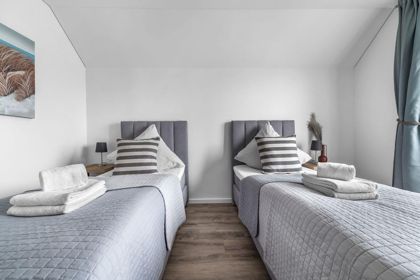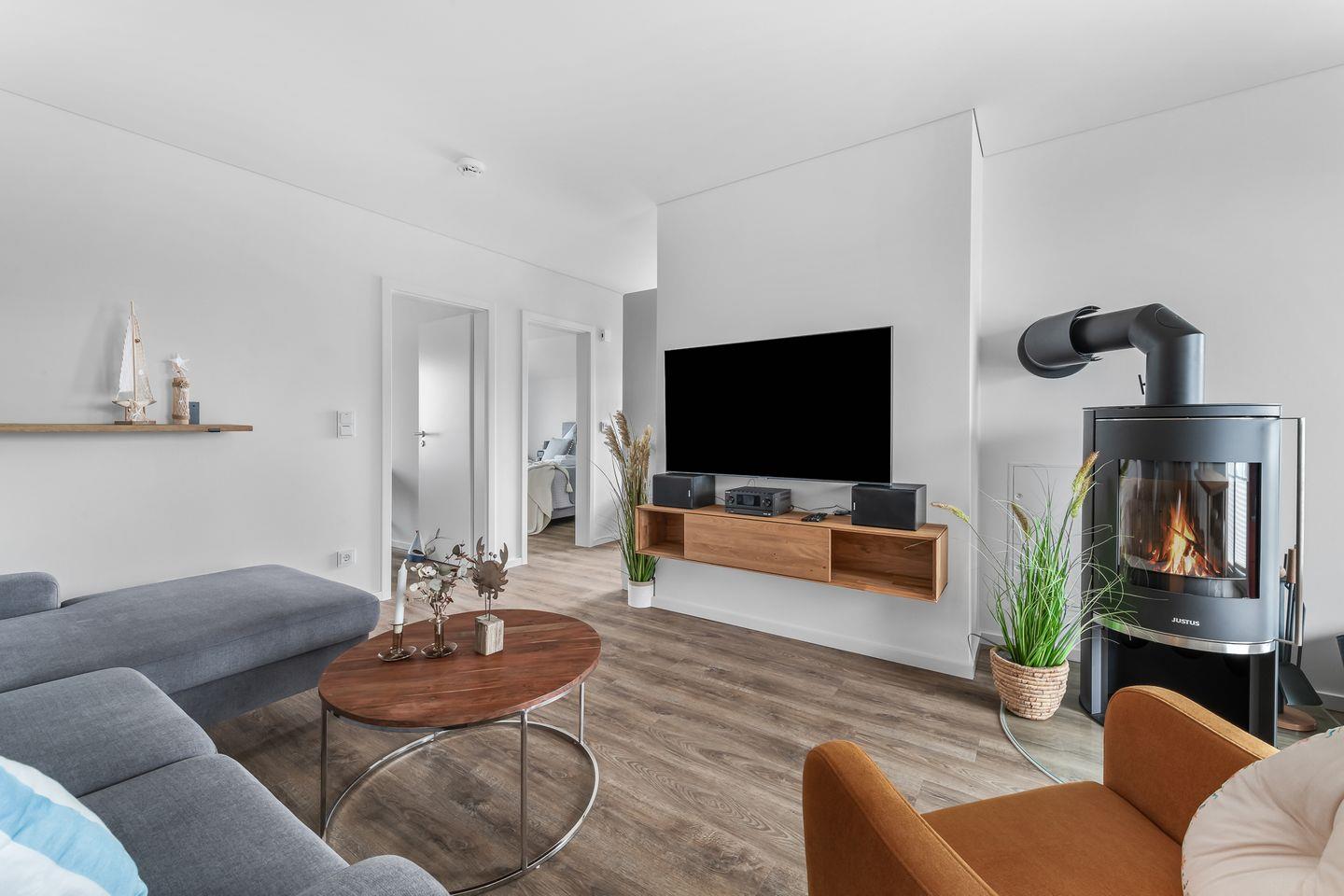 Eintreten und wohlfühlen. Diese Ferienwohnung bietet Platz für bis zu 4 Personen. "Sunset Suite" ist modern, stilvoll und sehr gemütlich, sie besticht durch zeitlose Eleganz und wurde mit viel Liebe zum Detail eingerichtet. Neben zwei Schlafzimmern, einem hellen und freundlichen Bad mit Infrarot-Sauna, einem sehr ansprechenden Wohn- und Essbereich, sowie einer vollausgestatteten Küche, bietet diese im Obergeschoss gelegene Wohnung einen voll möblierten Balkon. Das Wohnzimmer ist mit einer großzügigen Wohnlandschaft und einem großen Multimedia-Smart-TV eingerichtet - hyggelige Abende sind garantiert. Kostenfreies WLAN und Magenta-TV stehen Ihnen ebenfalls zur Verfügung. An kühleren Tagen sorgt ein Kaminofen für eine wohlige Wärme. In beiden Schlafzimmern finden Sie hochwertige Boxspringbetten. In einem Schlafzimmer befindet sich ein Doppelbett (180x200cm) und in dem anderen sind zwei Einzelbetten (90x200cm), die Sie jederzeit zu einem Doppelbett zusammenschieben können. Auch verfügen beide Schlafzimmer über Multimedia-Smart-TVs und einen Kleiderschrank. Verdunklungsmöglichkeiten sowie Fliegengitter ermöglichen Ihnen eine angenehme Nachtruhe. Die Küche ist von der Nespresso-Maschine über den Wasch-Trockner bis hin zur Spülmaschine mit allen erdenklichen, modernen Annehmlichkeiten ausgestattet. Kochen und backen machen hier wirklich Spaß. Das lichtdurchflutete Bad bietet Ihnen eine große, ebenerdige Dusche, einen Kosmetikspiegel, einen Föhn und einen Handtuchheizkörper. Für Wellnessfeeling sorgt die eingebaute Infrarot-Sauna mit Soundanlage. Der Balkon lädt zum Chillen ein und der hochwertige Elektrogrill lässt auch Grillfreunde auf Ihre Kosten kommen. Auf dem Balkon können Sie den Tag in Ruhe ausklingen lassen und die schönen Sonnenuntergänge im Strandkorb genießen. Für gesellige Abende mit Freunden oder der Familie steht Ihnen ein Elektro-Grill zur Verfügung. Für unsere kleinen Gäste stehen ein Kinderreisebett, ein Hochstuhl und ein Kindertritthocker bereit. Direkt vor der Unterkunft befinden sich 2 kostenfreie Parkplätze und ein abschließbarer Fahrradschuppen.