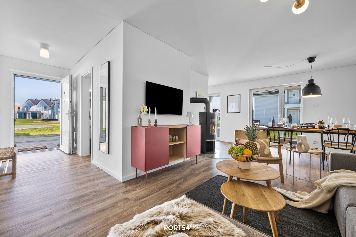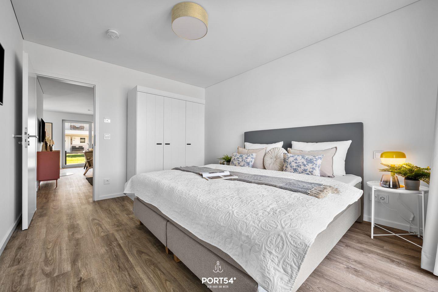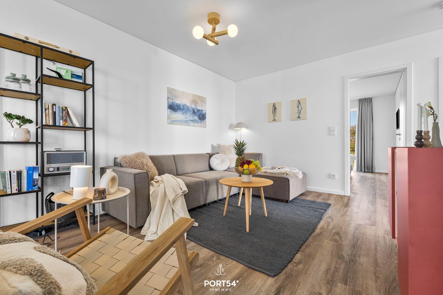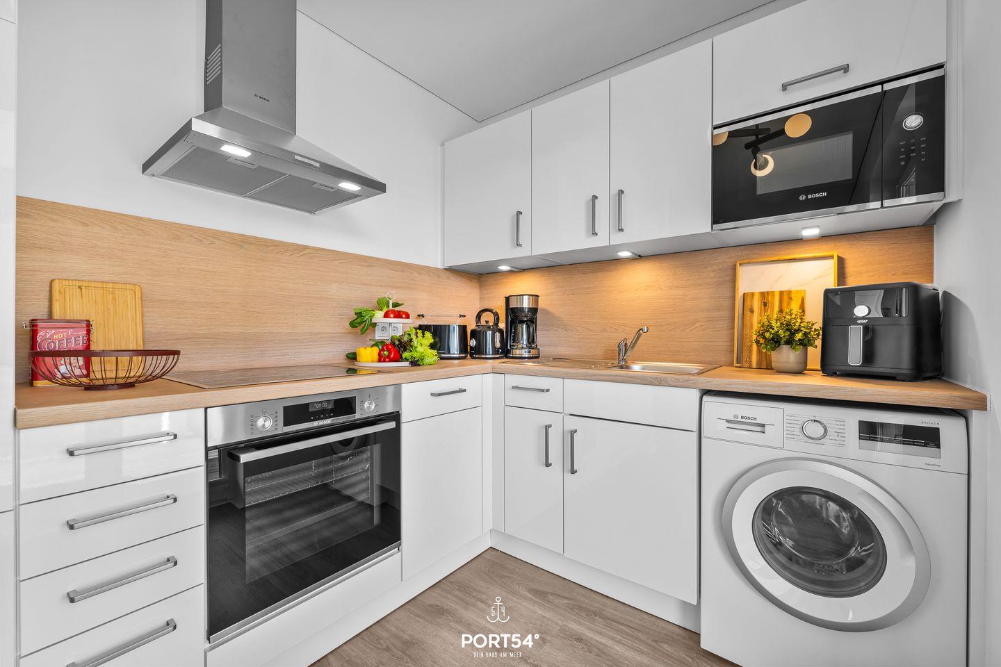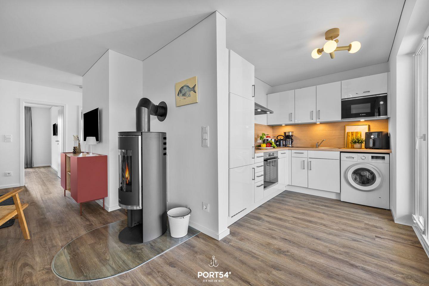 Die im Jahr 2025 fertiggestellte Unterkunft befindet sich im Erdgeschoss einer Ferienanlage und verfügt über drei Zimmer, die sich ideal für bis zu vier Personen eignen. Dank der geschickten Raumaufteilung findest Du hier beste Voraussetzungen für einen erholsamen Aufenthalt, egal ob Du als Familie, Paar oder kleine Reisegruppe anreist. Der offen gestaltete Wohn- und Essbereich bildet das Herzstück der Wohnung. Die hochwertige, moderne Einbauküche ist offen zum Wohnzimmer angelegt und lässt hinsichtlich Ausstattung keine Wünsche offen. Dir stehen ein Induktionsherd, ein Backofen, ein Kühlschrank mit integriertem Gefrierfach, eine Spülmaschine, eine Heißluftfritteuse, eine Mikrowelle, eine Kaffeemaschine, ein Wasserkocher, ein Toaster, ein Mixer sowie sämtliche Küchenutensilien und Geschirr zur Verfügung. Für gemeinsames Kochen und genussvolles Essen sorgt der Esstisch im Essbereich. Die Fußbodenheizung gewährleistet Dir auch in der kühleren Jahreszeit angenehme Temperaturen.