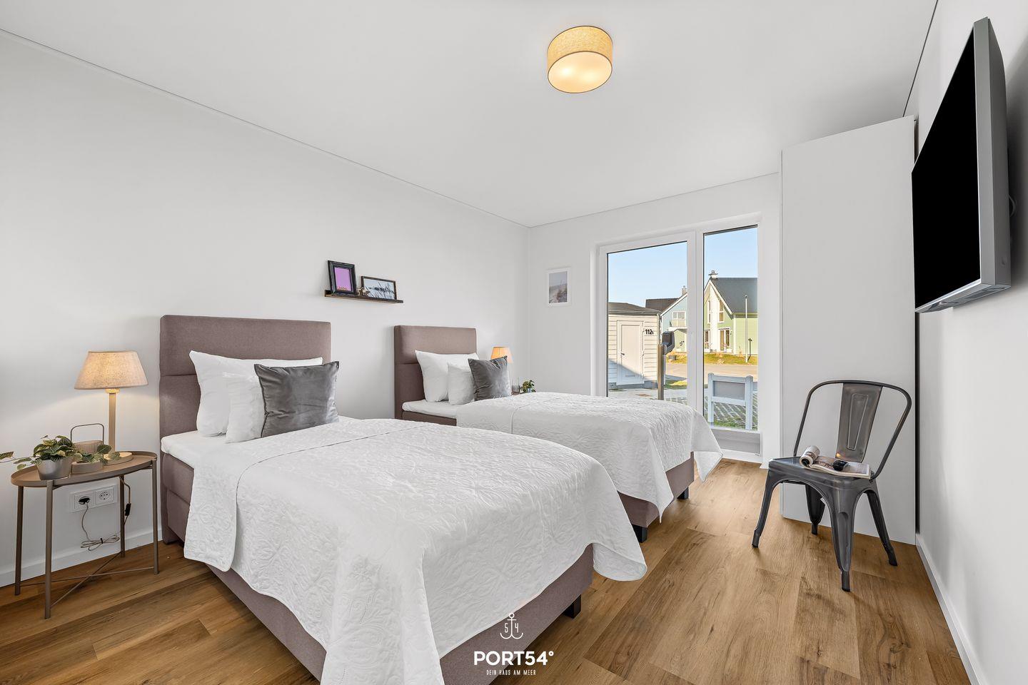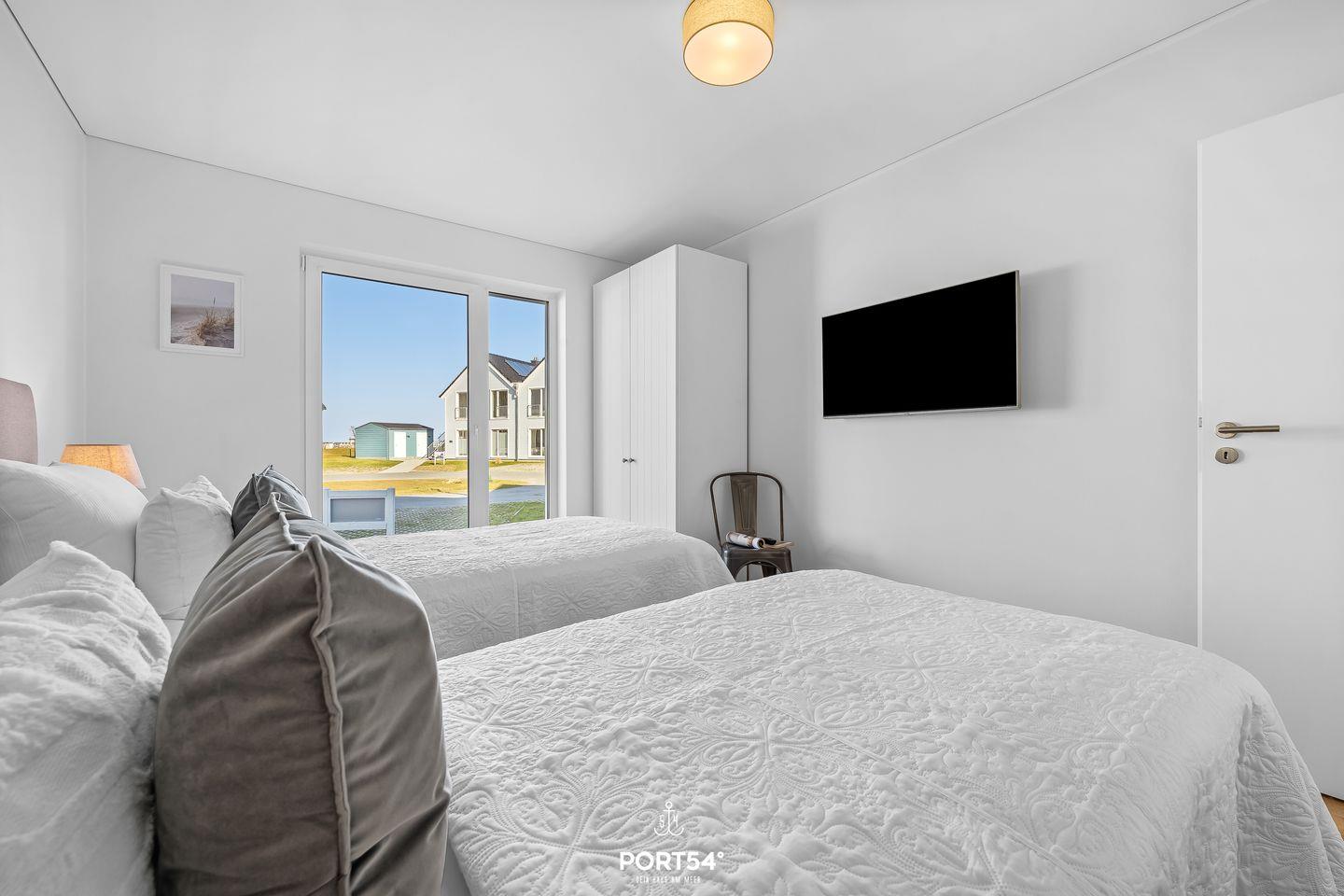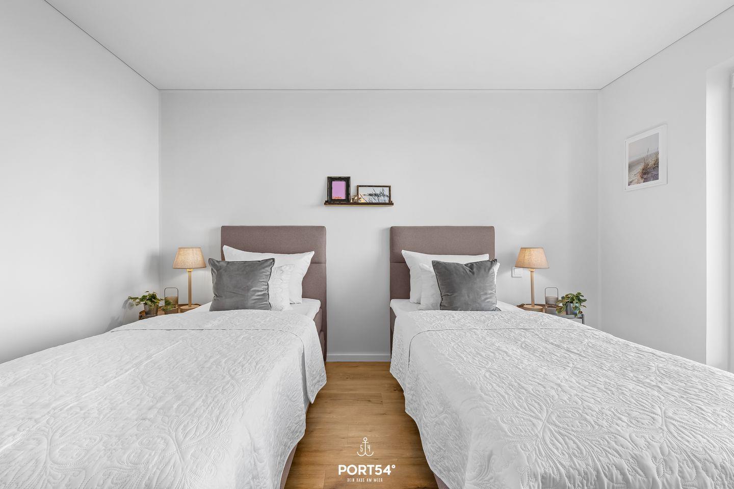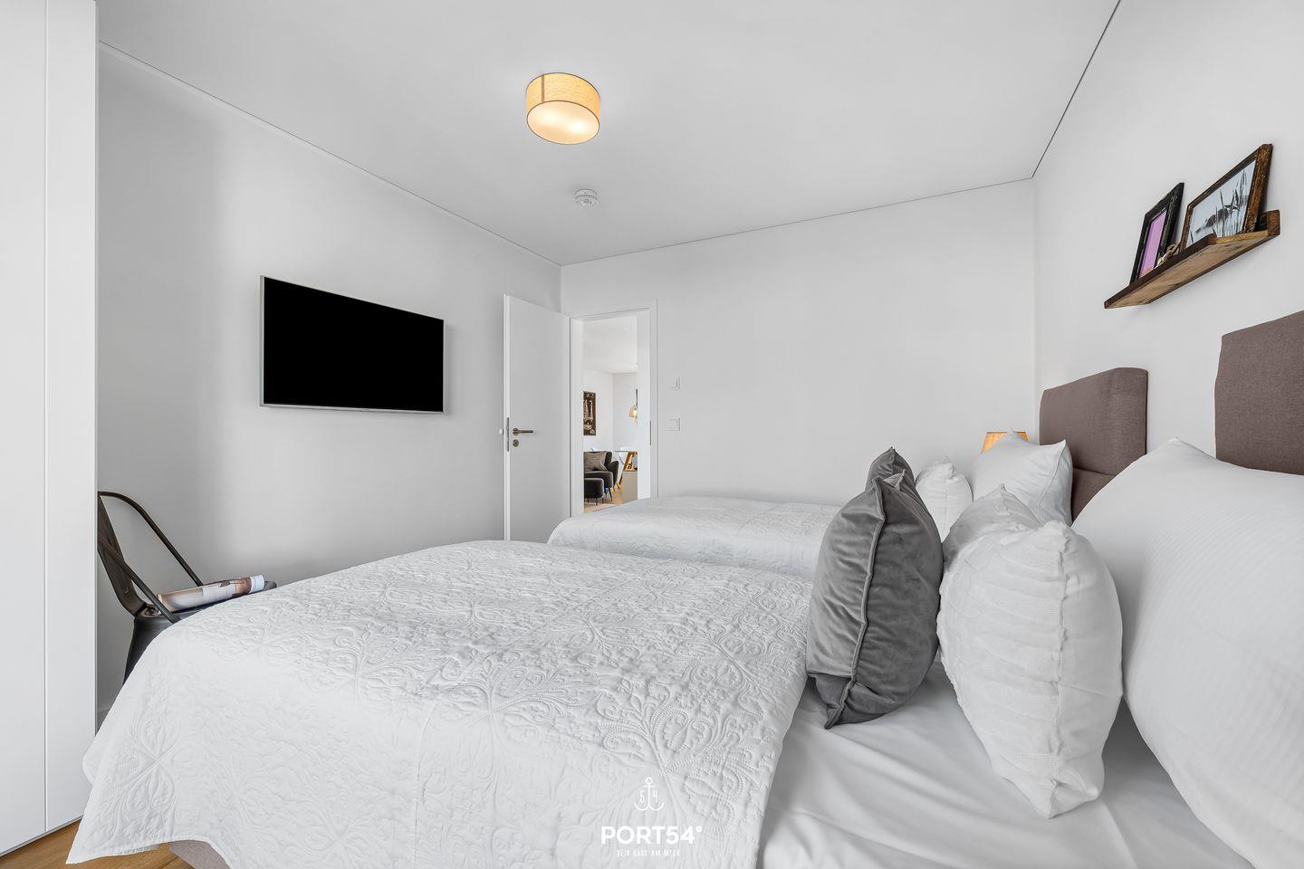 Die beiden Schlafzimmer sind hochwertig eingerichtet und sorgen für erholsame Ruhe nach einem ereignisreichen Strandtag. Das erste Schlafzimmer verfügt über ein komfortables Doppel-Boxspringbett (180 × 200 cm), das zweite über zwei hochwertige Einzel-Boxspringbetten (je 90 × 200 cm). Beide Zimmer sind mit einem Smart-TV und einem Kleiderschrank ausgestattet.