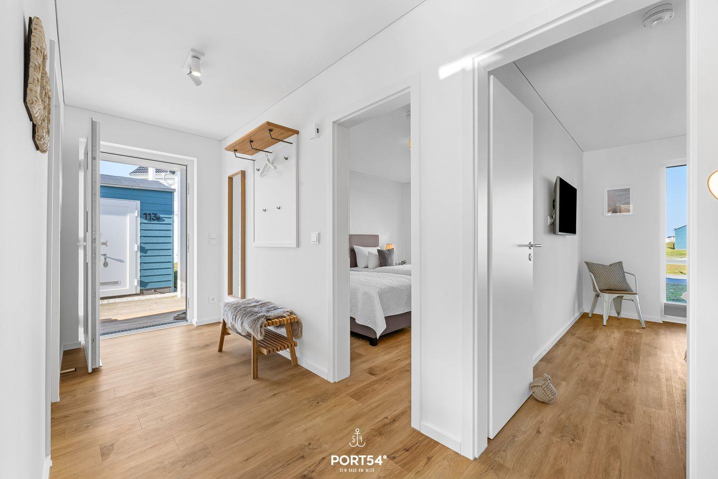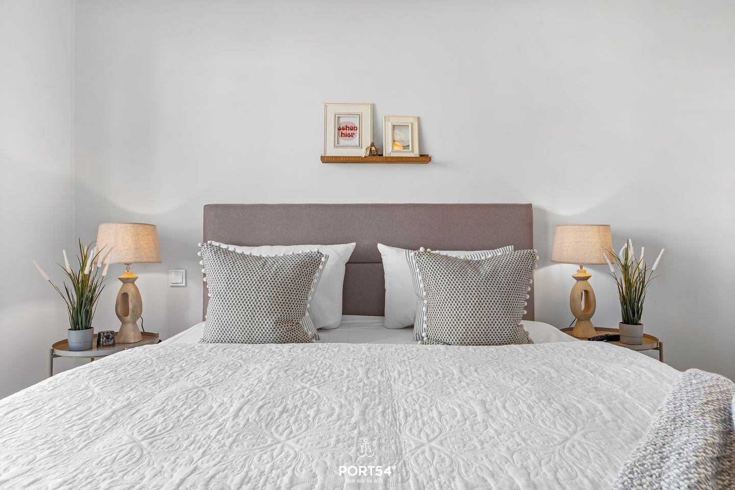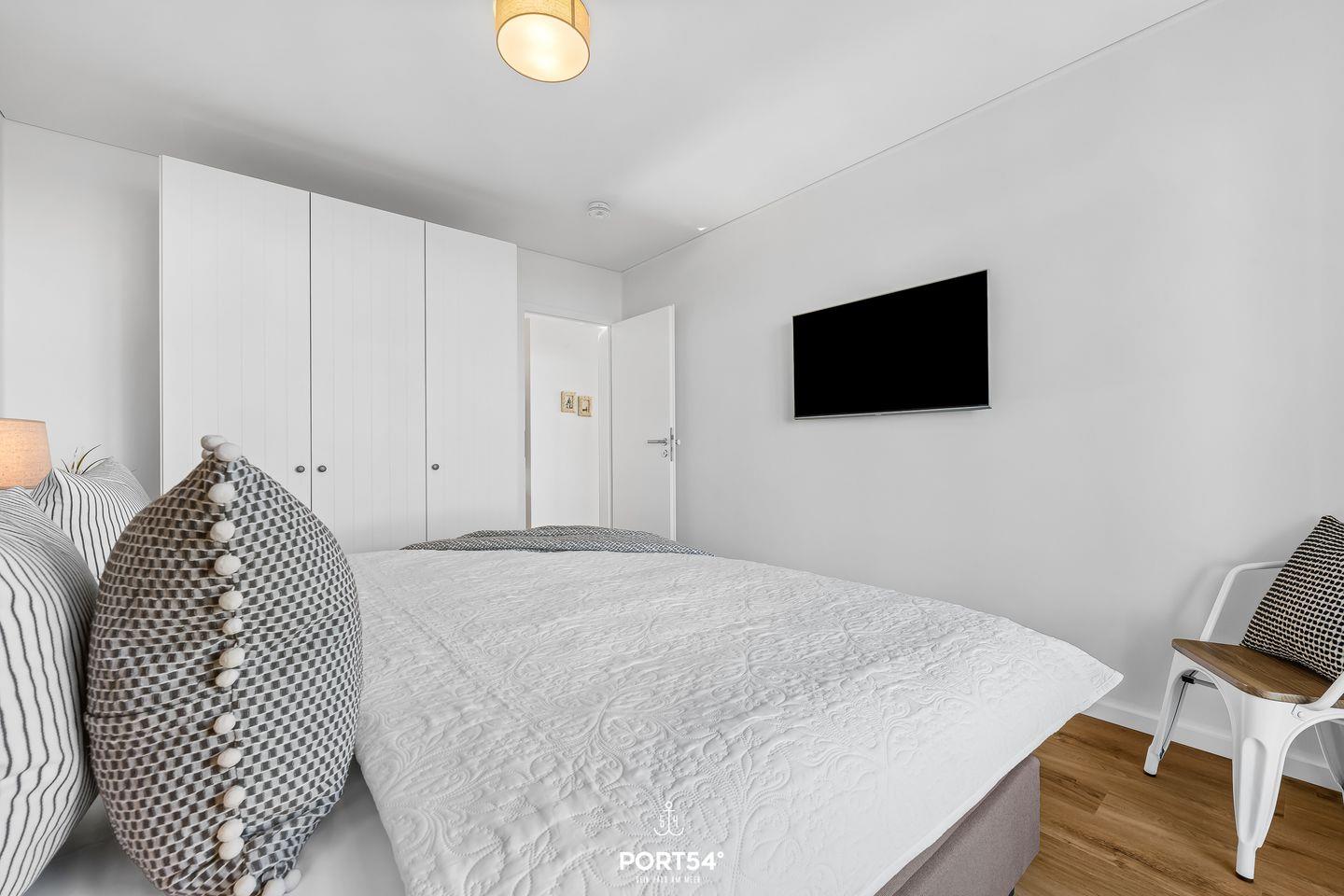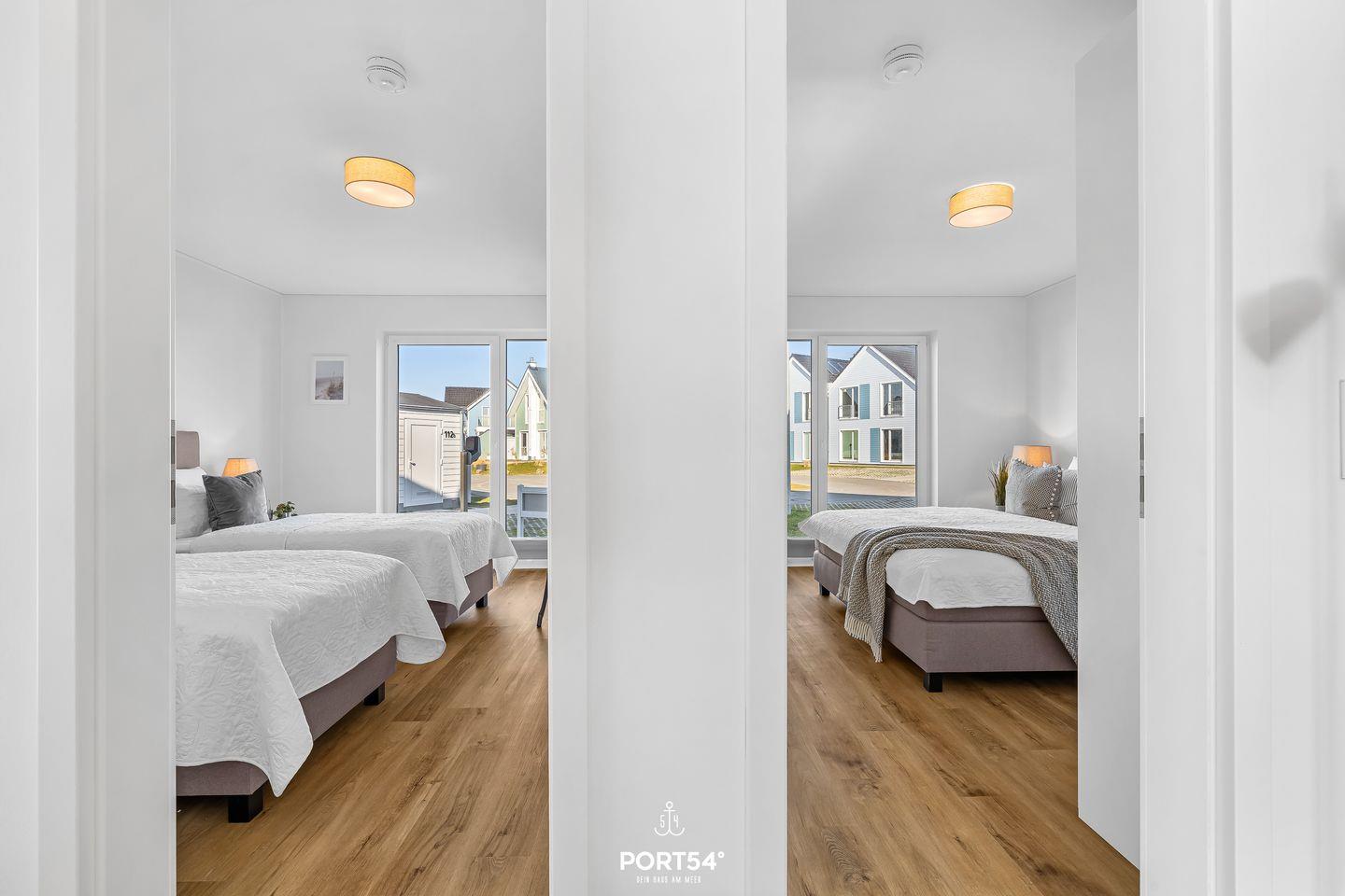 Die beiden Schlafzimmer sind hochwertig eingerichtet und sorgen für erholsame Ruhe nach einem ereignisreichen Strandtag. Das erste Schlafzimmer verfügt über ein komfortables Doppel-Boxspringbett (180 × 200 cm), das zweite über zwei hochwertige Einzel-Boxspringbetten (je 90 × 200 cm). Beide Zimmer sind mit einem Smart-TV und einem Kleiderschrank ausgestattet.
