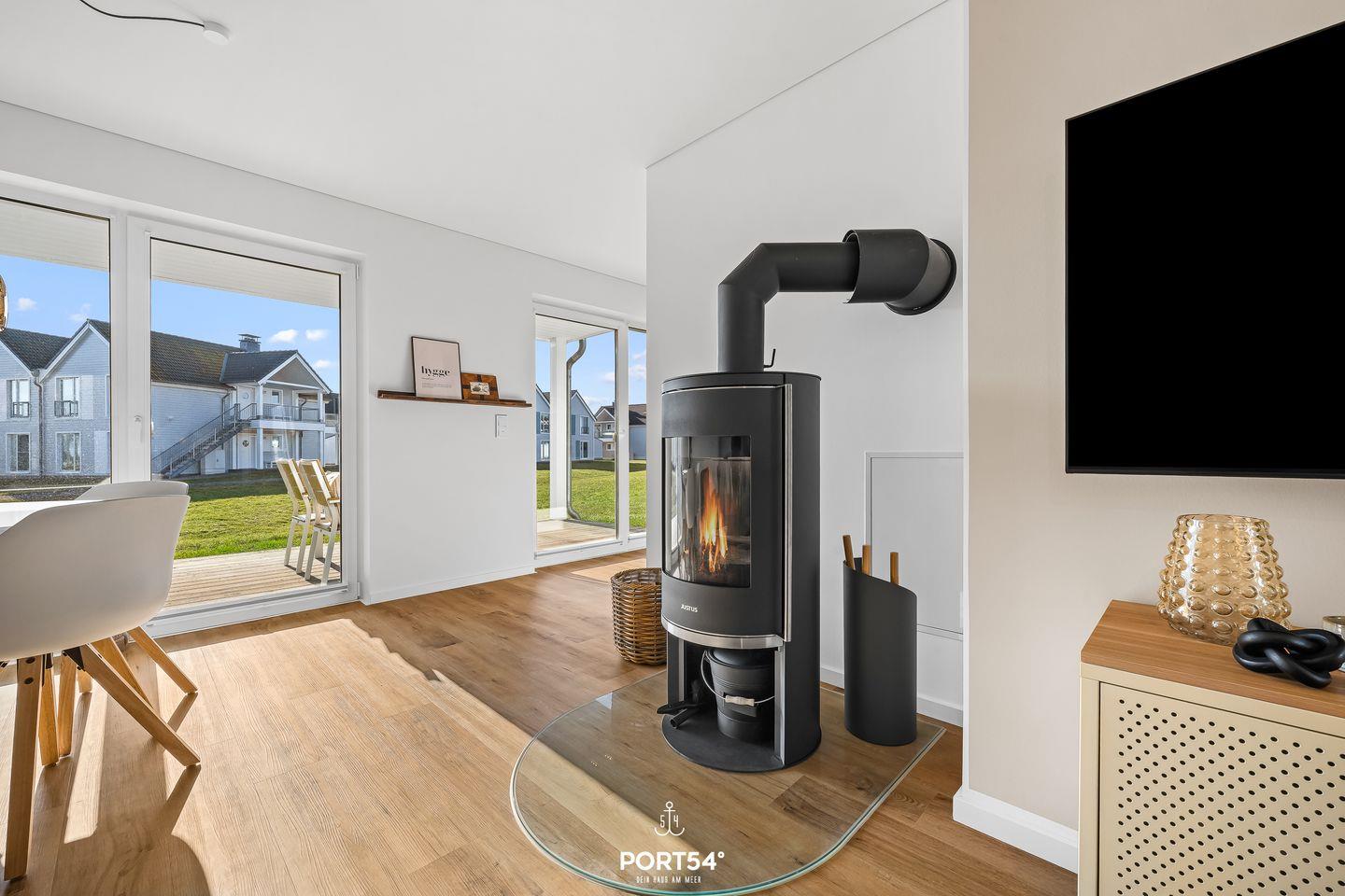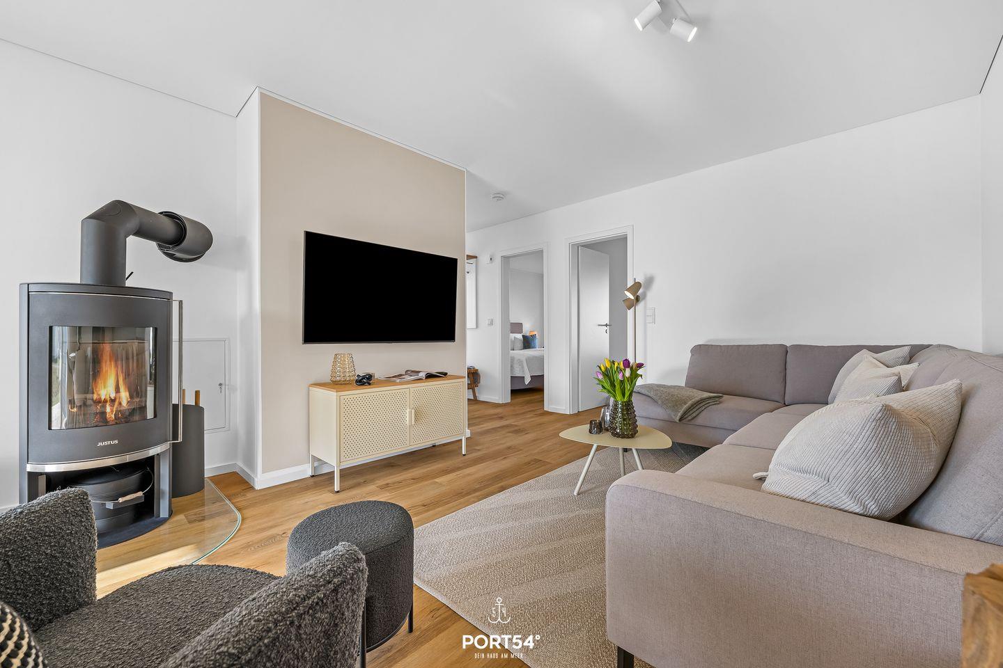 Das Herzstück des Raumes ist eine großzügige Sofalandschaft, auf der ihr gemeinsam entspannen könnt – sei es beim Lieblingsfilm auf dem Smart-TV oder beim Blick auf das knisternde Kaminfeuer.