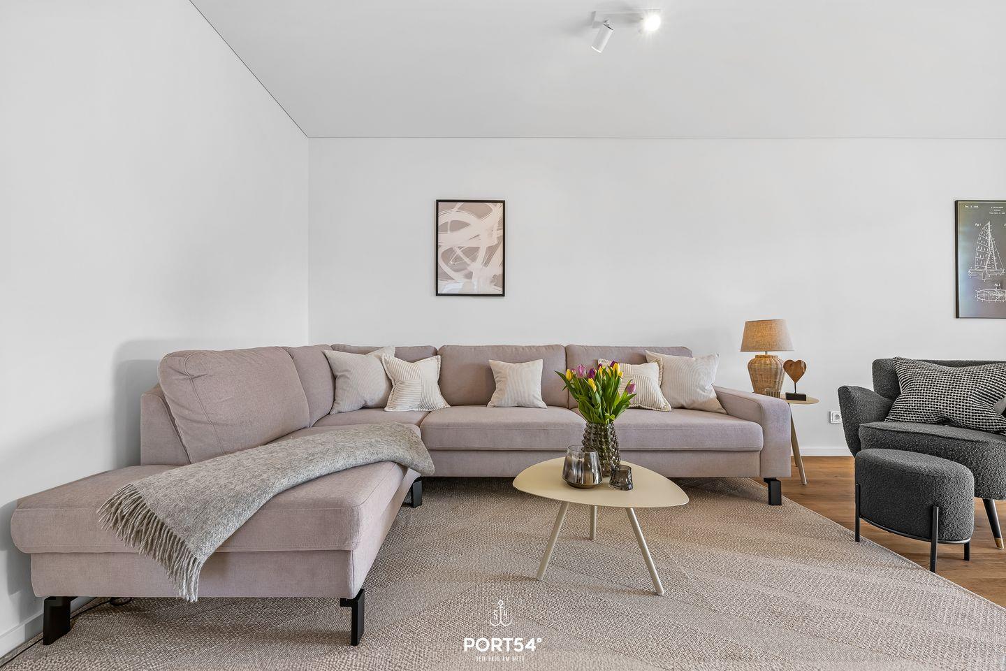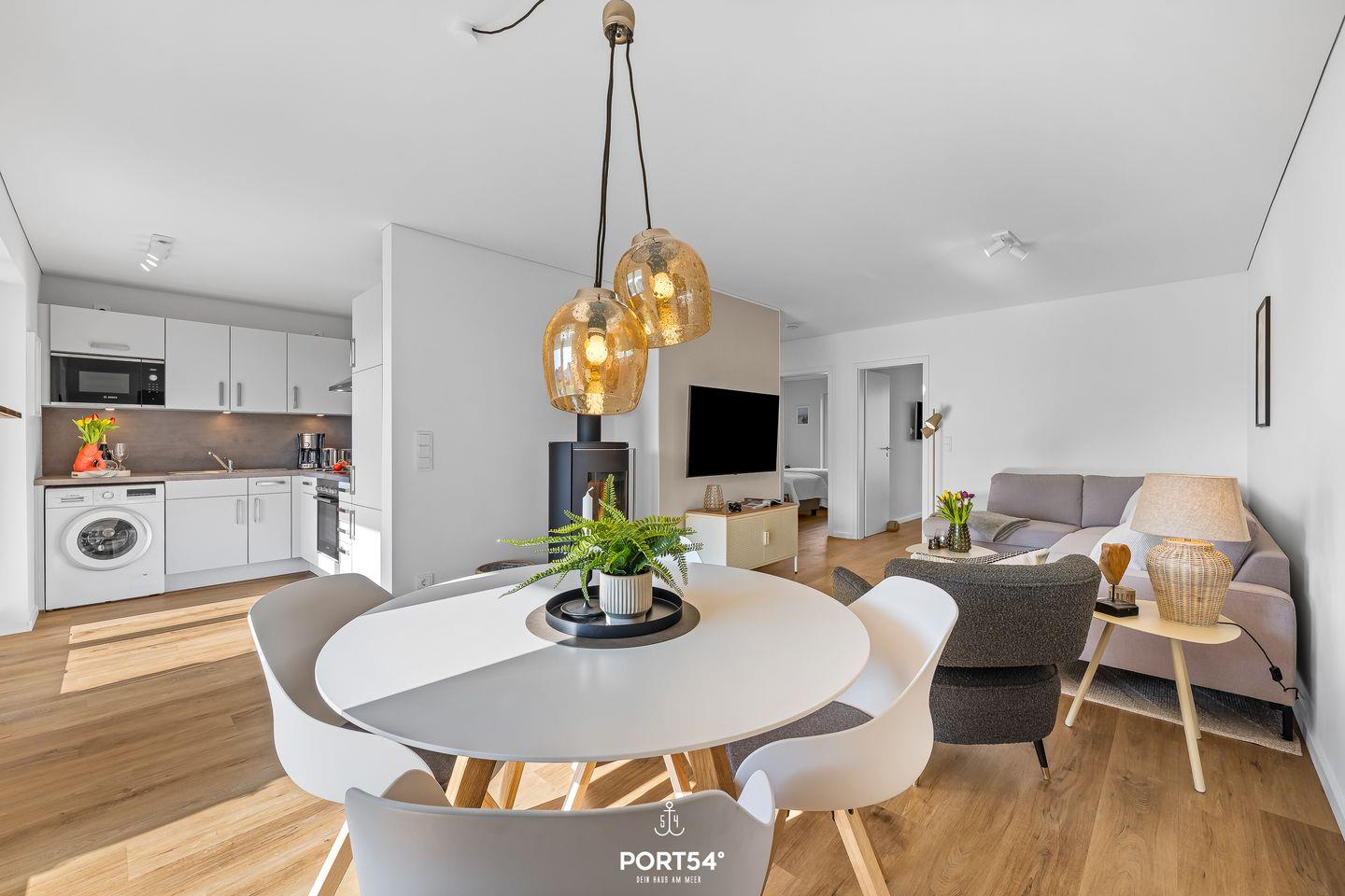 Beim Betreten der Wohnung „SalzWasserHerz" werdet ihr von einem gemütlichen, maritim und hochwertig eingerichteten Wohn- und Essbereich empfangen. Cozyness soll euch während eures gesamten Urlaubs begleiten.