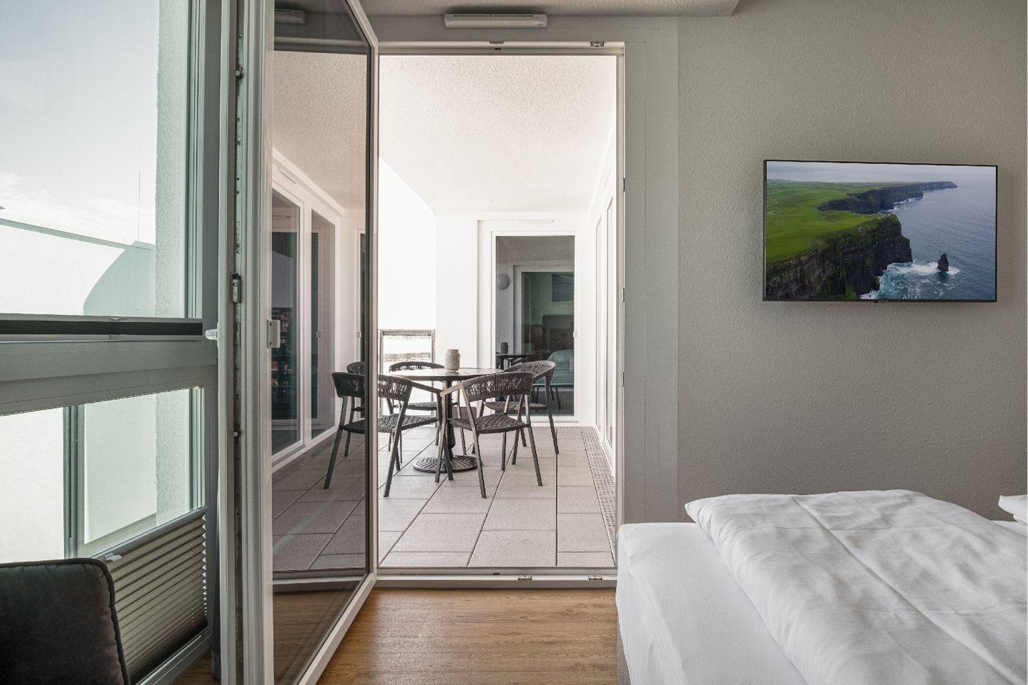 Für entspannte Stunden im Freien ist der Balkon mit Gartenmöbeln ausgestattet. Ein Elektrogrill steht Dir ebenfalls zur Verfügung, sodass Du gemeinsam grillen kannst, während Du den Meerblick genießt.