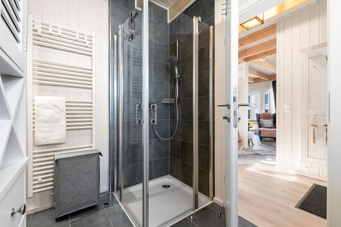 Die voll ausgestattete Küche bietet alles, was Sie für Selbstverpflegung benötigen. Zwei Badezimmer bieten zusätzlichen Komfort: eines mit ebenerdiger Dusche und Infrarotsauna, das andere mit Badewanne. Fußbodenheizung und ein Kaminofen schaffen das ganze Jahr über eine gemütliche und einladende Atmosphäre.
