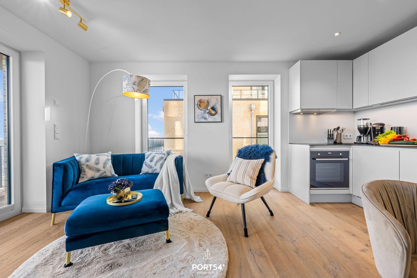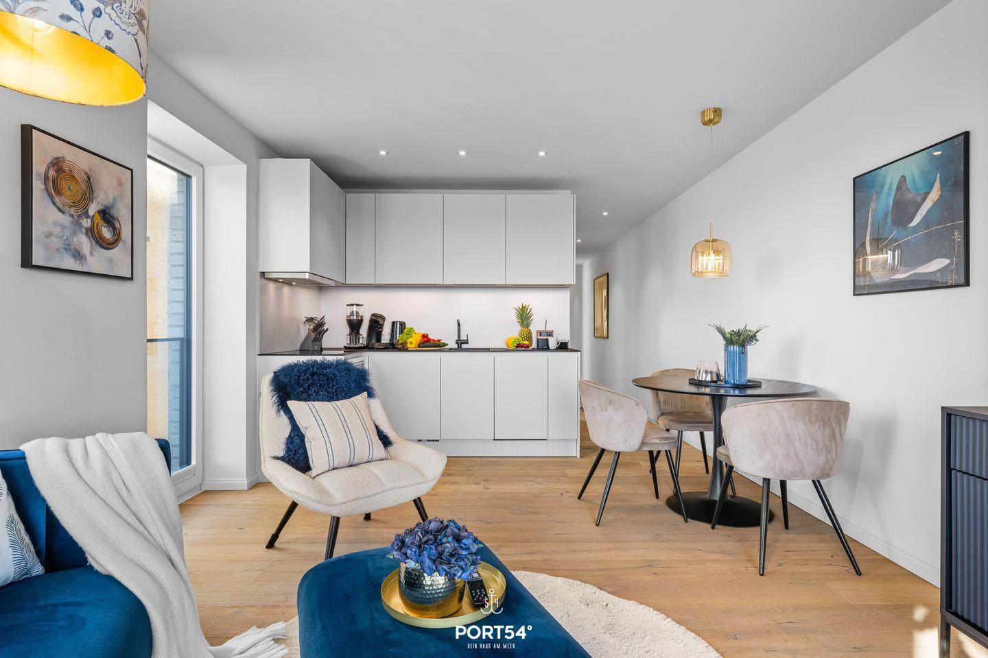 Direkt vor den bodentiefen Fenstern entfaltet sich ein atemberaubender Meerblick, der das gesamte Apartment mit natürlichem Licht durchflutet. Jeden Tag erwartet Sie ein phantastischer Blick auf die Ostsee – vom ersten Sonnenstrahl bis zum beruhigenden Sonnenuntergang. Der offene Wohn- und Essbereich ist der perfekte Ort, um den Tag zu genießen: Vom Kochen bis zum entspannten Verweilen bietet dieser Raum alles, was das Herz begehrt.