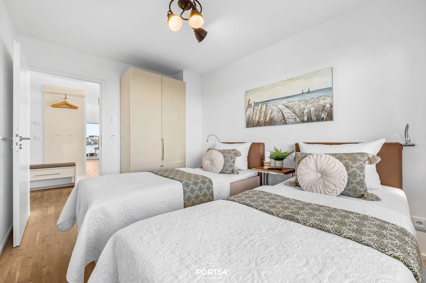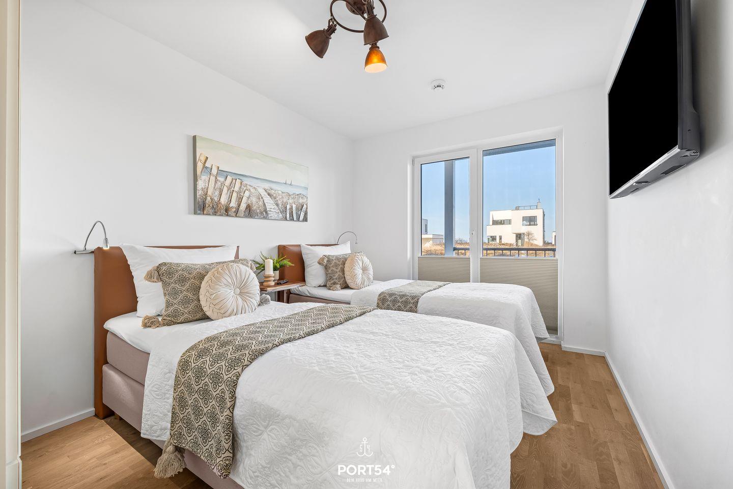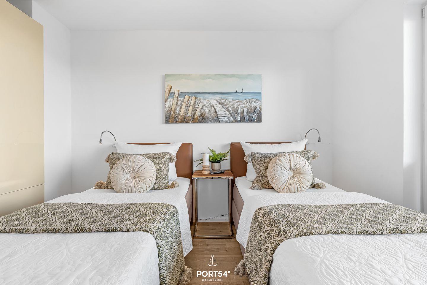Die moderne Wohnung liegt im Erdgeschoss eines Gebäudes im OstseeResort Olpenitz und ist ideal für Familien und Paare geeignet. Zwei komfortable Schlafzimmer und ein bequemes Schlafsofa bieten Dir Platz für bis zu sechs Gäste. Eines der Schlafzimmer bietet Dir ein Doppel-Boxspringbett (180x200?cm), das andere Schlafzimmer verfügt über 2 bequeme Einzel-Boxspringbetten (90x200?cm). Beide Schlafzimmer bieten Dir je einen Kleiderschrank, einen TV und Verdunkelungsmöglichkeiten, damit Du hier entspannte Stunden verbringen kannst. Für Familien stehen ein Babybett und ein Kinderhochstuhl bereit – Kinder jeden Alters sind bei Dir herzlich willkommen.