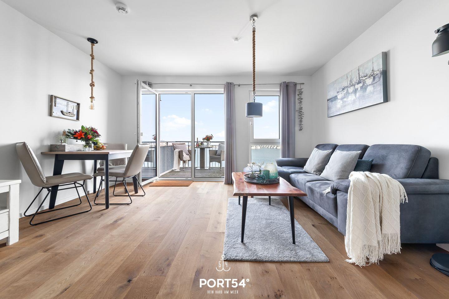 Das Appartement im zweiten Stock bietet Dir einen wunderschönen Blick auf das Meer und die maritime Umgebung – direkt vom Wohnzimmer und dem privaten Balkon aus.