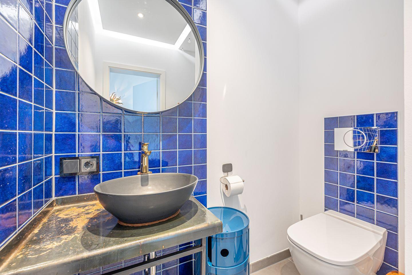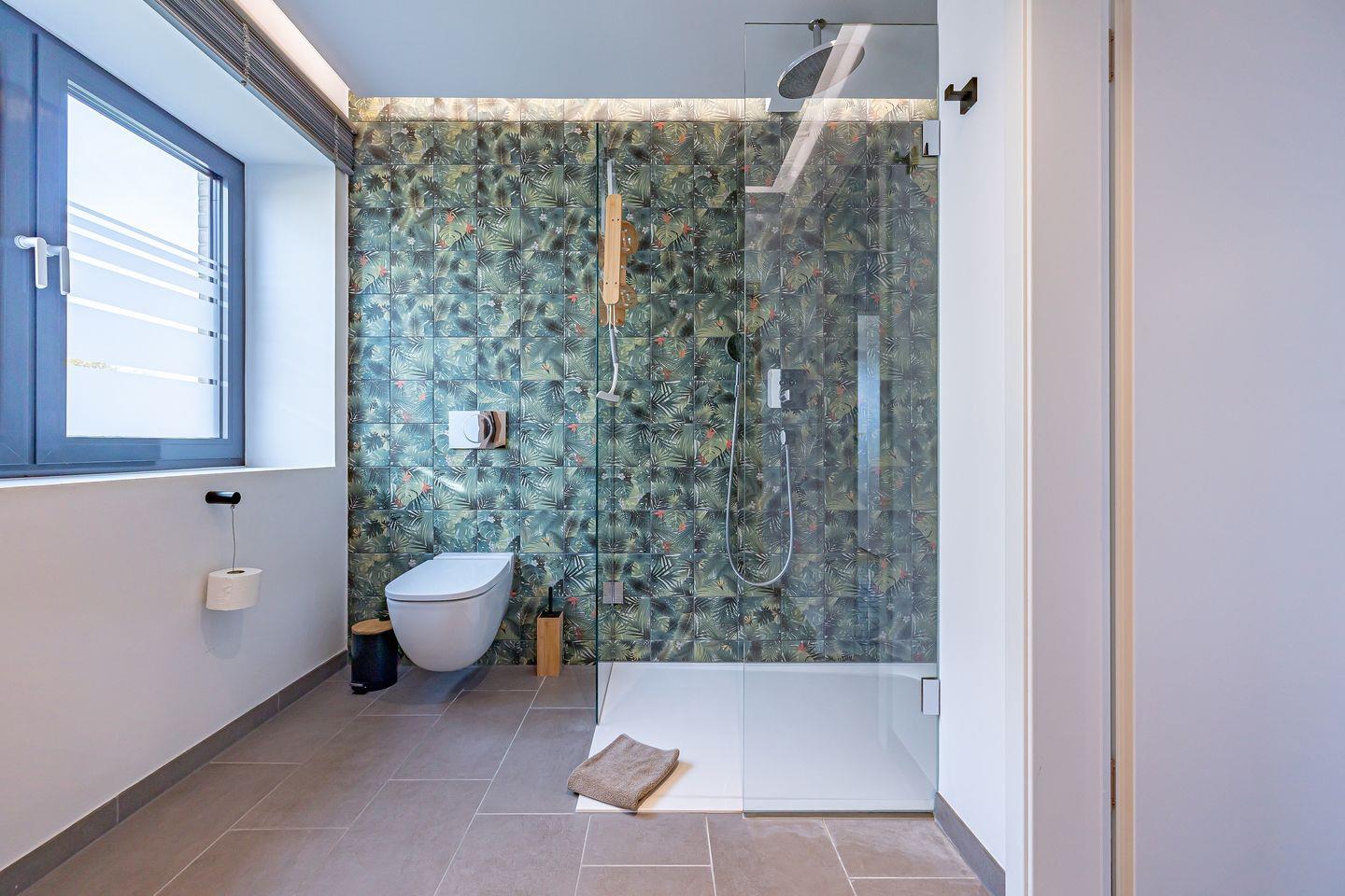 Im Tageslicht-Bad erwarten Dich eine bodengleiche Dusche, ein Föhn sowie ein Kosmetikspiegel, zudem ist ein separates Gäste-WC vorhanden.