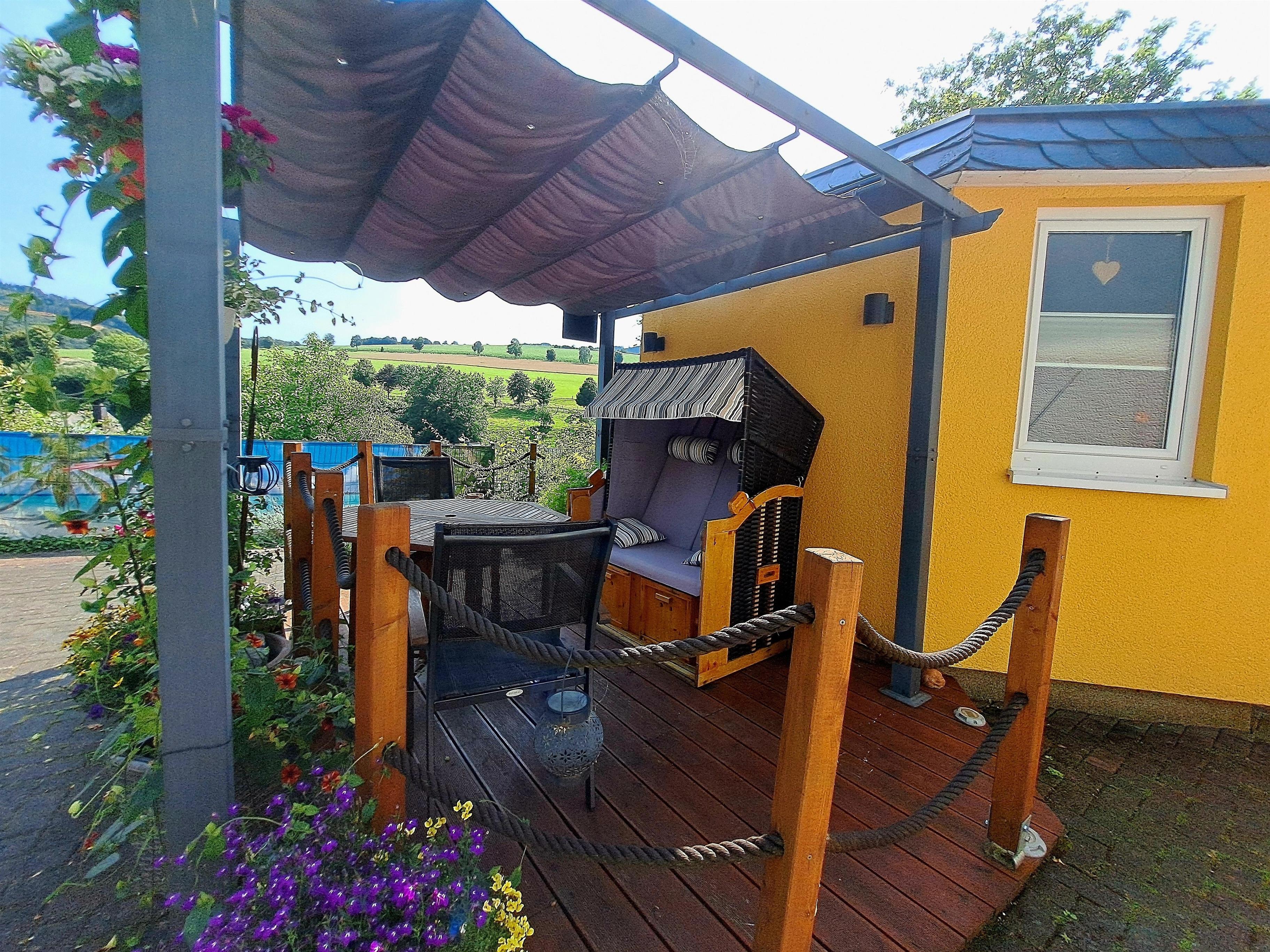 Im Außenbereich erwartet Sie eine Gemeinschaftsterrasse mit Gartenmöbeln, sowie eine kleine eigene Sitzgelegenheit direkt am Eingang der Unterkunft - perfekt für ein Frühstück in der Morgensonne oder einen entspannten Abend im Grünen.
