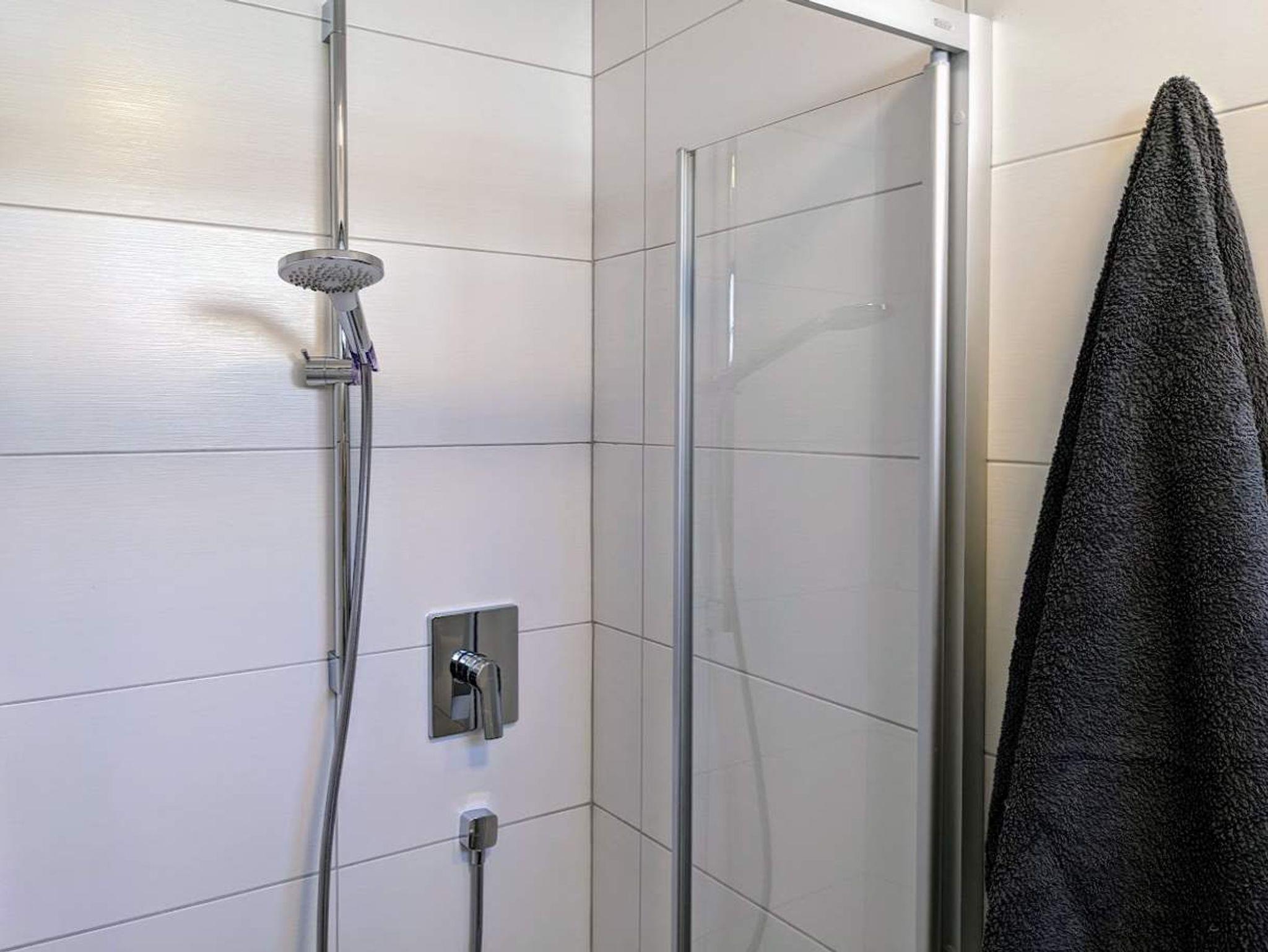 Dusche, WC und Waschbecken sind neben dem Gemeinschaftsraum, Hand- / Duschtücher und Fön sind vorhanden.