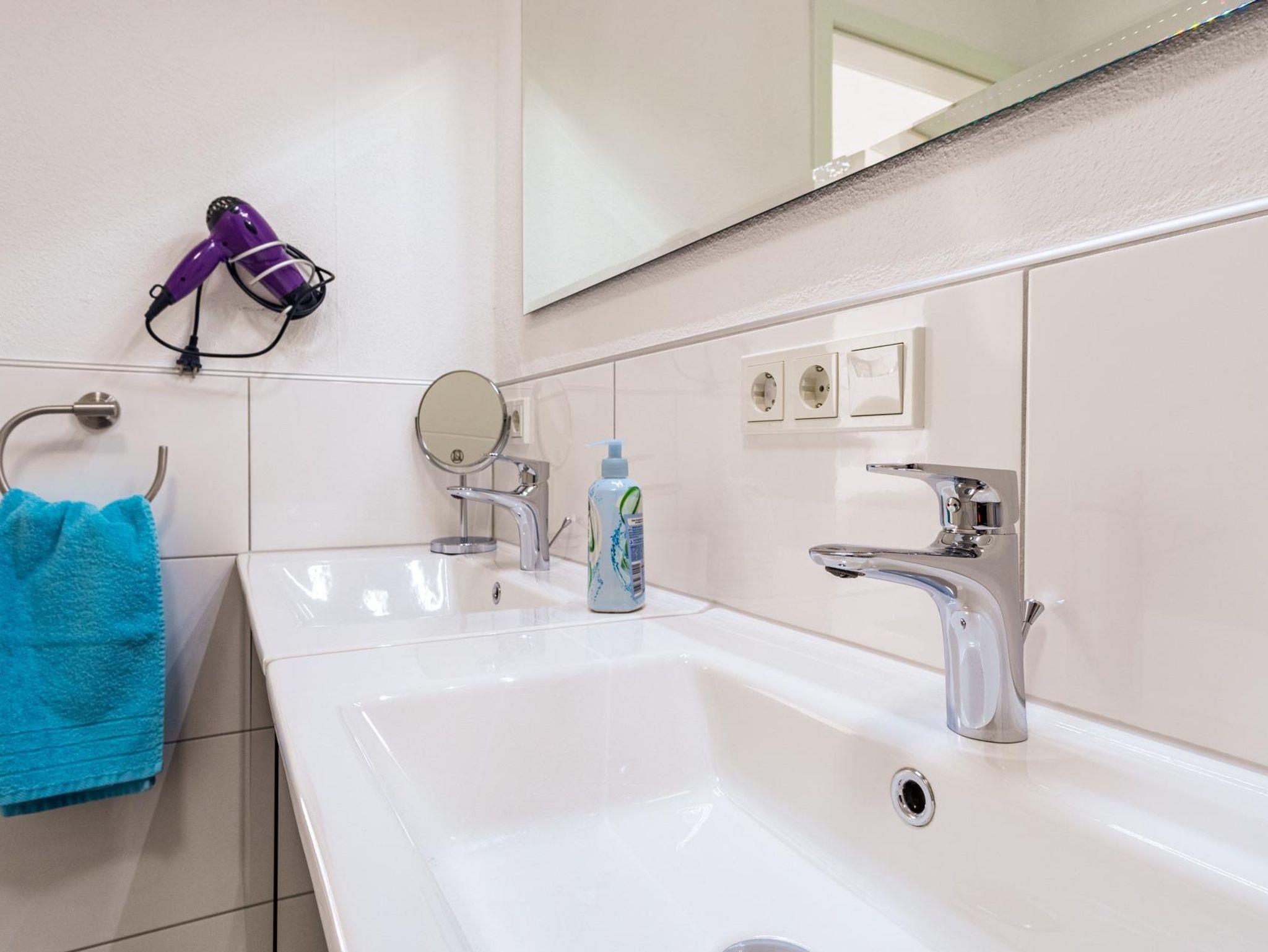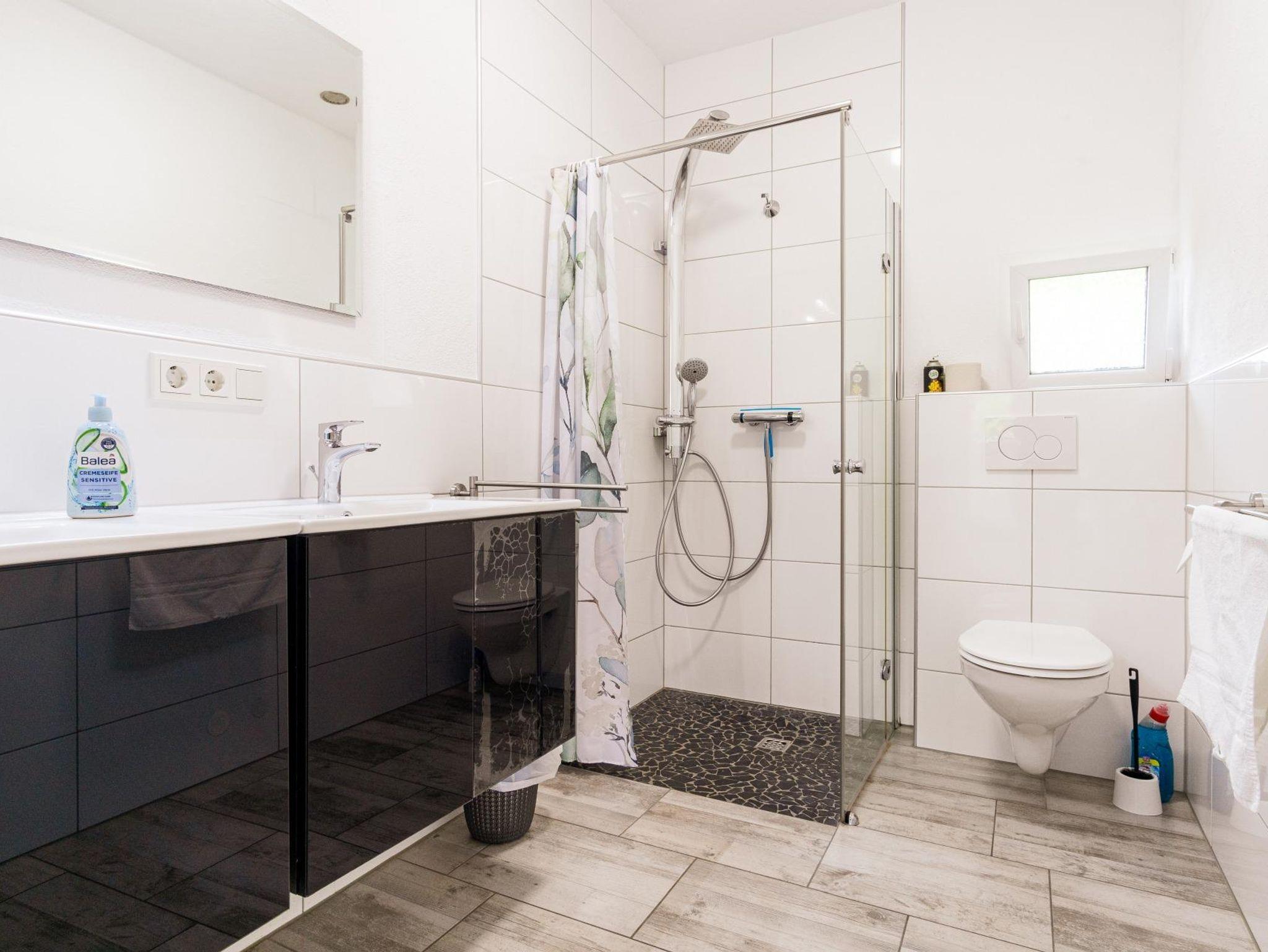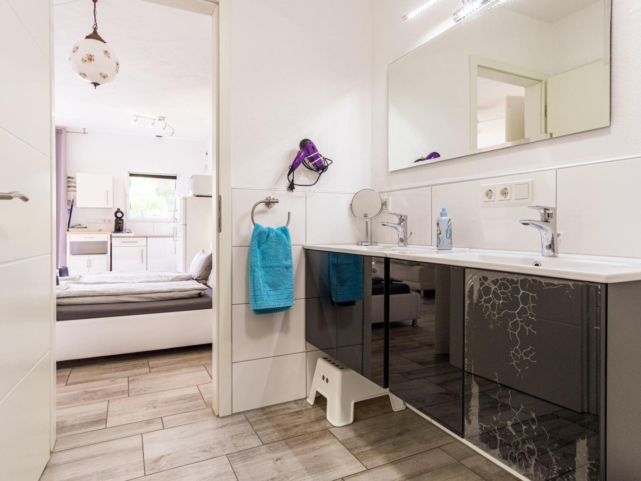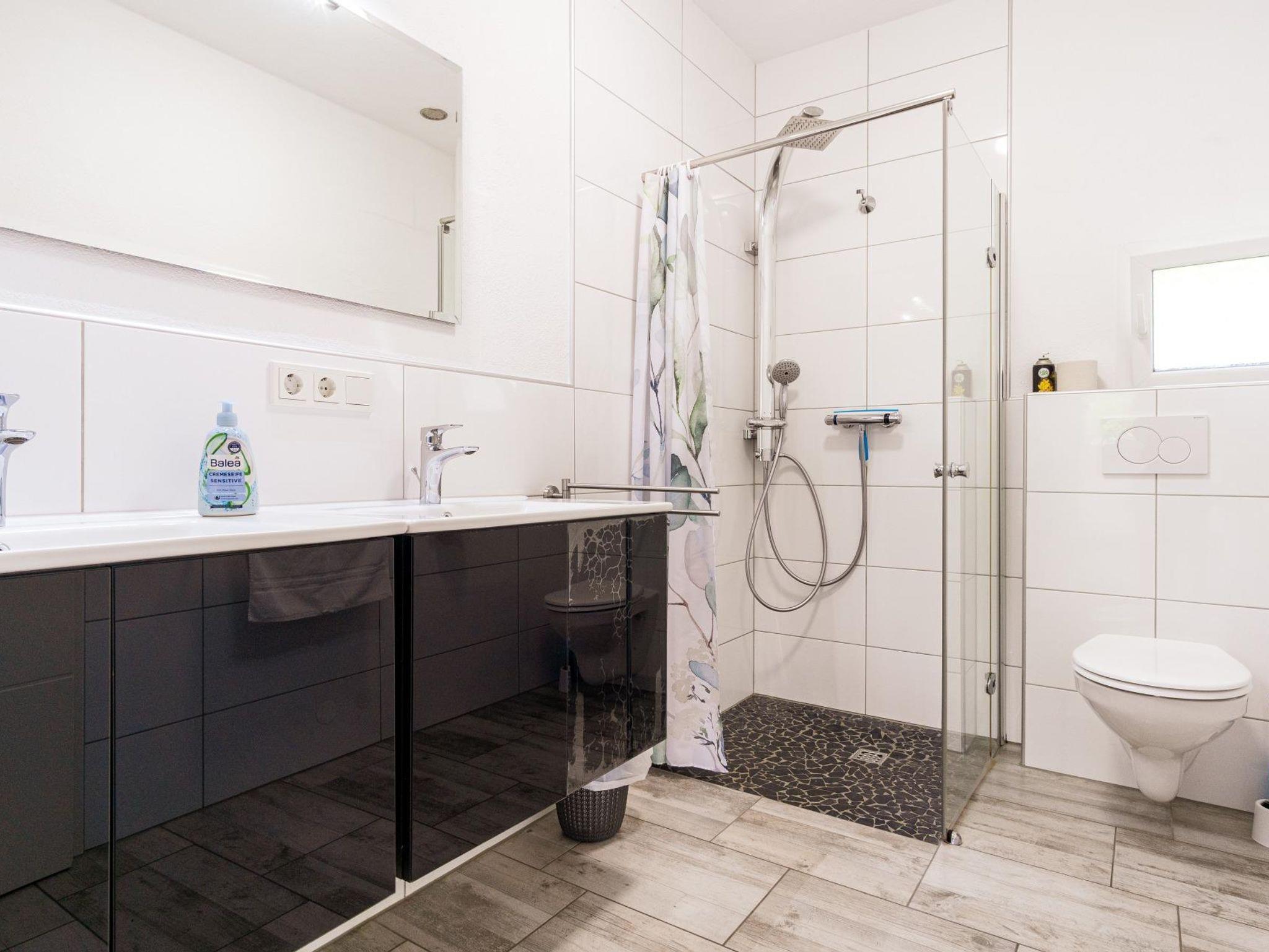 - Bad mit ebenerdiger Regendusche, zwei Waschbecken und einem WC
