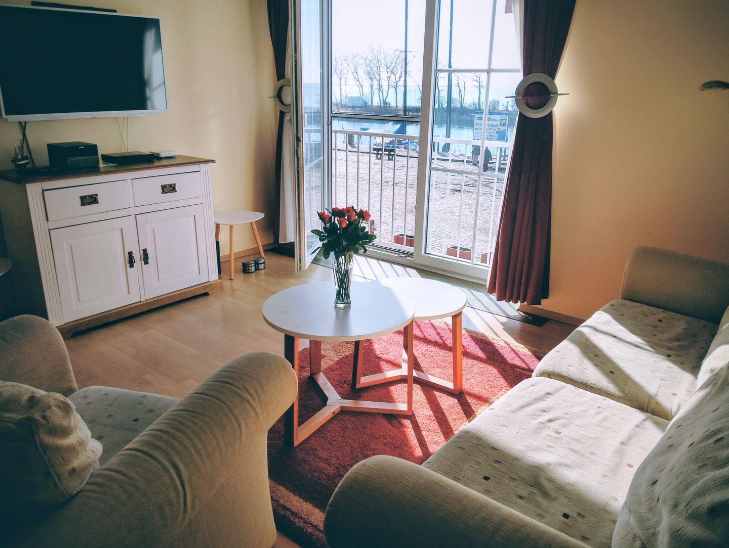 Die komfortable Ferienwohnung liegt im 1. Obergeschoss der Appartmentanlage im idyllischen Yachthafen Orth auf Fehmarn. Orth ist von 3 Seiten von Wasser umgeben und bietet ideale Bade- und Surf-/ Segelmöglichkeiten. Die Ferienwohnung hat ein Wohn-Esszimmer mit Blick in den Hafen, eine geräumige Küche mit Backofen, 4-Platten-Kochfeld, Kühlschrank mit Gefrierfach, Mikrowelle sowie Geschirrspüler. Ein französischer Balkon mit Blick in den Hafen grenzt an das Wohnzimmer. Ein separates Schlafzimmer mit Doppelbett ist vorhanden, ebenso ein geräumiges Duschbad. Flachbildfernseher sowie DVD-Player gehören ebenfalls zur gehobenen Ausstattung. Die gesamte Wohnung ist gefliest bzw. mit Laminat ausgelegt. Kinderreisebett und Kinderhochstuhl gehören ebenfalls zur Ausstattung.