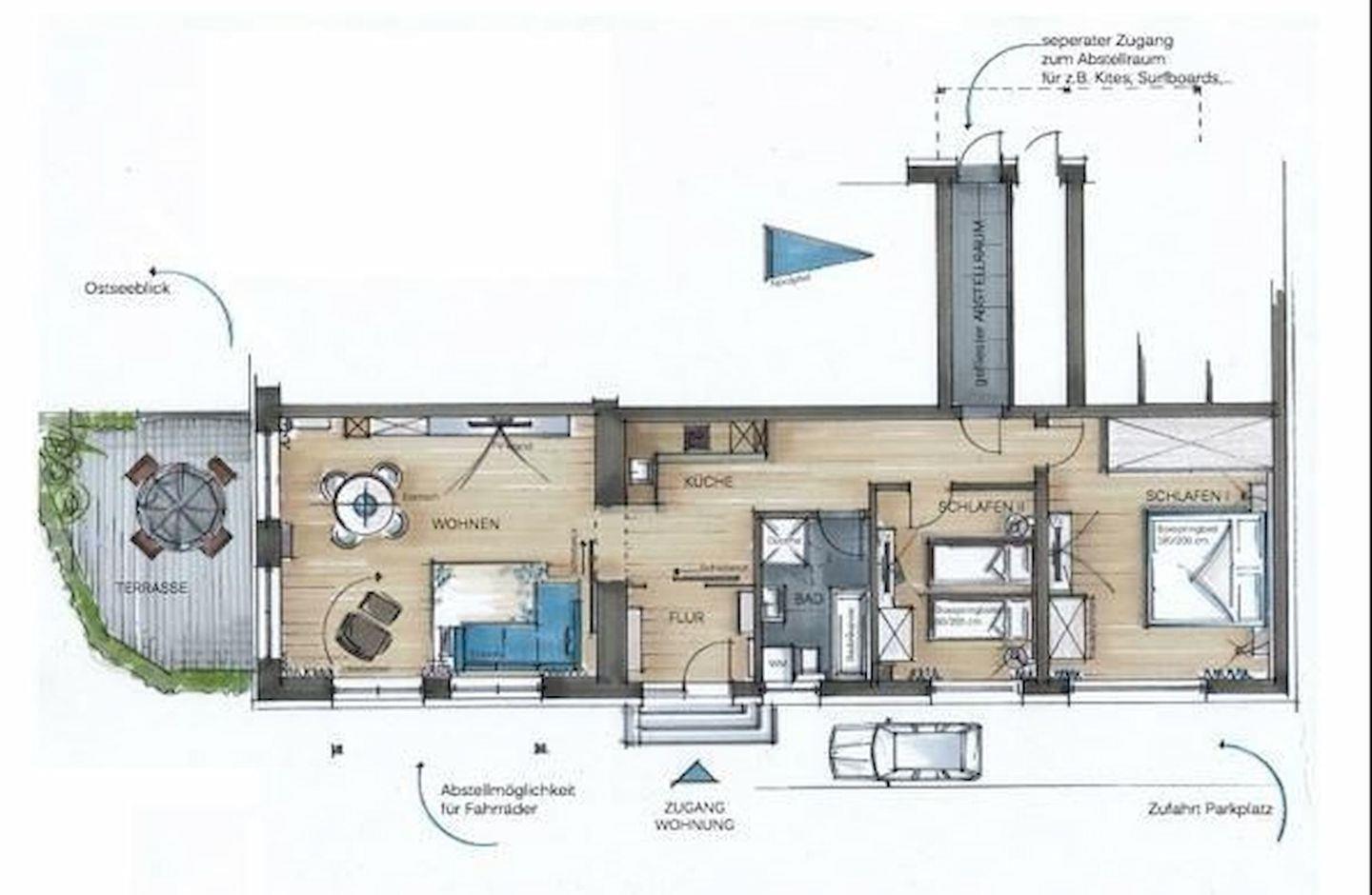 Diese Wohnung ist komplett neu eingerichtet mit exklusivem Inventar. Von der Terrasse hat man direkten Blick auf das Meer. Das Wohnzimmer und jedes Schlafzimmer sind mit Fernsehern ausgestattet. Kostenfreies Wlan steht den Gästen zur Verfügung. Der wohnungseigene Parkplatz befindet sich direkt vor dem Hauseingang, ein geräumiger Abstellraum für Räder oder Surfequipment gehört ebenfalls zur Wohnung.