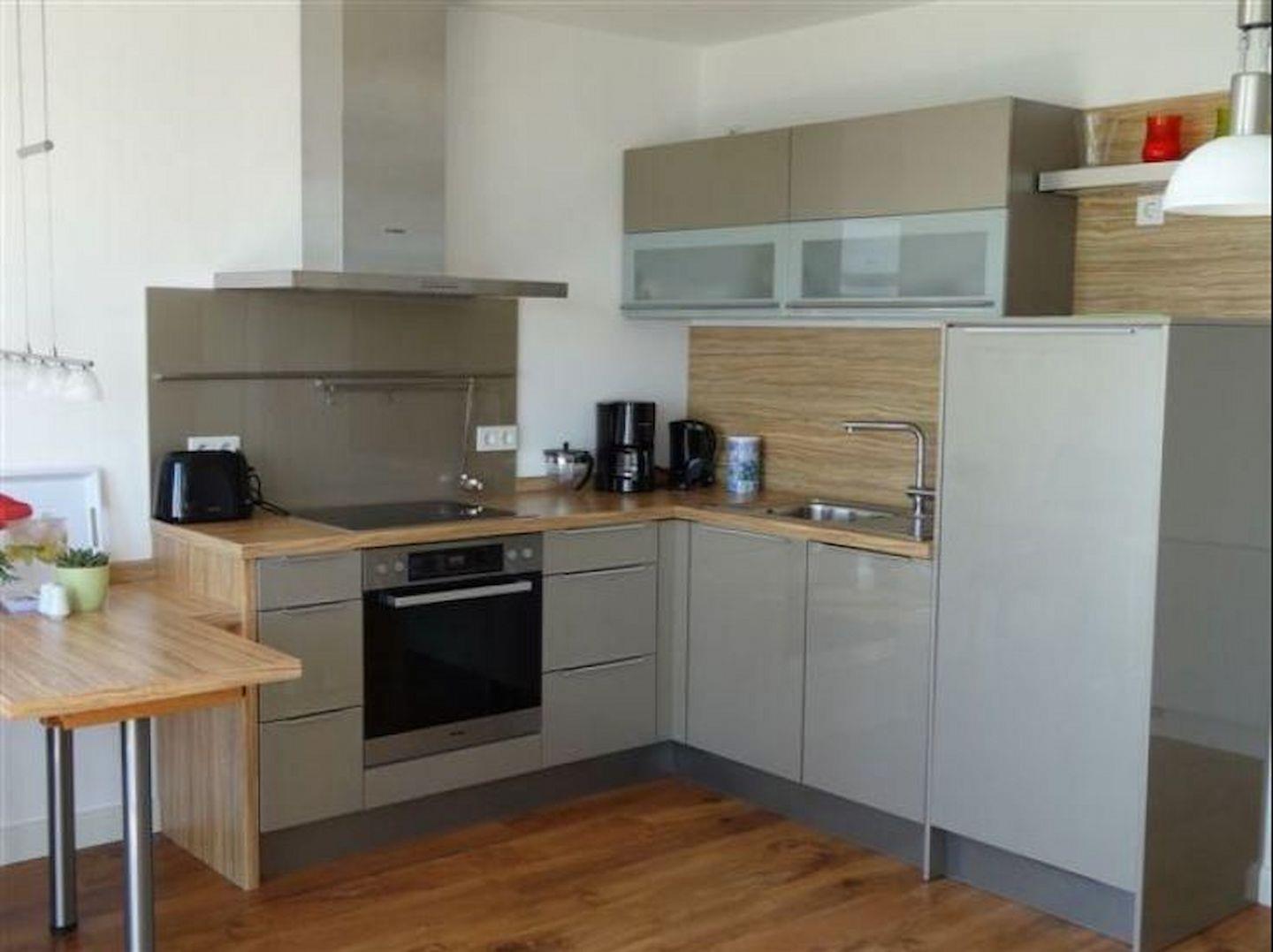Die Küche ist komplett ausgestattet mit Geschirr, Gläsern, Kochutensilien, Kaffeemaschine, Heißwasserkocher, Backofen sowie Kühlschrank mit Gefrierfach.
