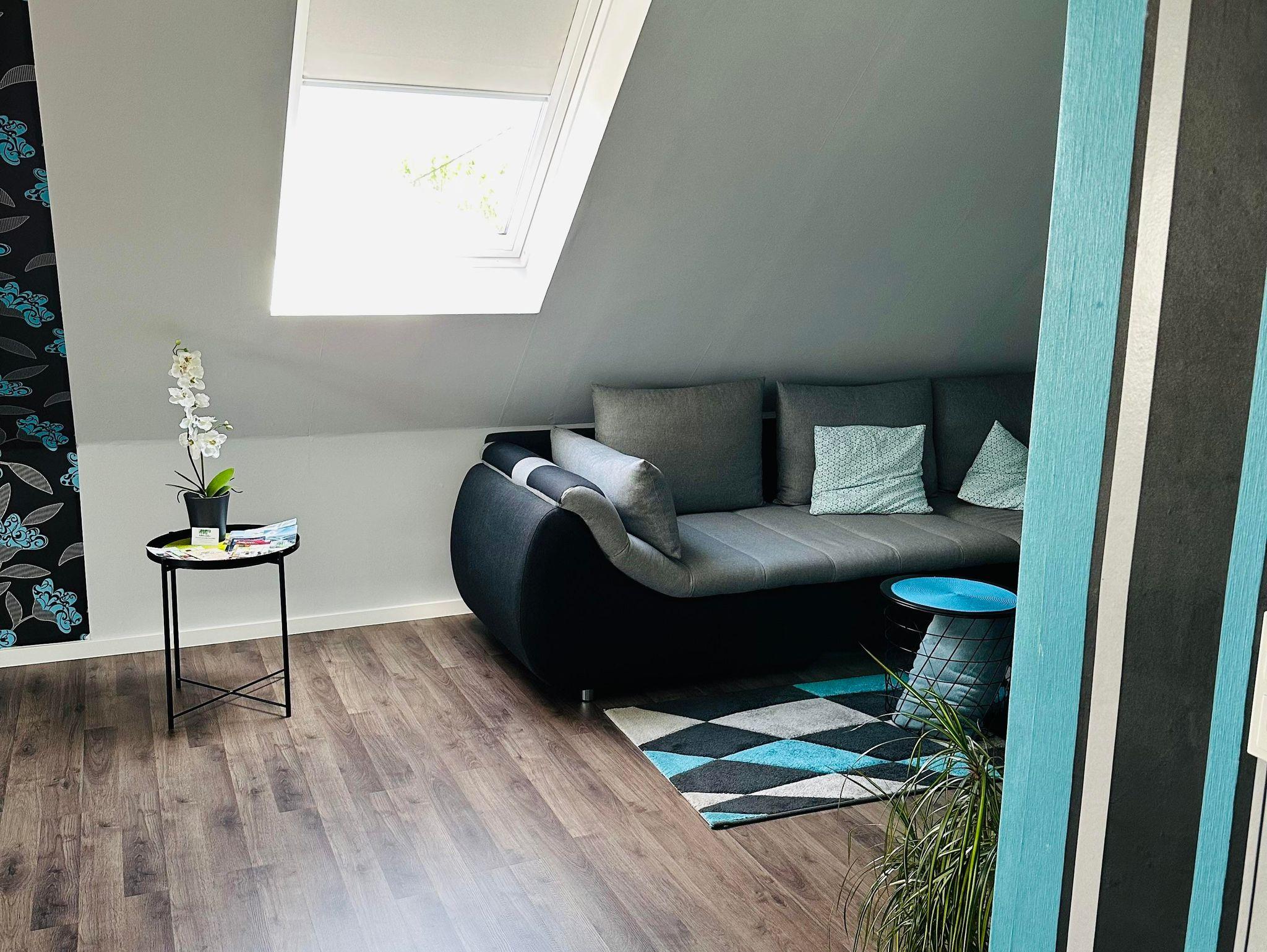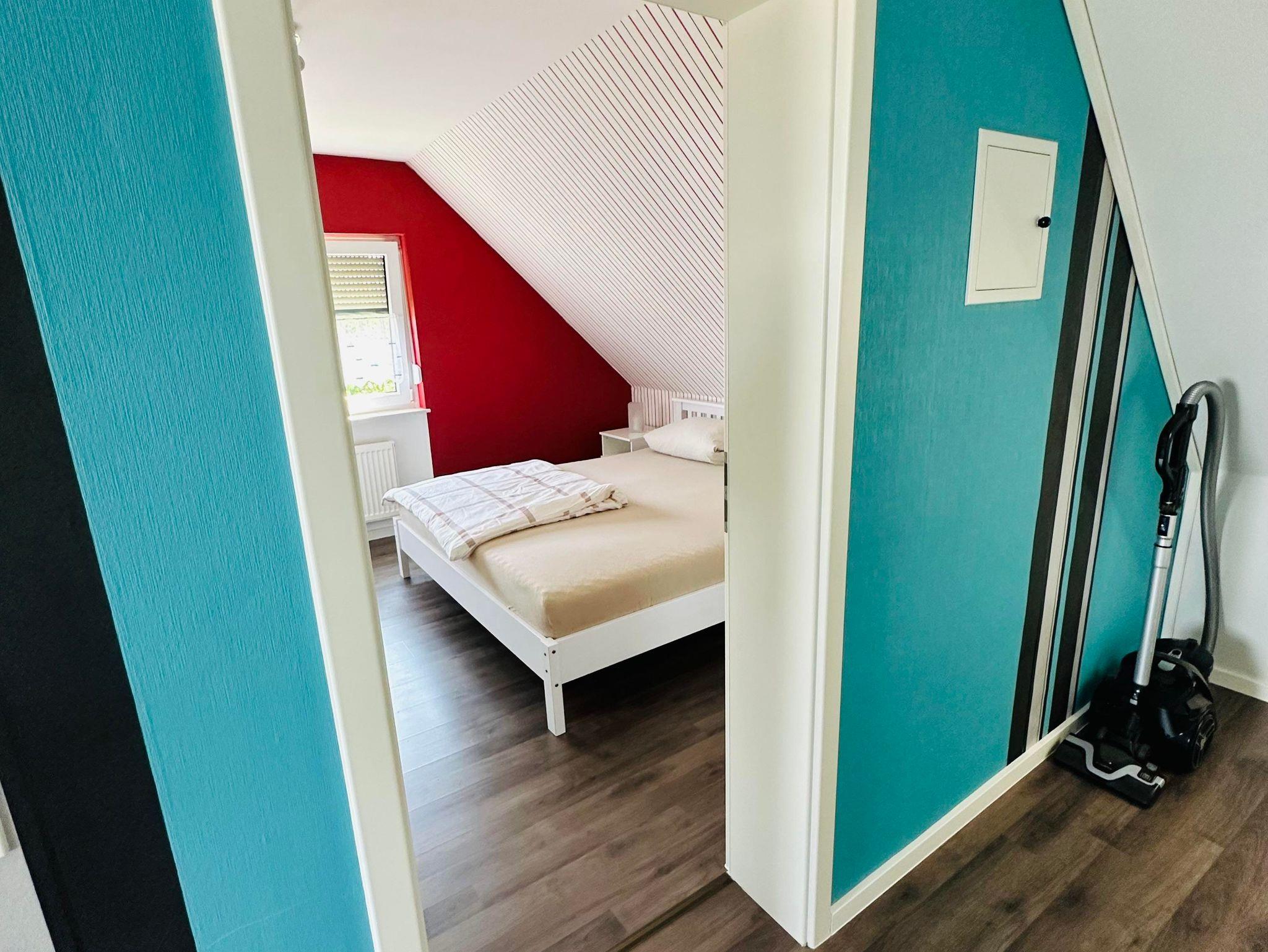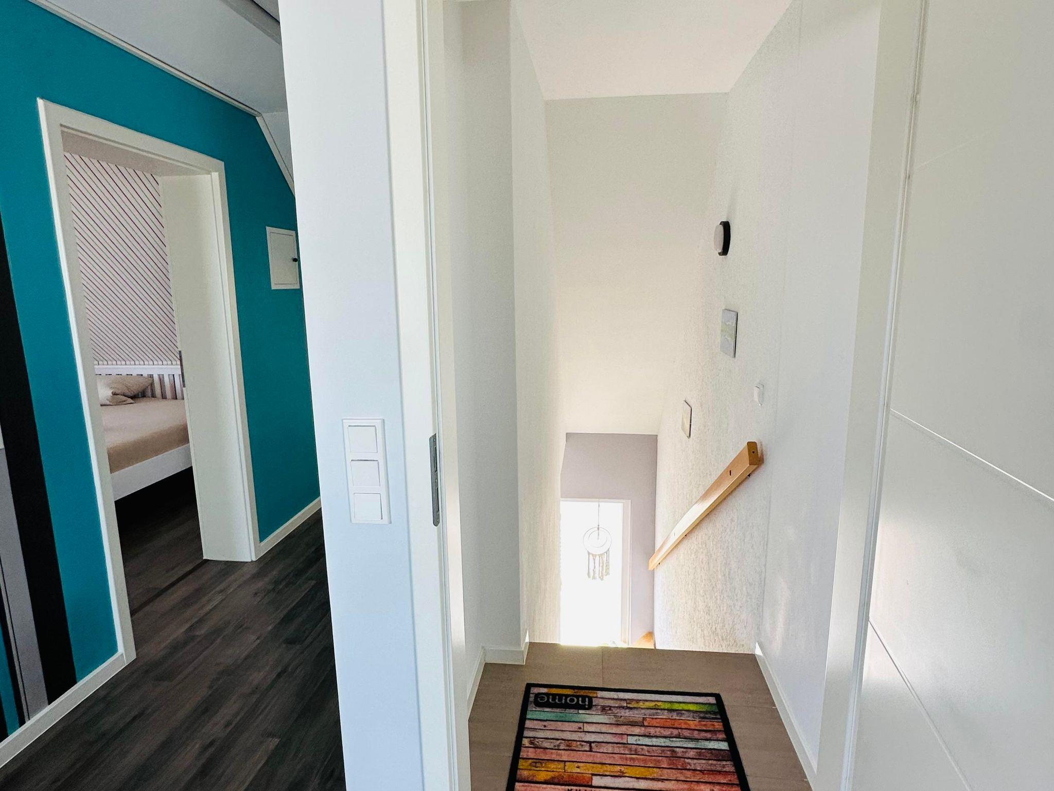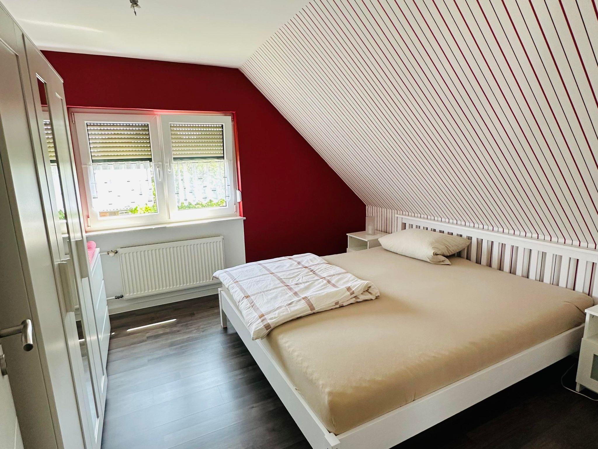 Die ca. 60 m² große Ferienwohnung befindet sich im 1. Obergeschoss des Einfamilienhauses und verfügt über eine großzügige Parkmöglichkeit direkt am Haus. Die Ferienwohnung verfügt über ein Schlafzimmer sowie eine weitere Schlafmöglichkeit im großzügigen Wohnbereich. Für Reise-Babybett etc. ist genügend Platz vorhanden. Das moderne Bad verfügt über eine ebenerdige Dusche sowie eine Badewanne, WC. Die Küche ist komplett eingerichtet, am Esstisch finden vier Personen Platz.