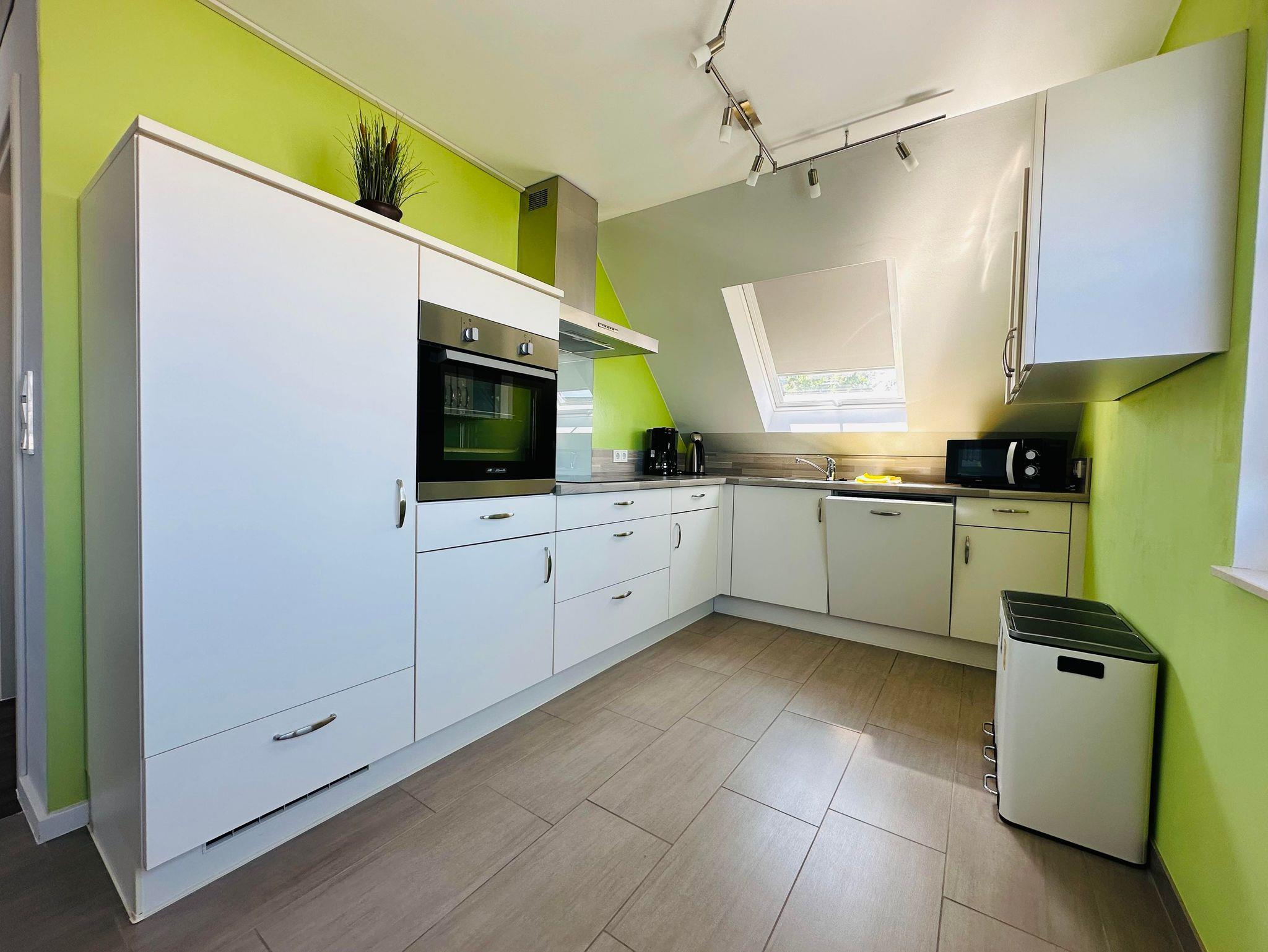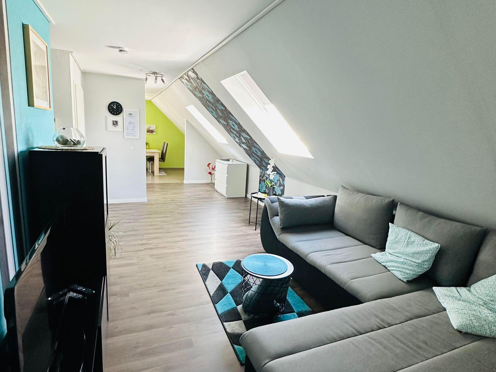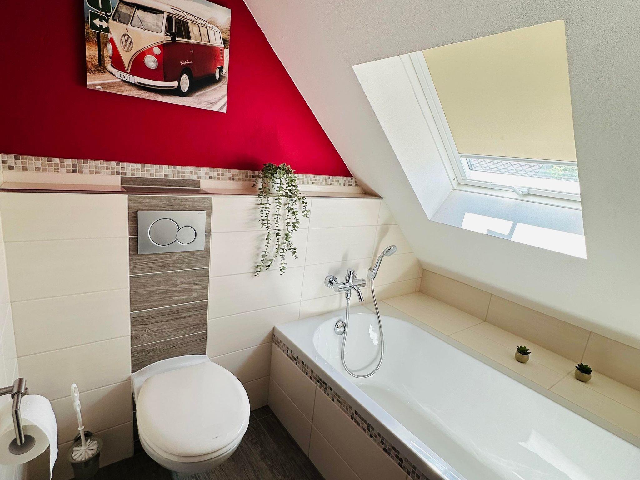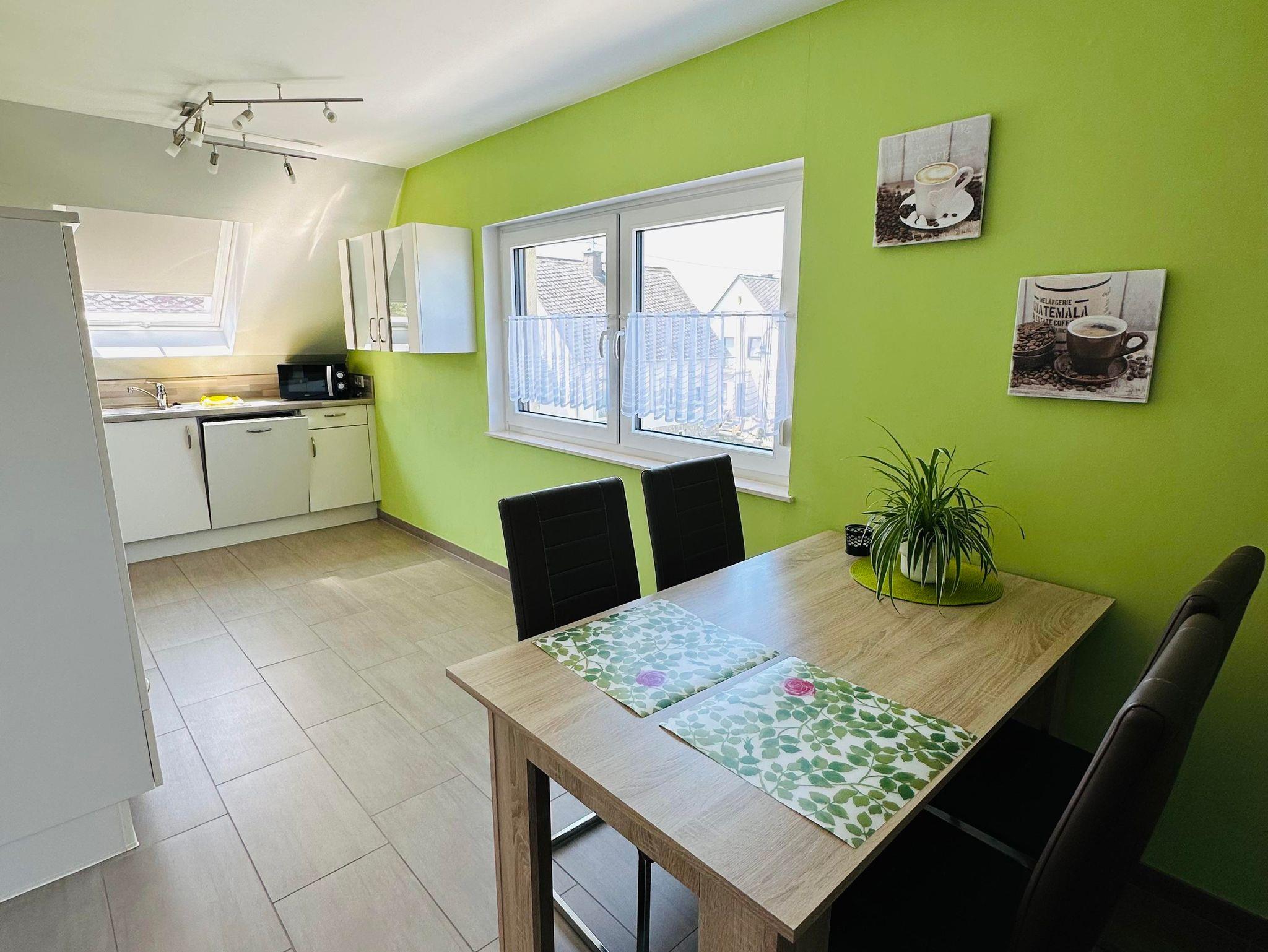 Die ca. 60 m² große Ferienwohnung befindet sich im 1. Obergeschoss des Einfamilienhauses und verfügt über eine großzügige Parkmöglichkeit direkt am Haus. Die Ferienwohnung verfügt über ein Schlafzimmer sowie eine weitere Schlafmöglichkeit im großzügigen Wohnbereich. Für Reise-Babybett etc. ist genügend Platz vorhanden. Das moderne Bad verfügt über eine ebenerdige Dusche sowie eine Badewanne, WC. Die Küche ist komplett eingerichtet, am Esstisch finden vier Personen Platz.