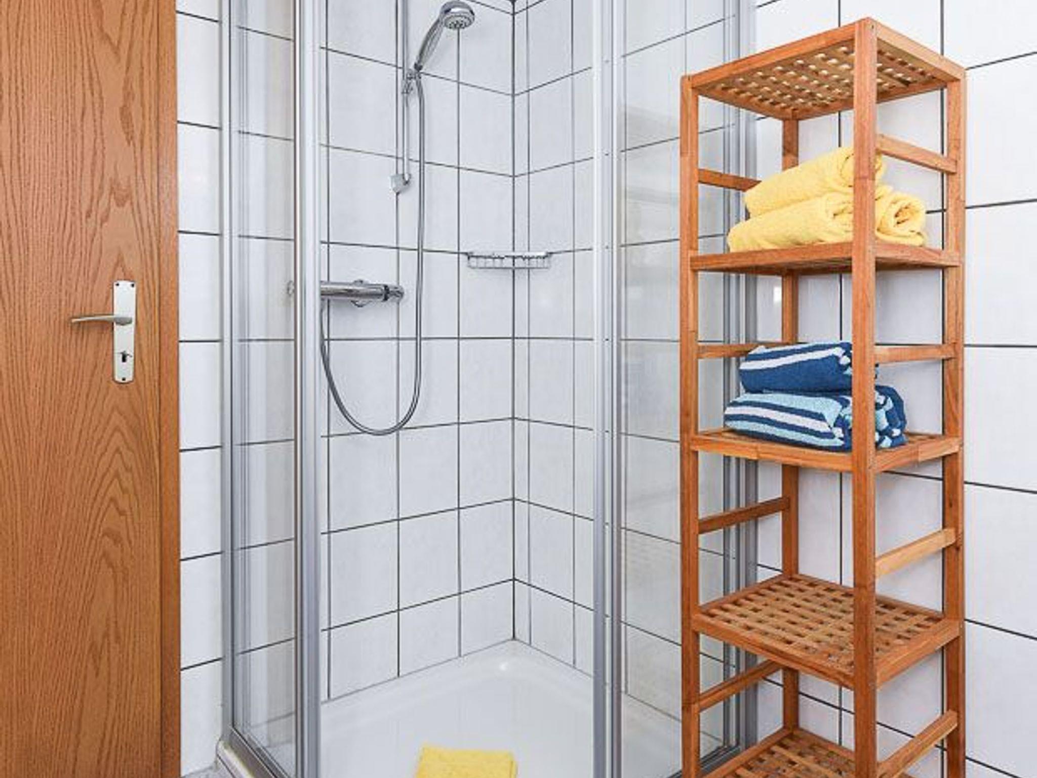 Badezimmer mit Dusche, Waschtisch und WC