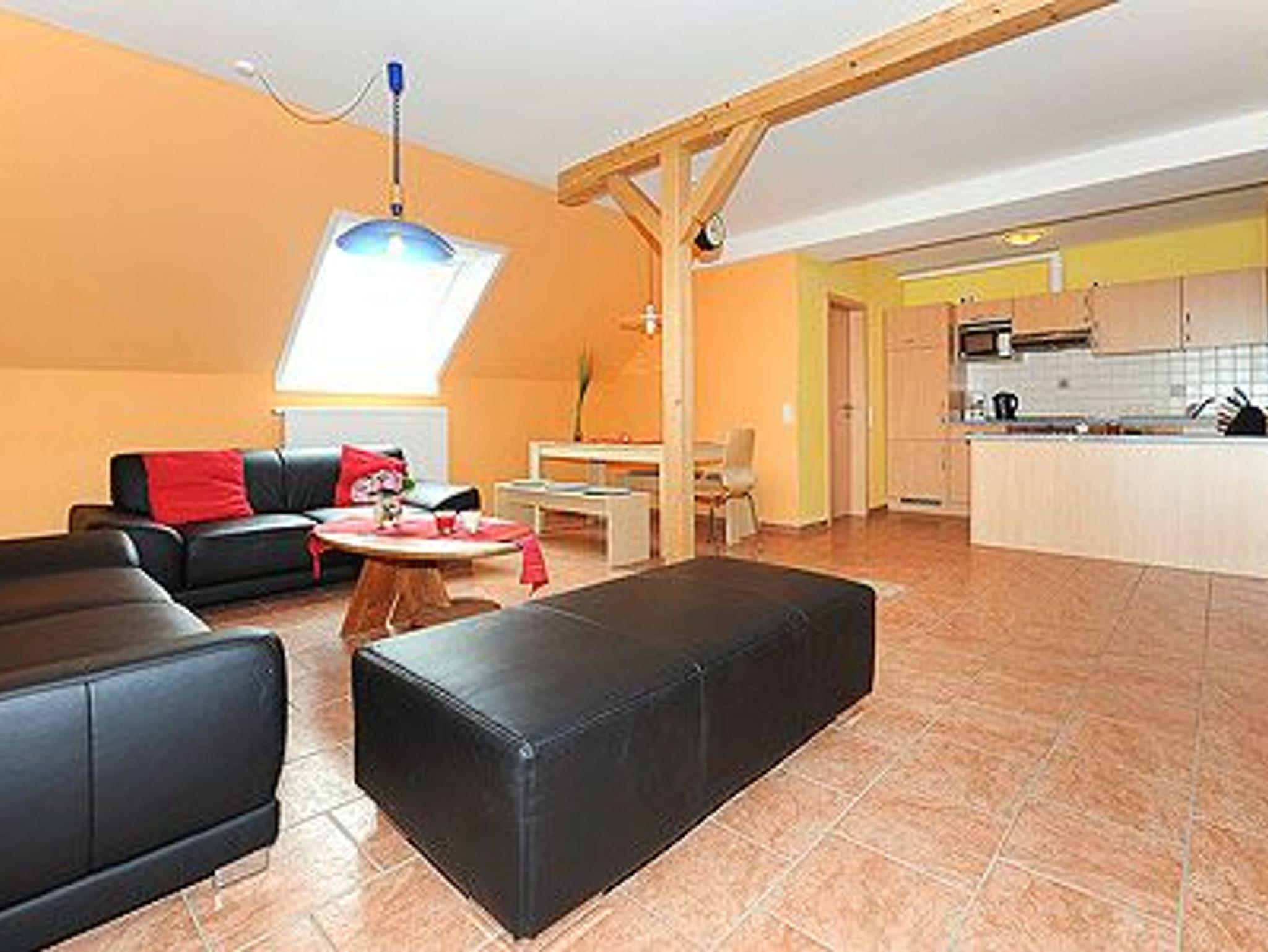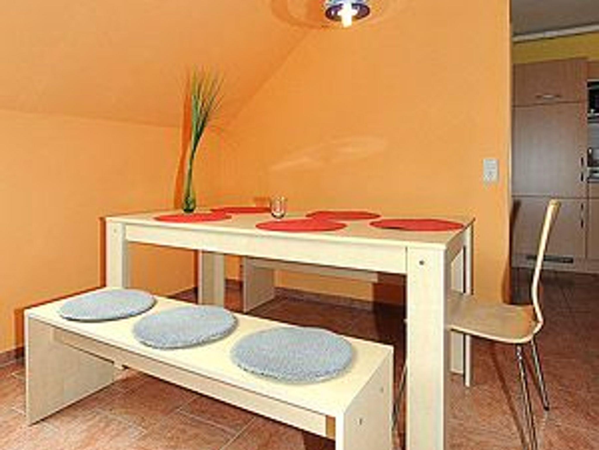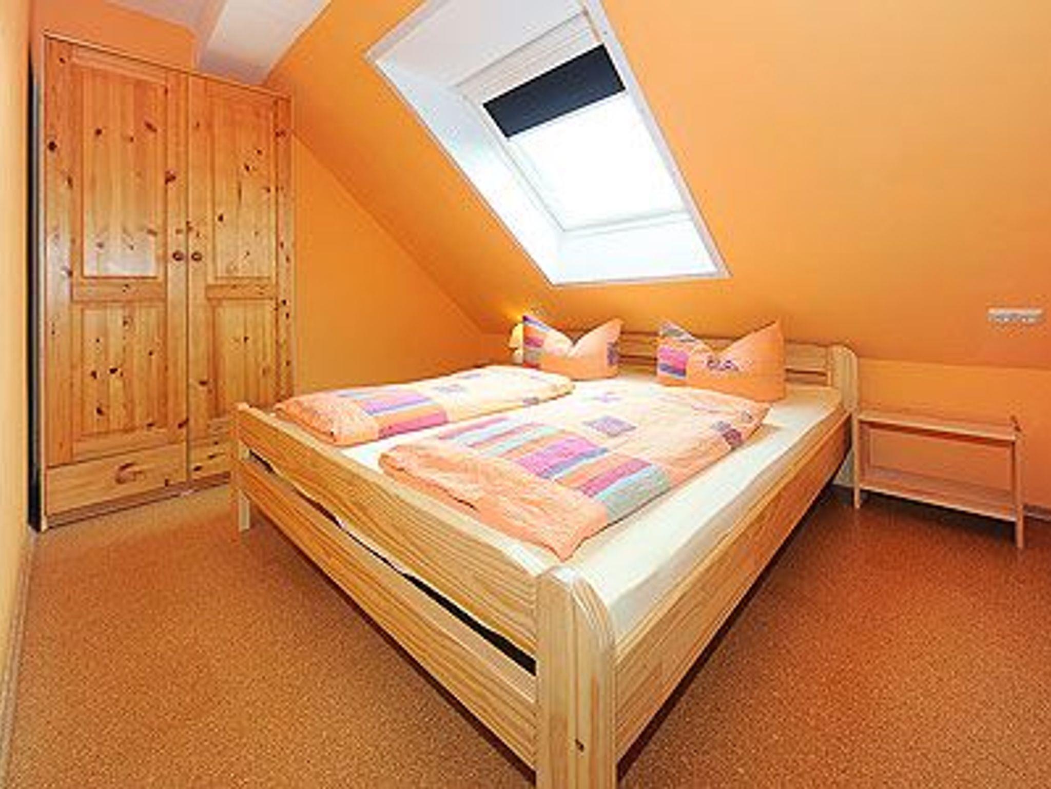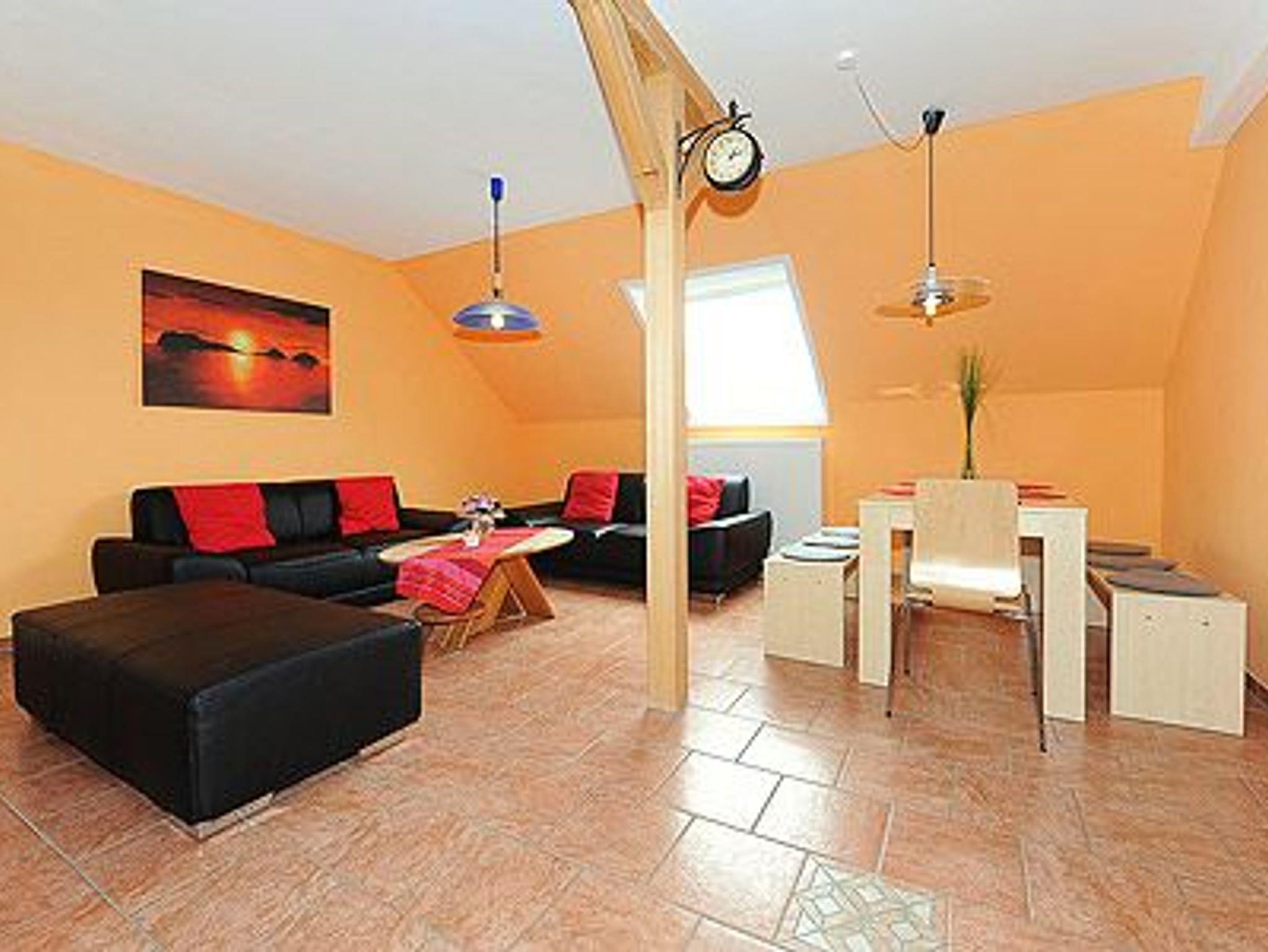 Größe ca. 65 Quadratmeter, Wohnraum mit integrierter Küche, Schlafzimmer, zweites separates, Schlafzimmer/Kinderzimmer, Badezimmer mit Dusche, Waschtisch und WC, Obergeschoss, Terrasse (Sitzgruppe im Garten), optimal für 2 bis 5 Personen und zusätzlich ein Kleinkind.