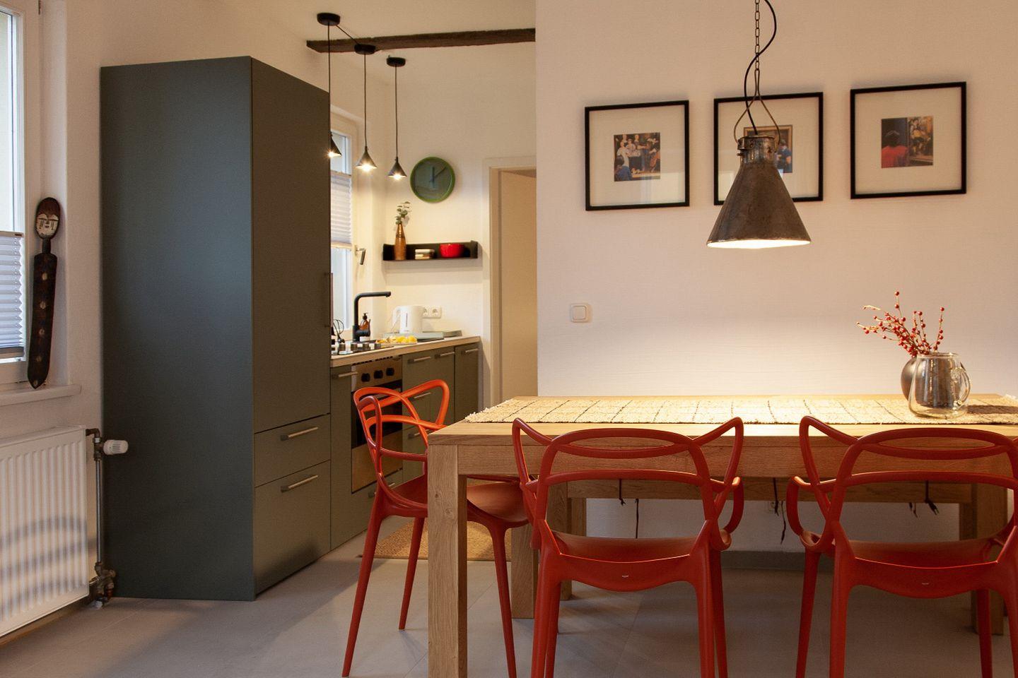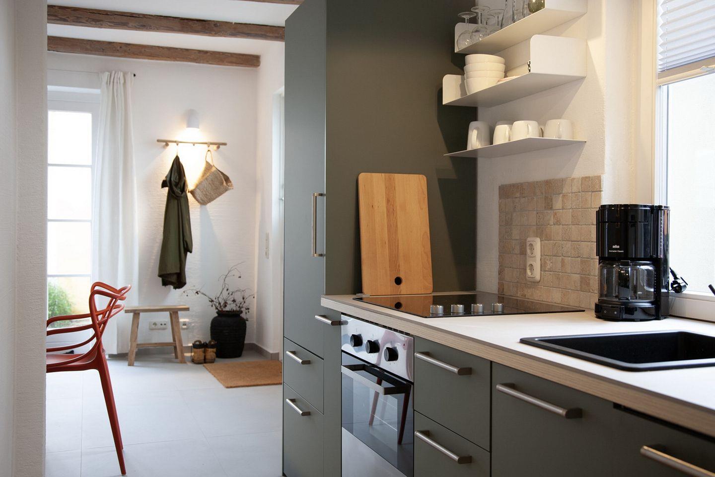 Der Wohn- und Essbereich bildet zusammen mit der Küche einen offenen Raum. Die Küche ist mit einem Geschirrspüler, einem Backofen (mit Grillfunktion) und einem Kühlschrank mit Gefrierfach vollständig ausgestattet. Komplettiert wird die Küche durch einen Wasserkocher, einer Kaffeemaschine, einem Espressokocher und einem Toaster. Alle notwendigen Utensilien für eine gute Selbstversorgung sind somit vorhanden. Am großzügigen Esstisch lassen sich gemeinsame Mahlzeiten einnehmen.