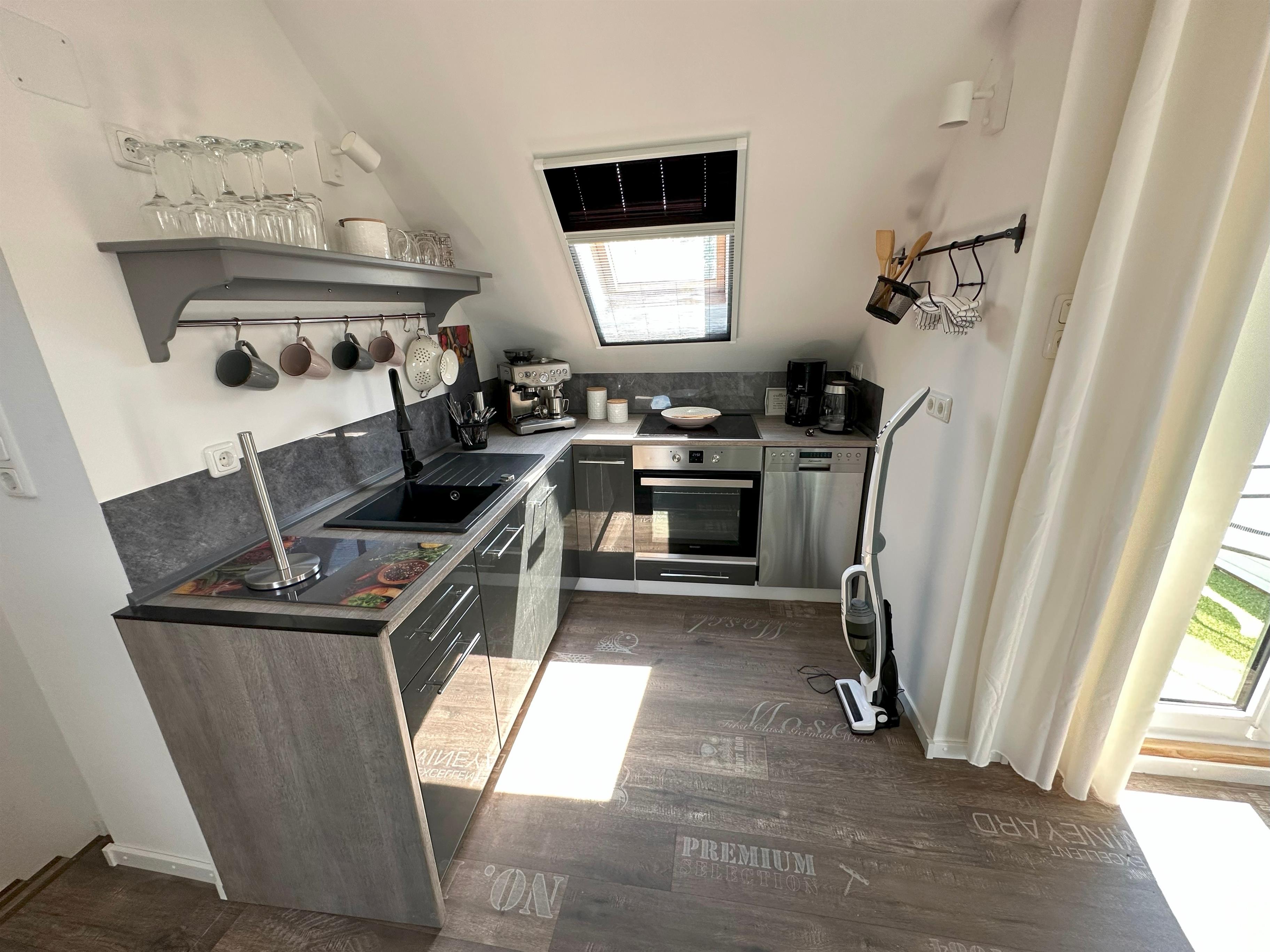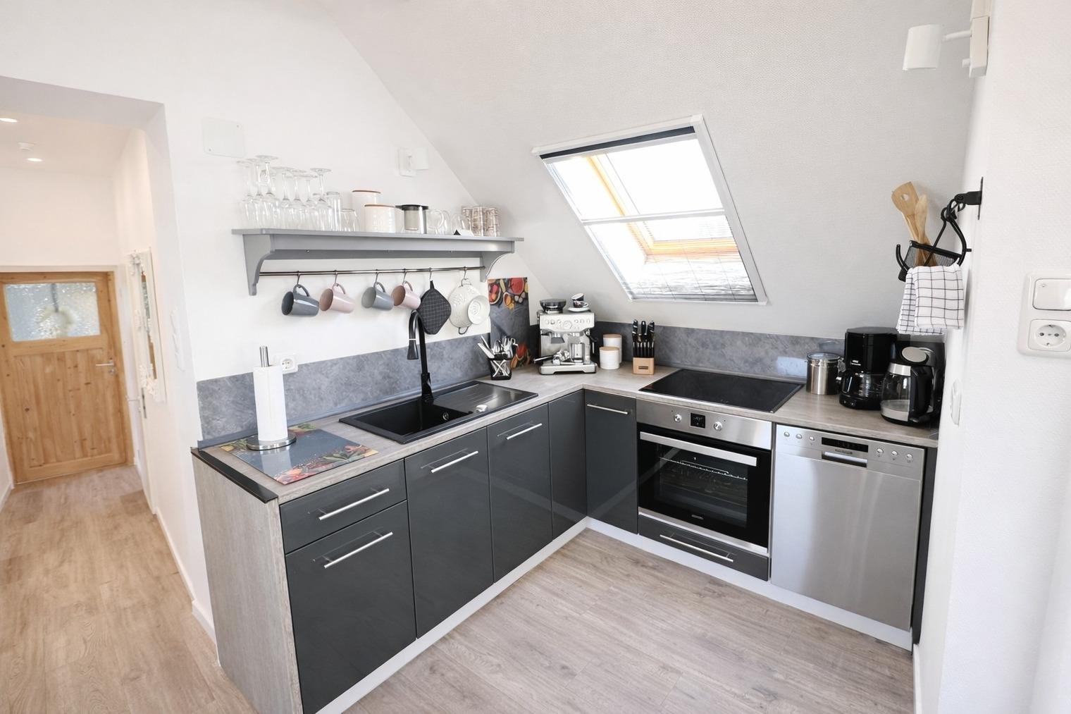 • Voll ausgestattete Küche mit großem Kühlschrank inklusive Gefrierfach, Spülmaschine und Filterkaffeemaschine