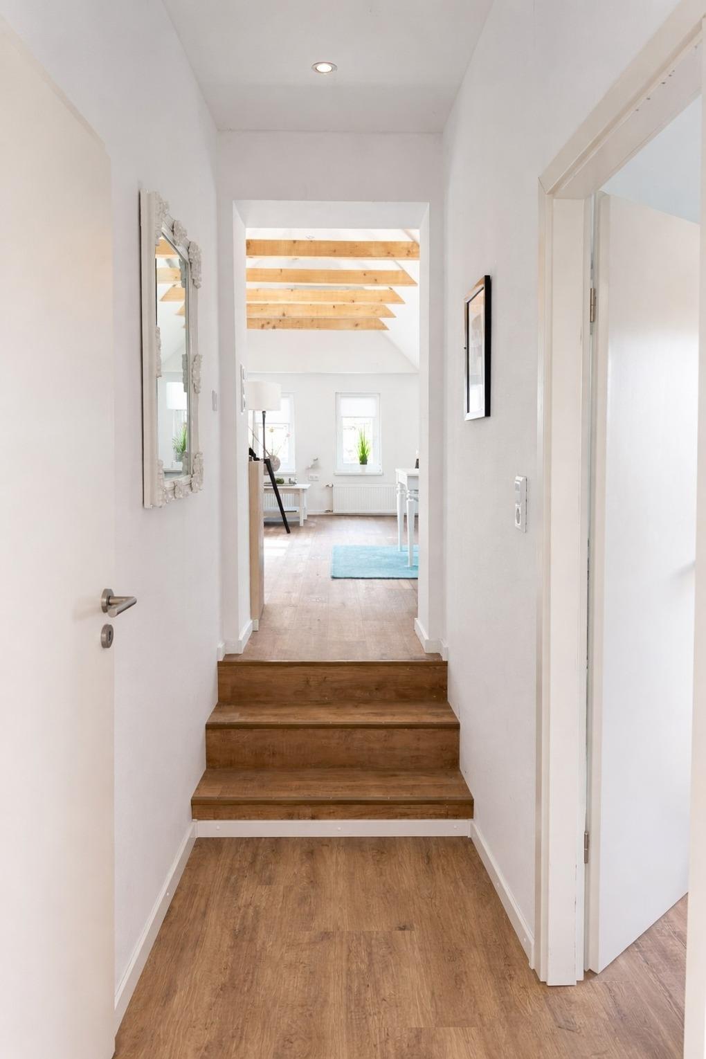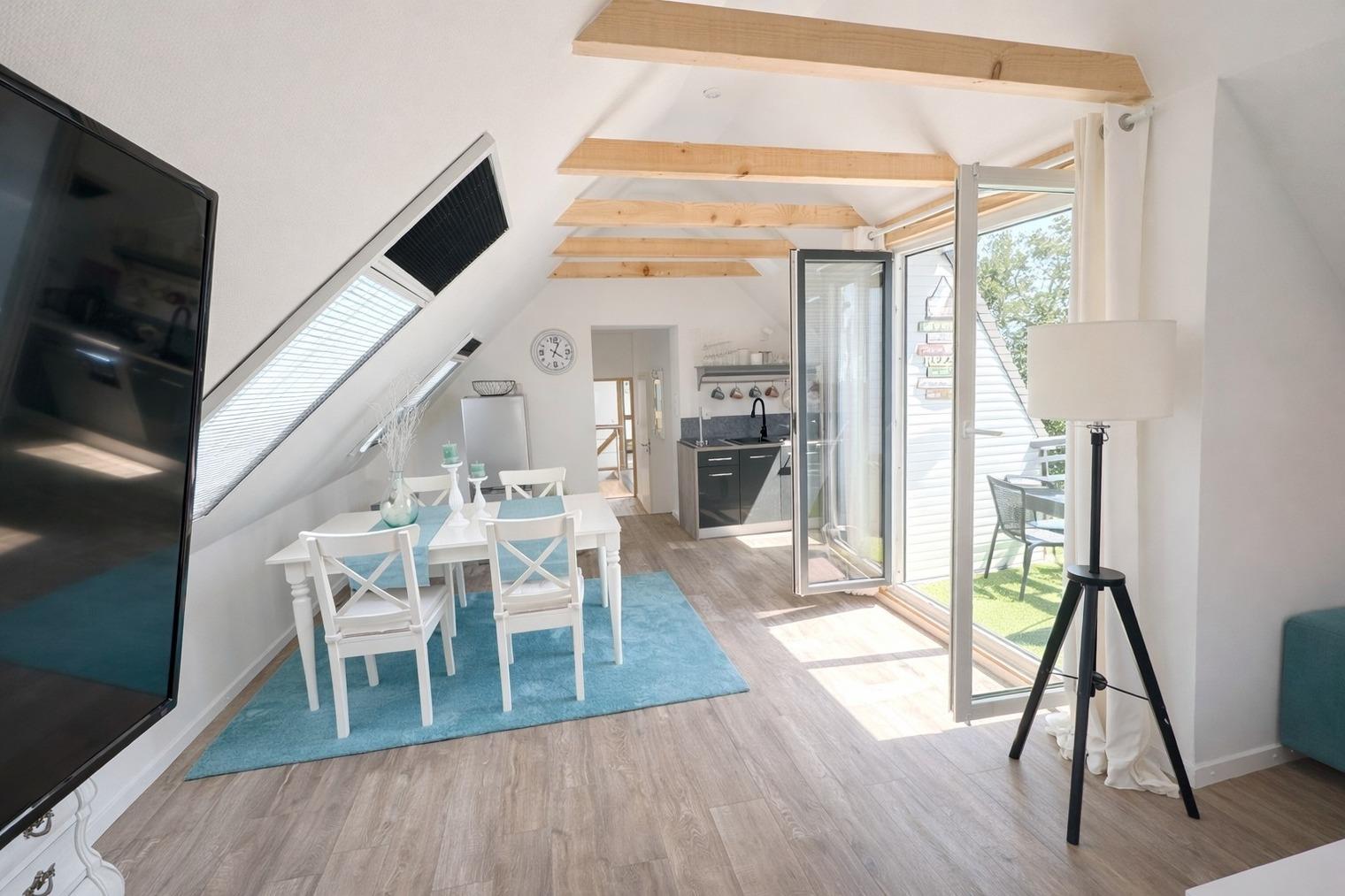 Die Wohnung eignet sich ideal für 1–2 Personen, die fernab vom Alltagstrubel entspannen und neue Energie tanken möchten. Die moderne und hochwertige Innenausstattung, kombiniert mit viel Tageslicht und sichtbaren Dachbalken, schafft eine warme und freundliche Wohlfühlatmosphäre.