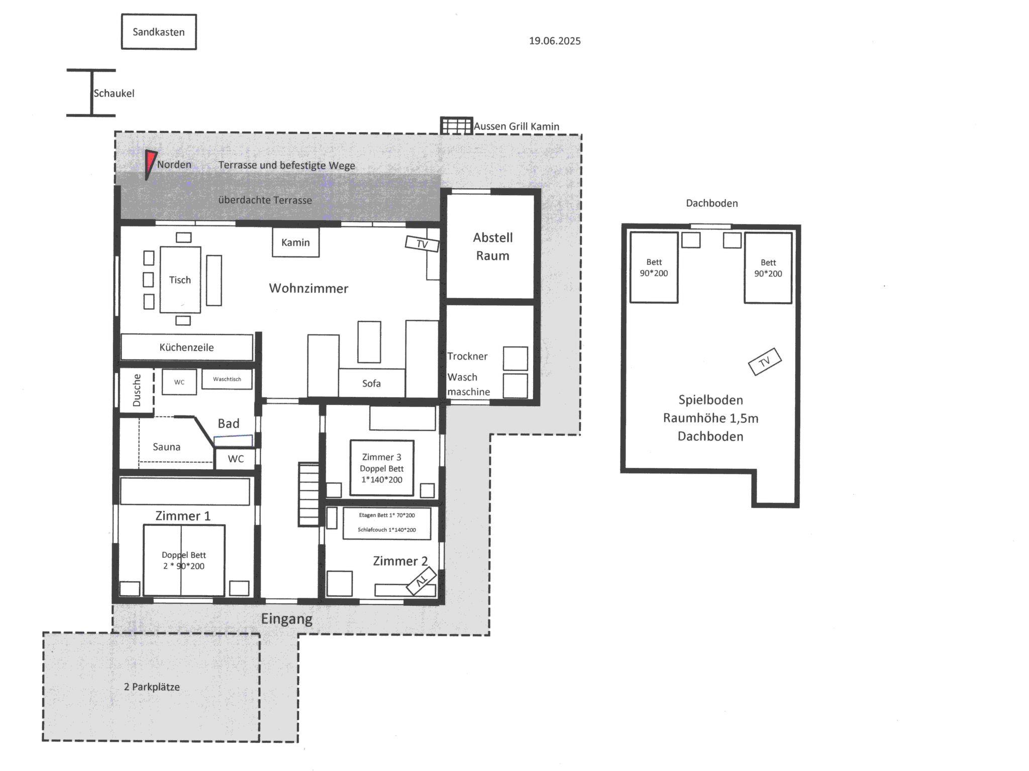 Inside, you will find a large living area with a cosy wood-burning stove, a real leather couch and a 42-inch LED TV, ideal for relaxing evenings. The centrepiece of the house is the wellness bathroom with a sauna that can accommodate up to four people, complemented by a guest WC. Three tastefully furnished bedrooms and a play loft provide ample space for peace and privacy. Underfloor heating, a comprehensive selection of games and a fibre-optic WLAN connection add to the sense of well-being. The kitchen is fully equipped, and a storage room with washing machine and tumble dryer round off the offer.