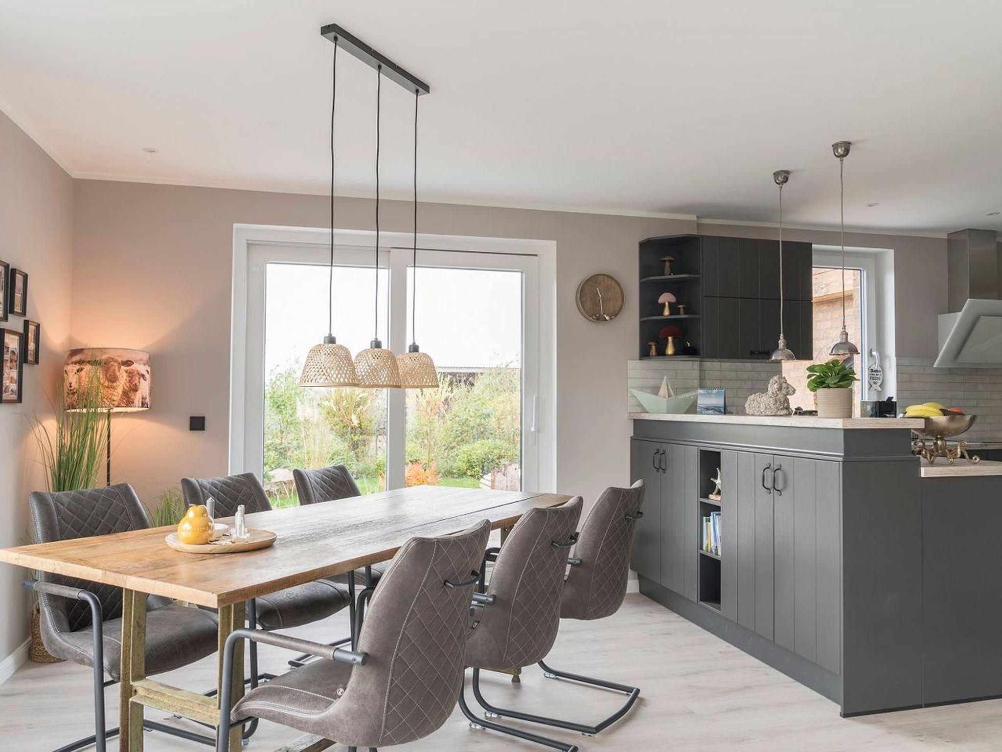 Küche und Essbereich: Der Essbereich für 6 Personen und die Küche bilden eine Einheit und ermöglichen den Blick auf die Terrasse und in den Garten.