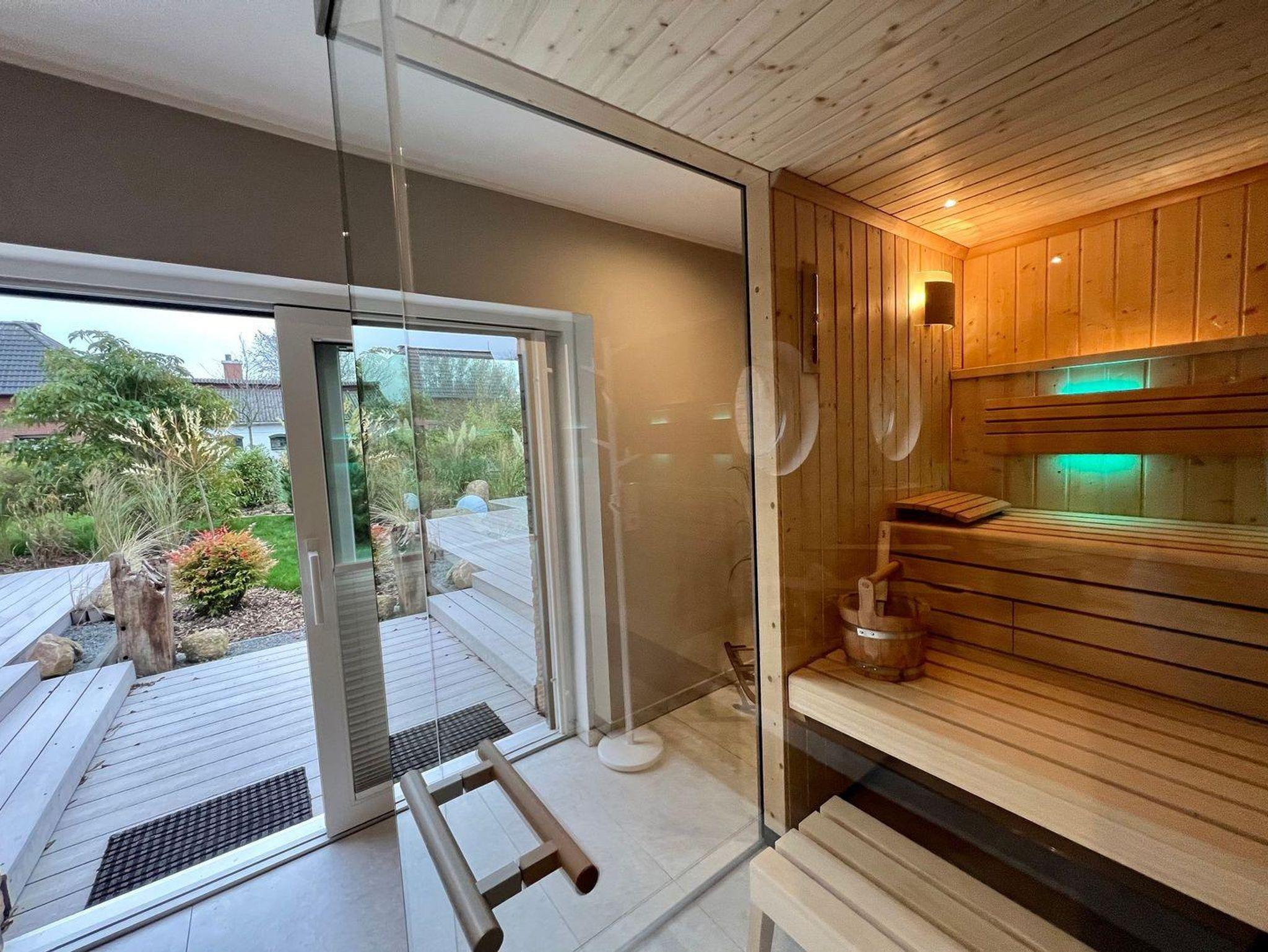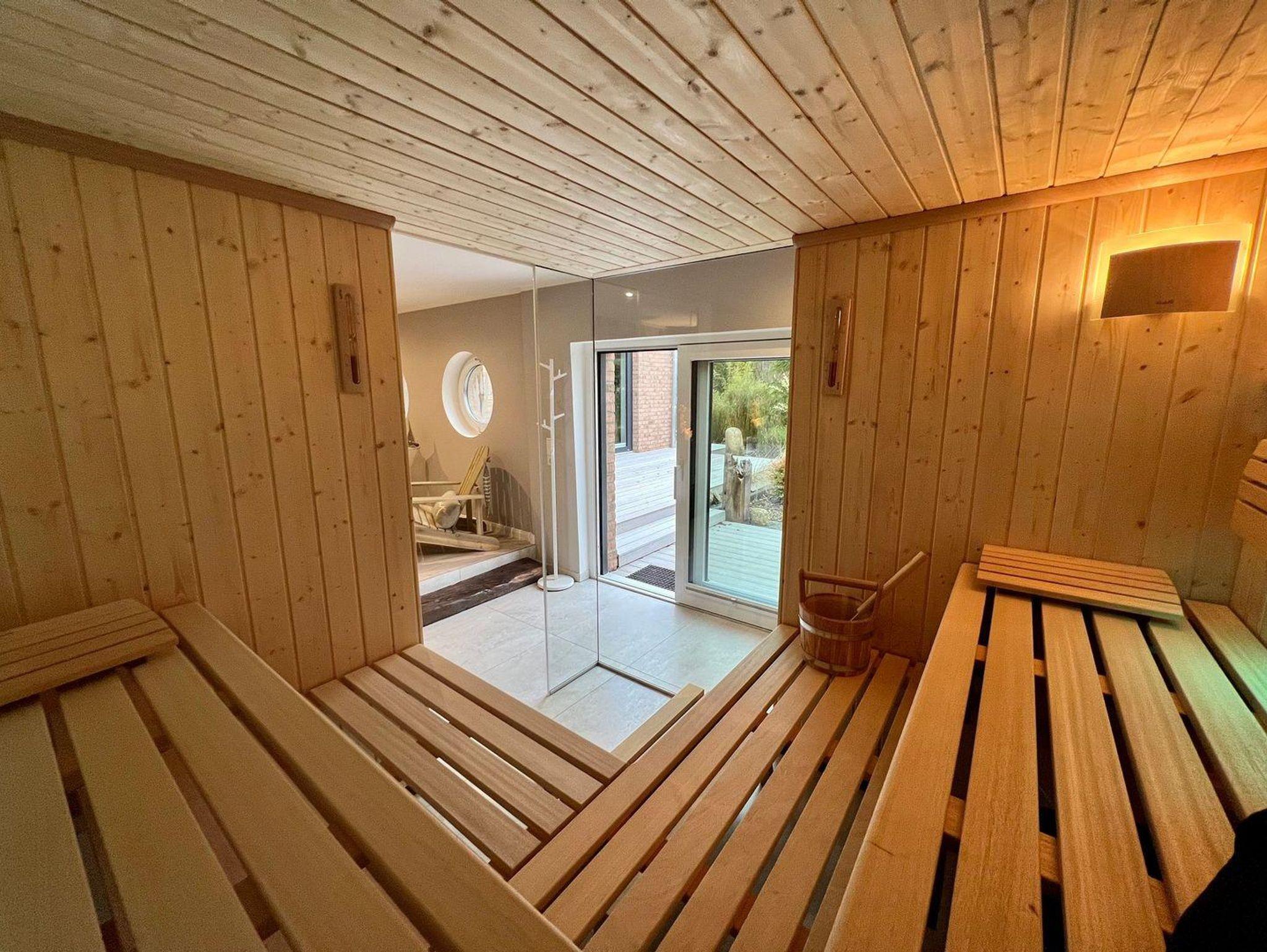 Sauna: Die großzügige Sauna im Erdgeschoss mit eigener Dusche lädt zum Wohlfühlen ein. Die Anbindung in den Garten ermöglicht eine anschließende Abkühlung.