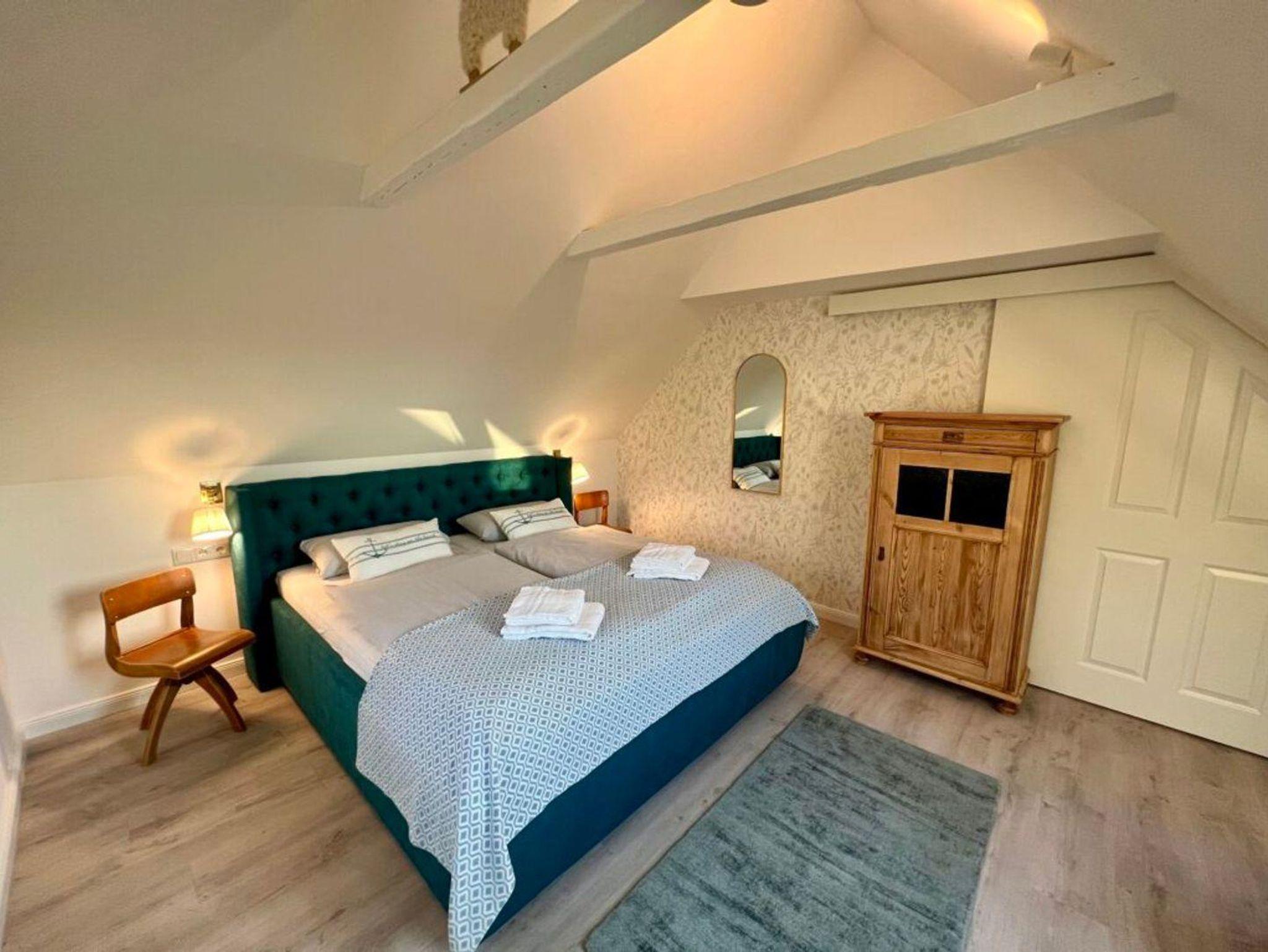 Im Obergeschoß befinden sich zwei Schlafzimmer mit Doppelbett (180 x 200 cm), Kleiderschrank und jeweils SAT-TV