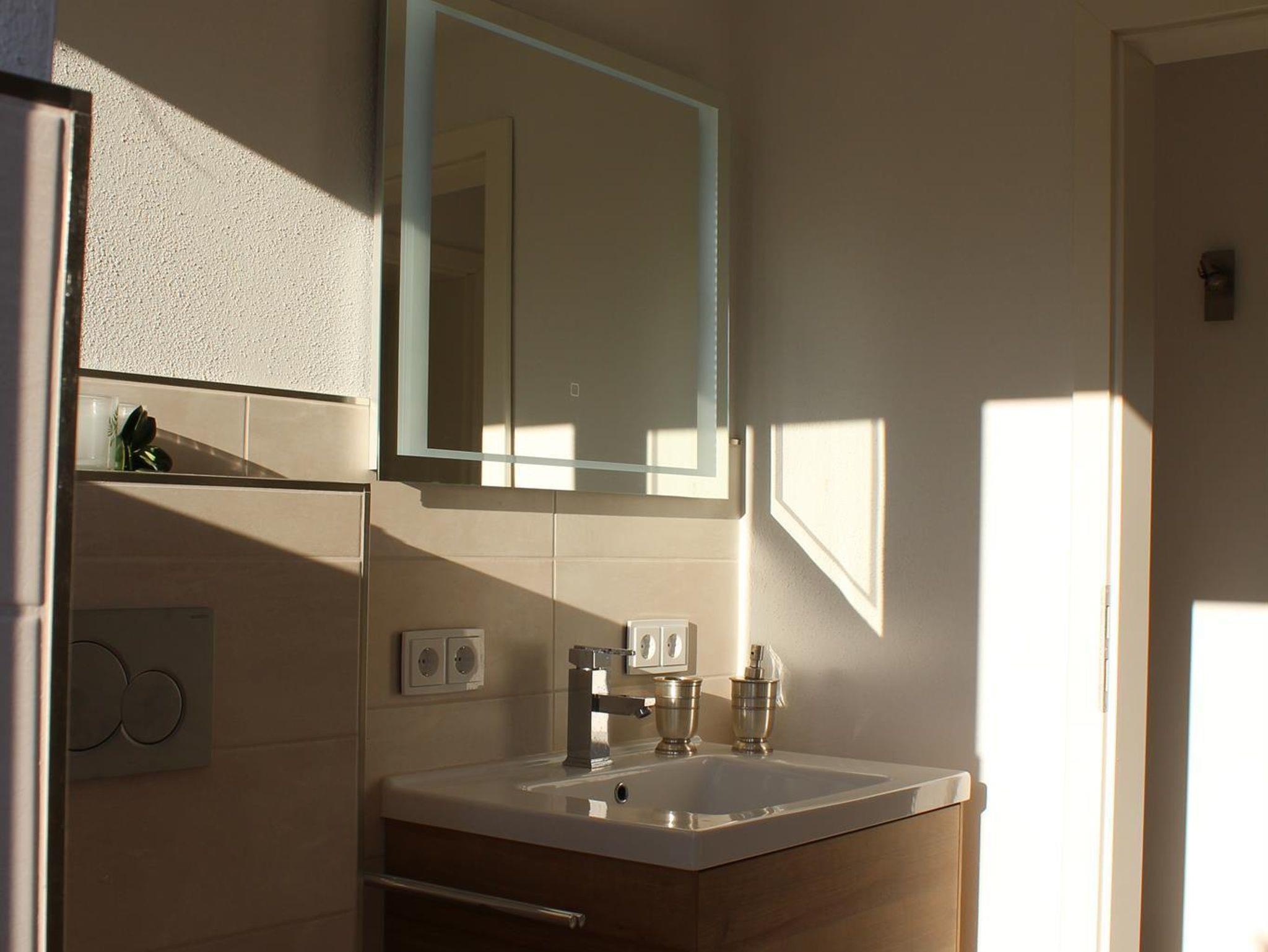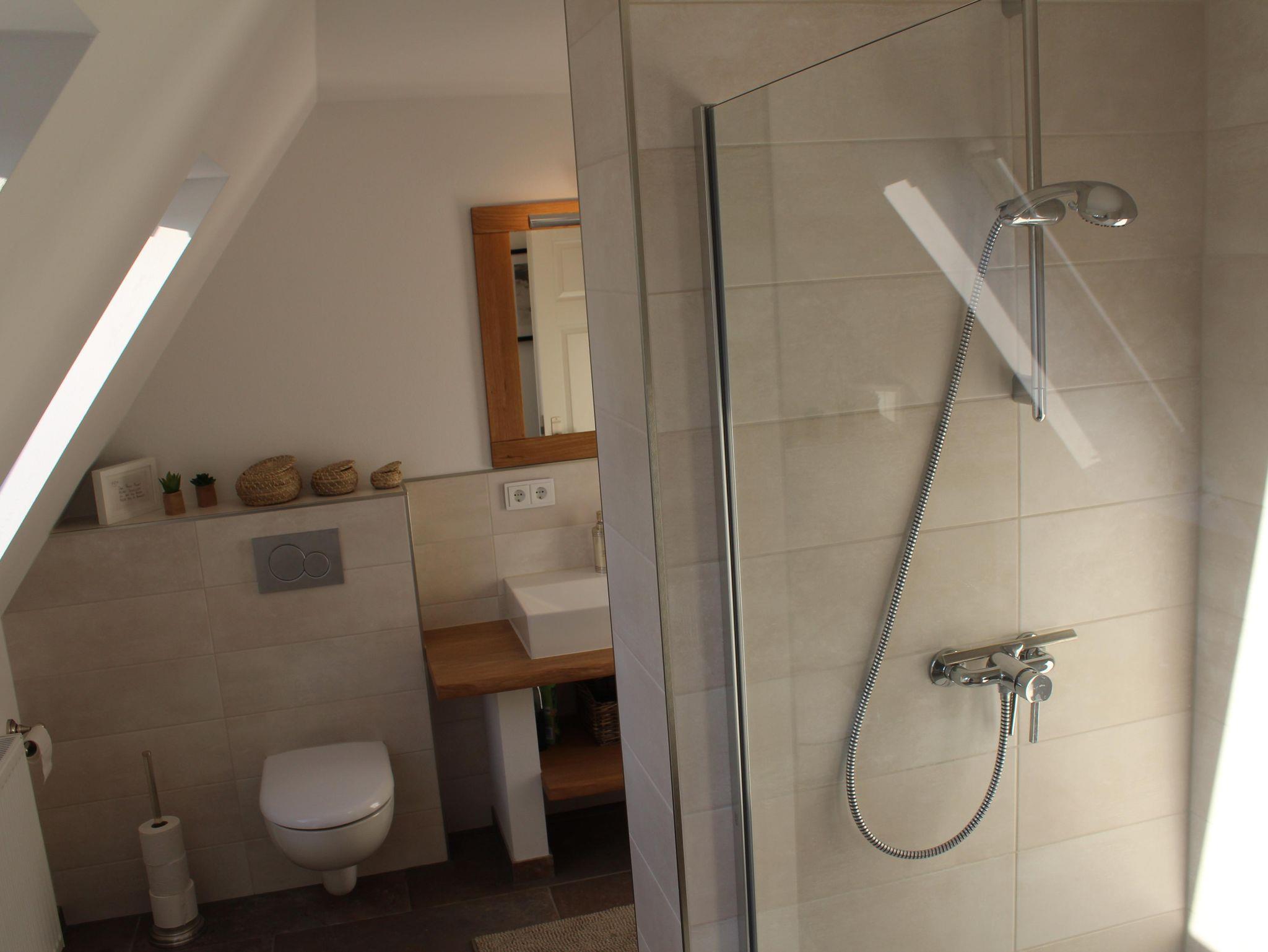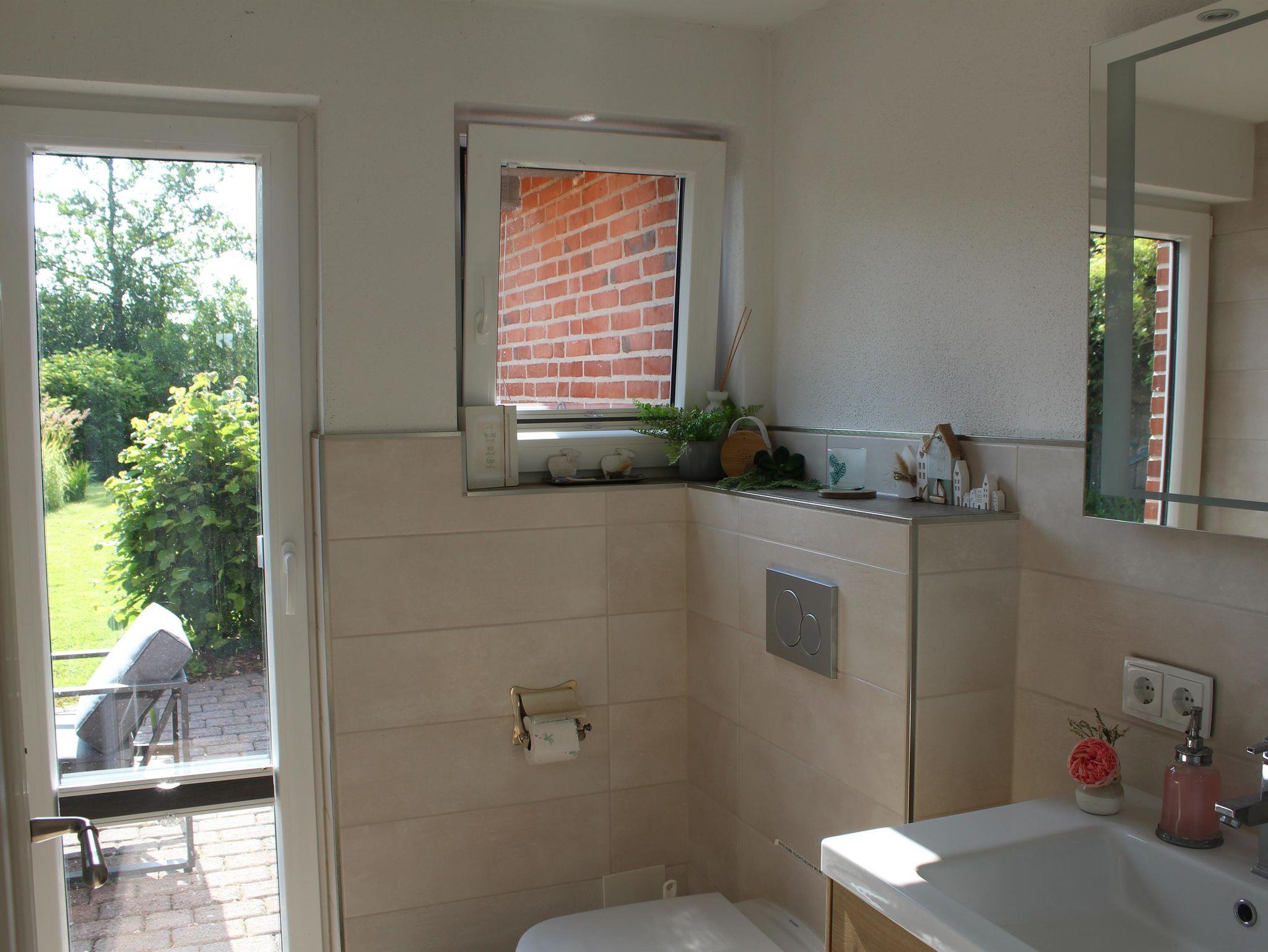 Im Badezimmer des Erdgeschosses haben Sie die Möglichkeit, direkt nach einem entspanntem Saunagang, von aussen den Duschraum zu betreten.
