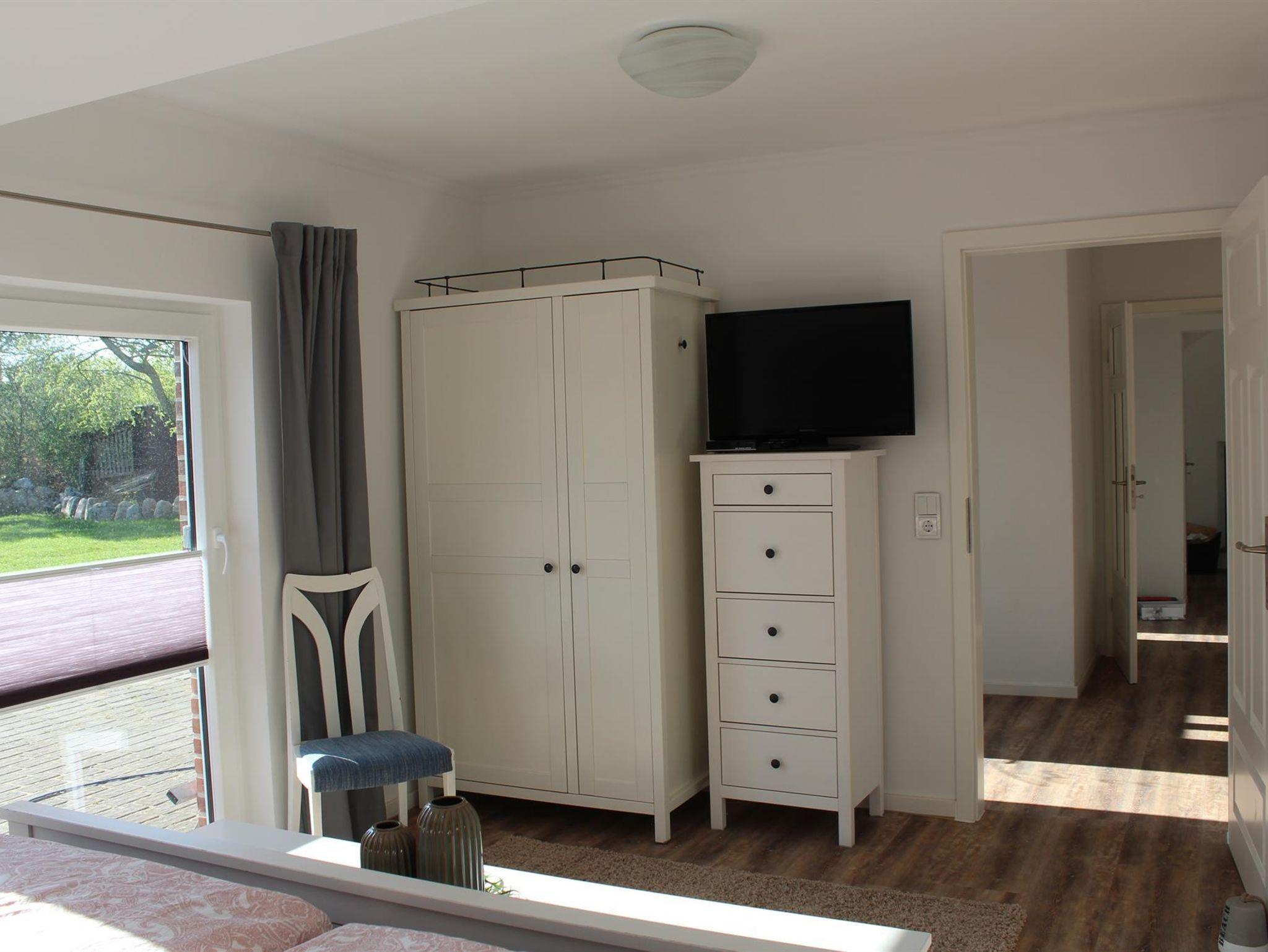 Das Schlafzimmer im Erdgeschoss bietet Ihnen direkten Zugang zum Garten. Lassen Sie sich hier von den ersten Sonnenstrahlen des Morgens wachkitzeln. Auch dieses Zimmer ist mit einem Fernseher und einem geräumigen Kleiderschrank ausgestattet.