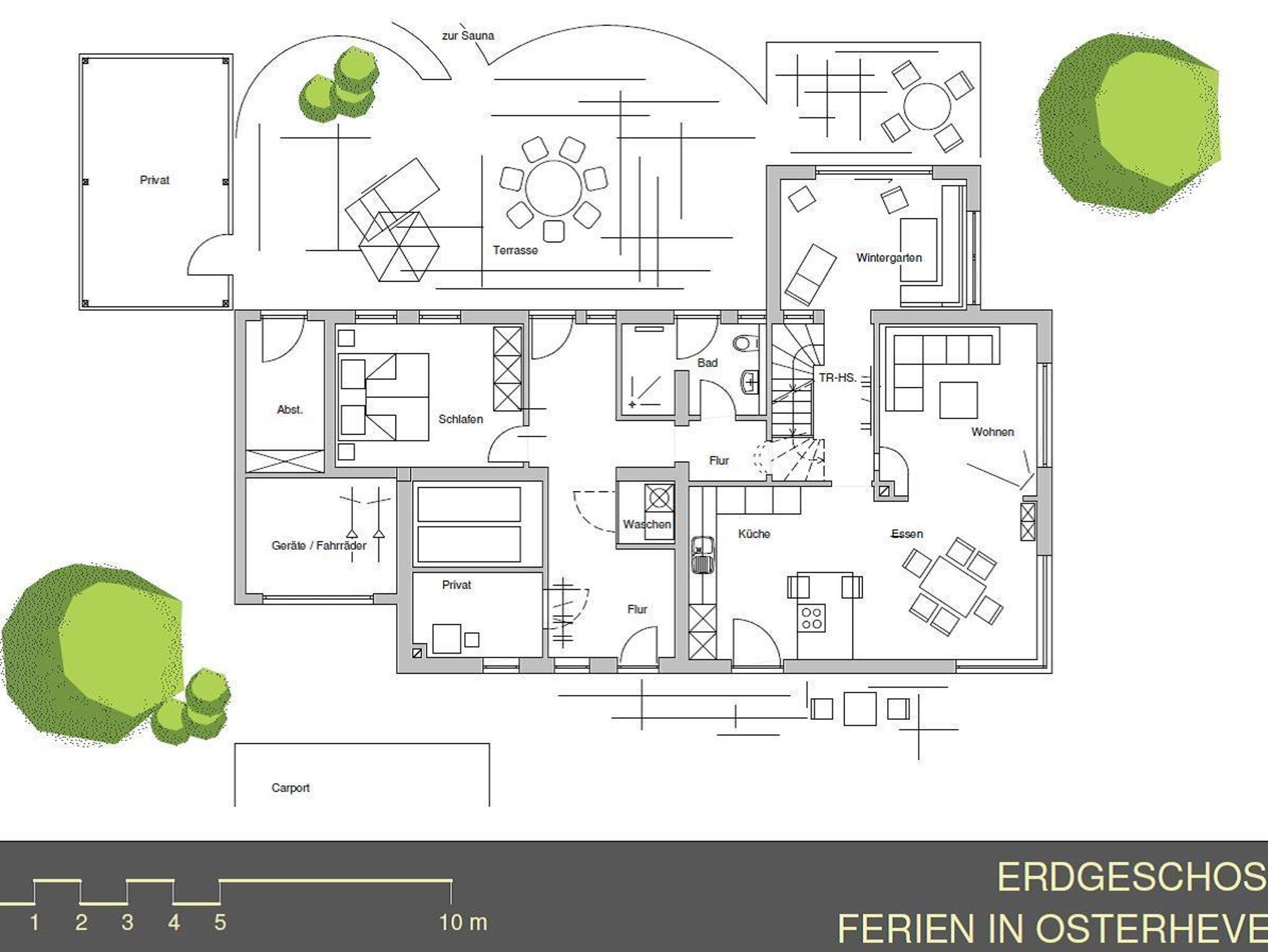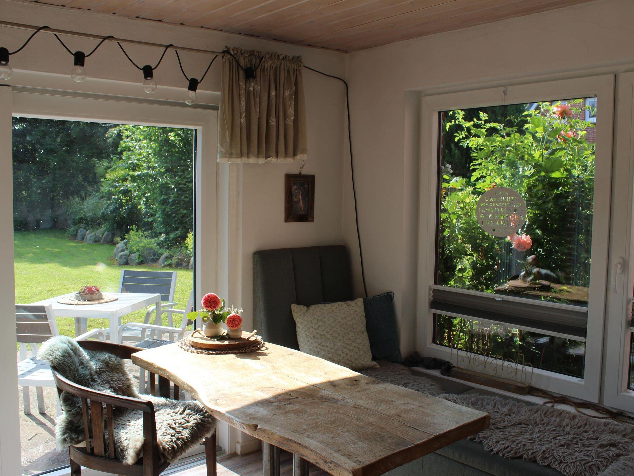 Besonders hervorzuheben ist der liebevoll gestaltete Garten mit seinen unterschiedlichsten Sitzgelegenheiten. Die Gartensauna lädt nach einem langen Strandspaziergang zum Verweilen ein. Erfrischen Sie Ihre Füße in dem Teich vor der Sauna, bevor es direkt von draußen in die wohlige Dusche geht. Im Wintergarten heißt es dann, mit der behaglichen Wärme vorm Kamin, sich redlich zu entspannen. Im Spitzboden des Hauses - unserem Eulennest - befindet sich der Meditationsraum.