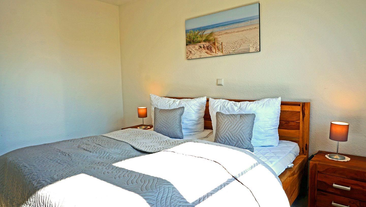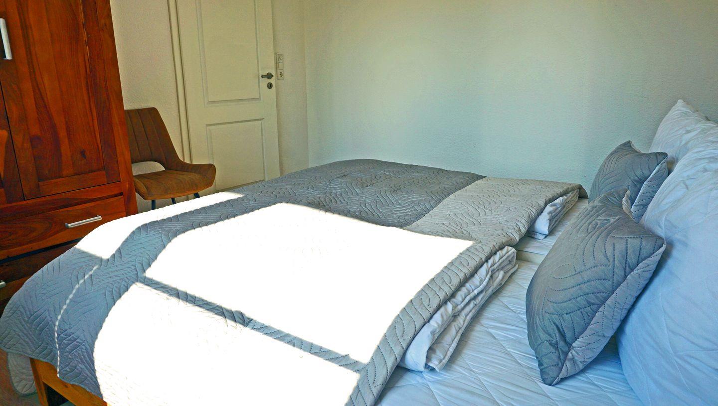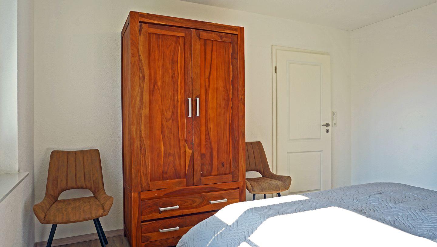 Schlafzimmer mit Doppelbett mit Einzelmatratzen (erreichbar über das Wohnzimmer), Kleiderschrank.