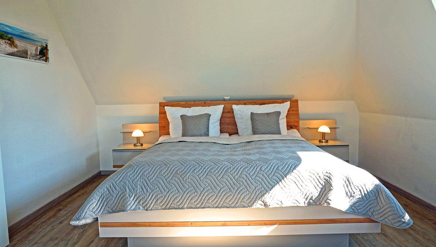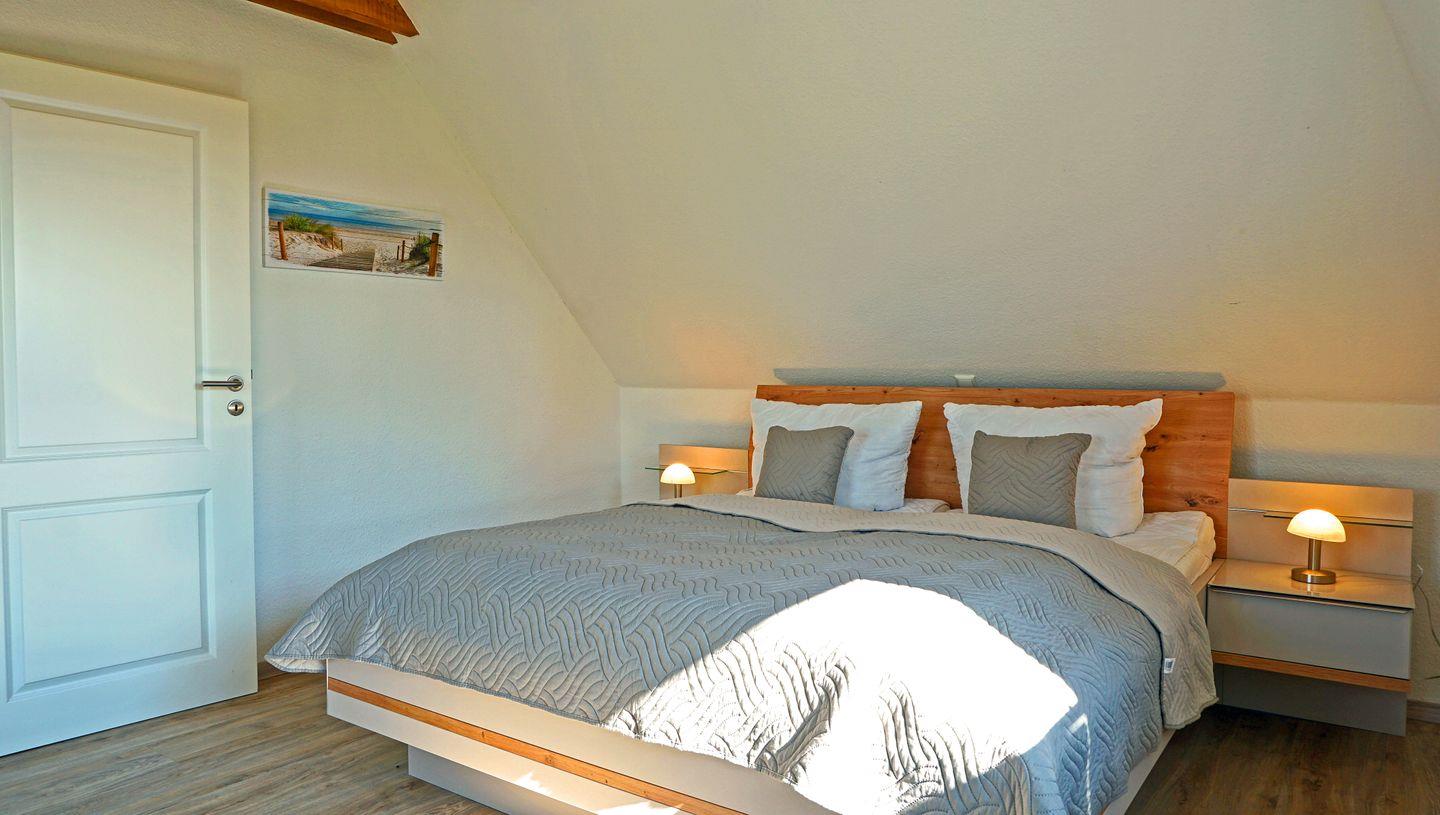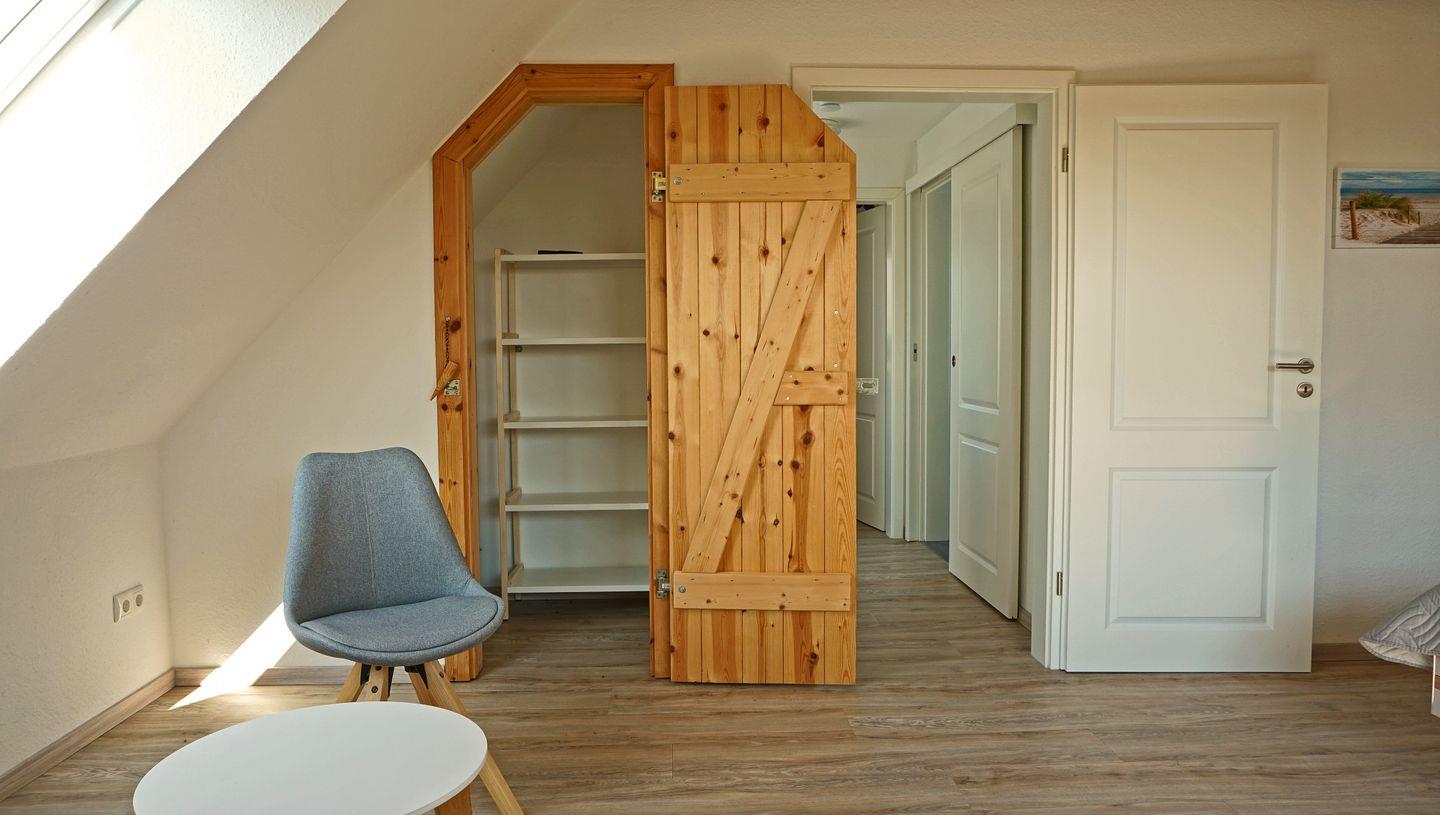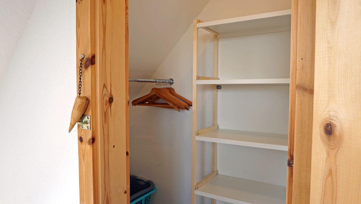 Schlafzimmer mit Doppelbett mit Einzelmatratzen (erreichbar über das Wohnzimmer), Kleiderschrank.