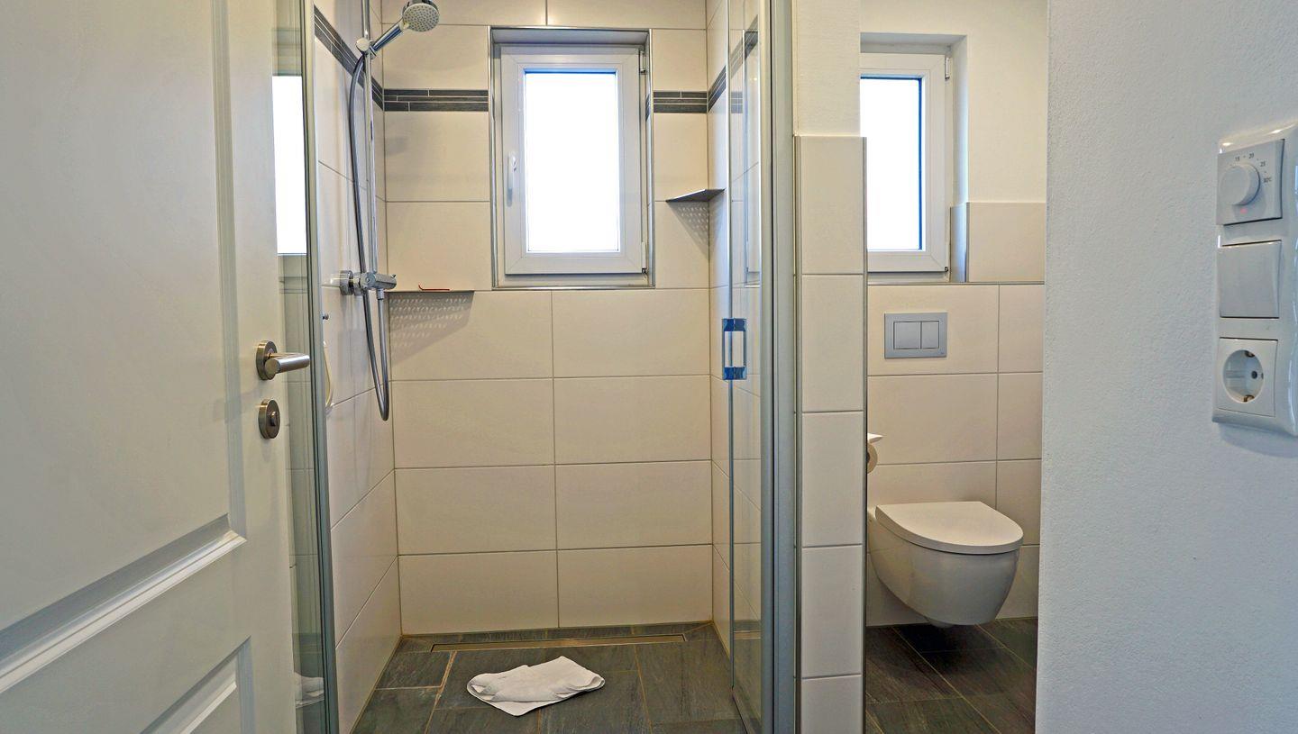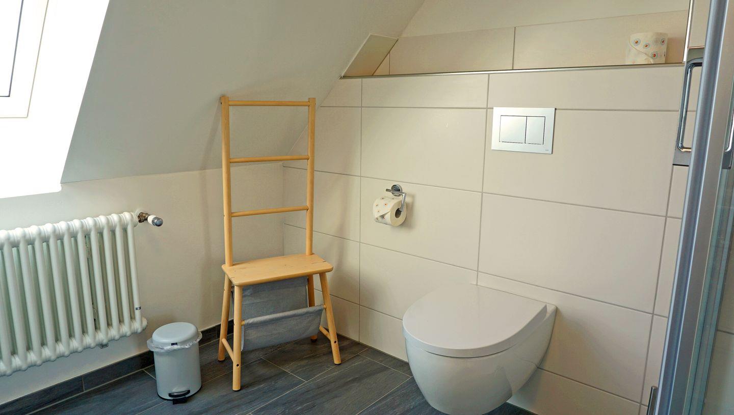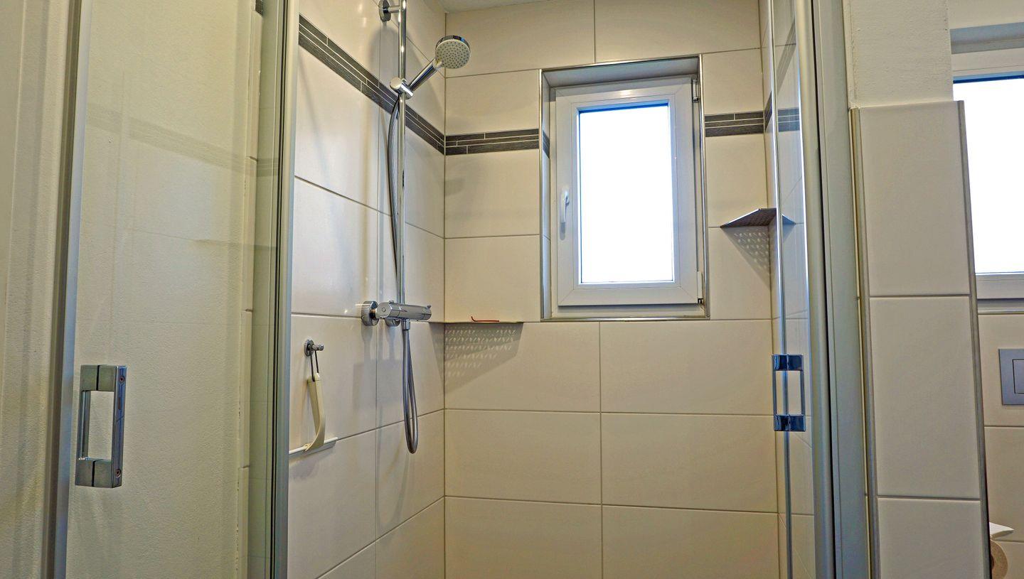 Duschbad mit ebenerdiger Dusche, Handtucherwärmung.