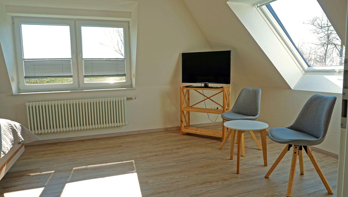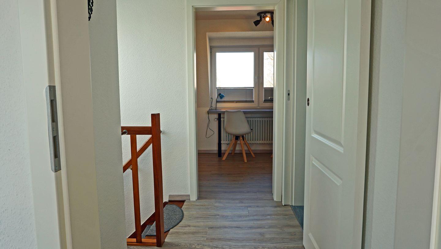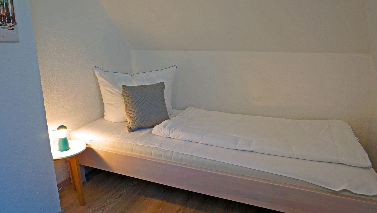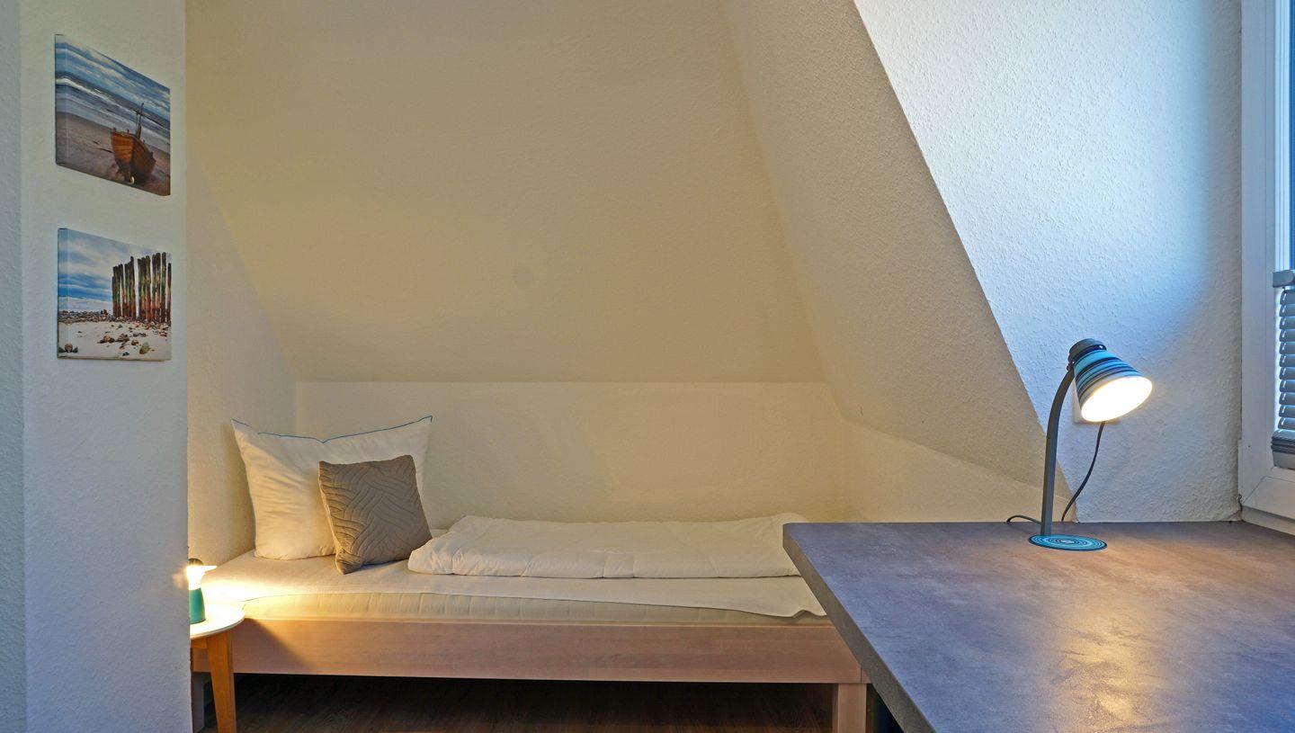 Schlafzimmer mit 2 Einzelbetten, Kleiderschrank, Schreibtisch vor dem Fenster.