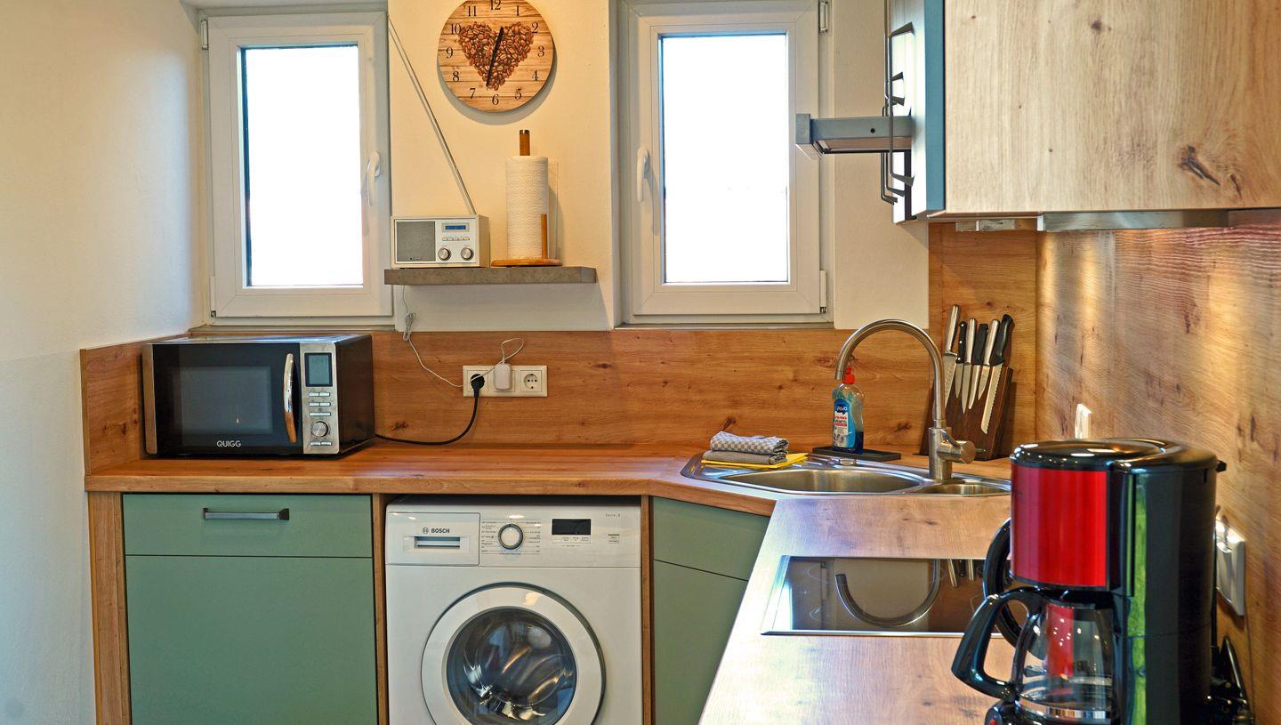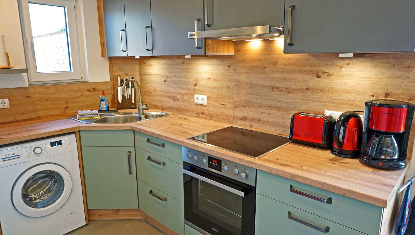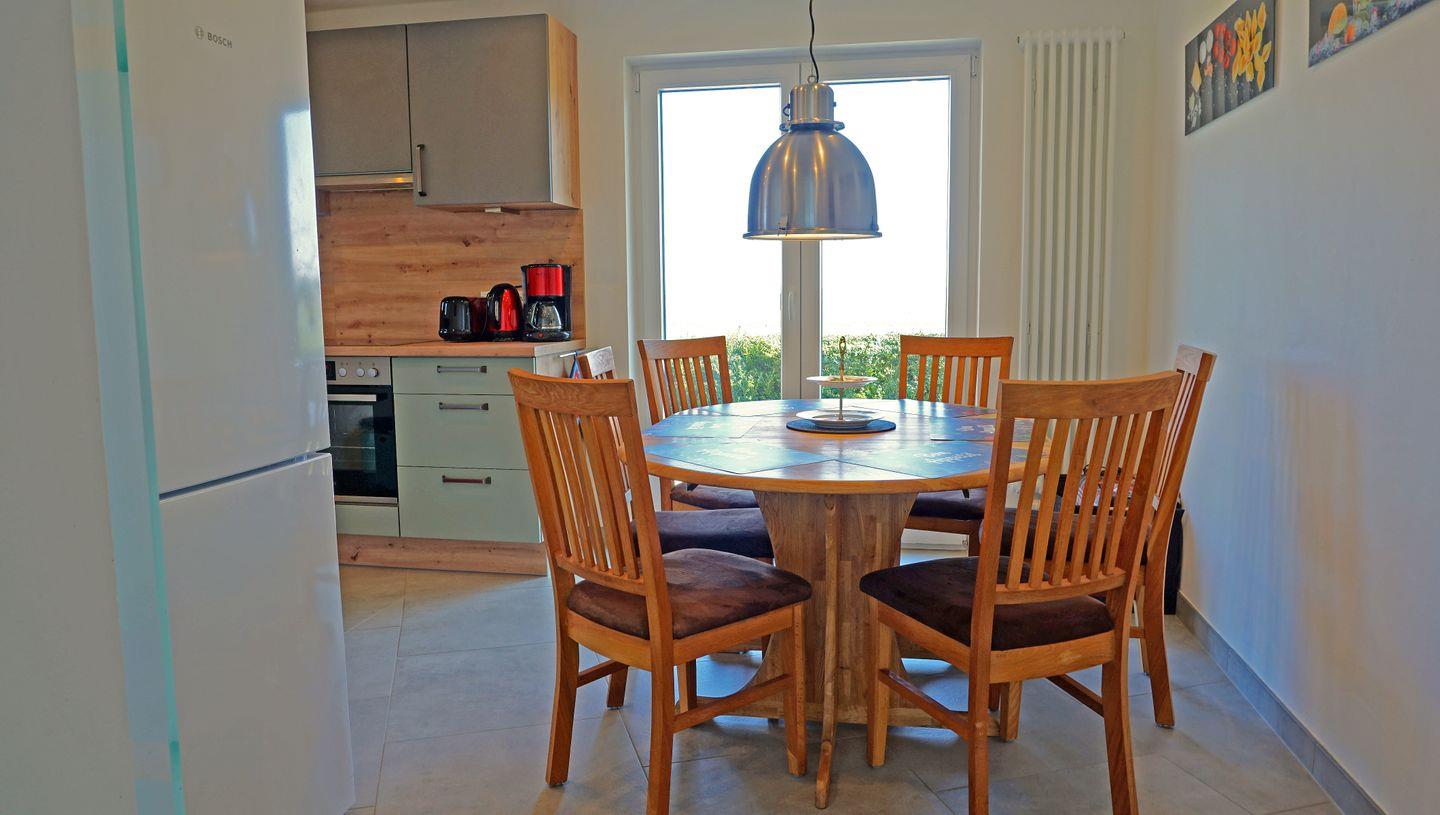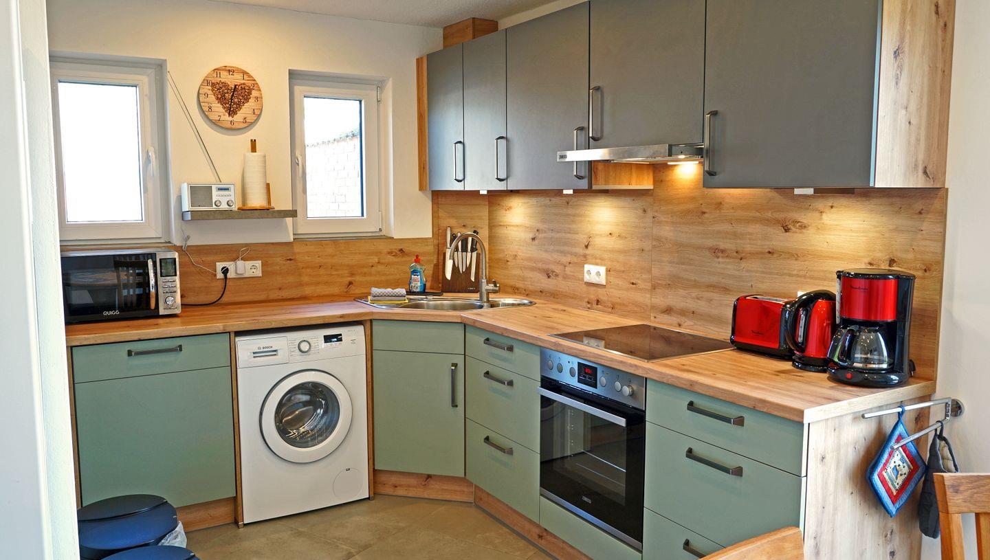 Küche mit Ausgang zur Terrasse, Essbereich. Die Küche ist ausgestattet mit Cerankochfeld, Backofen, Kühl-Gefrierkombination, Mikrowelle, Geschirrspülmaschine und Waschmaschine. Bügelbrett und Bügeleisen vorhanden.