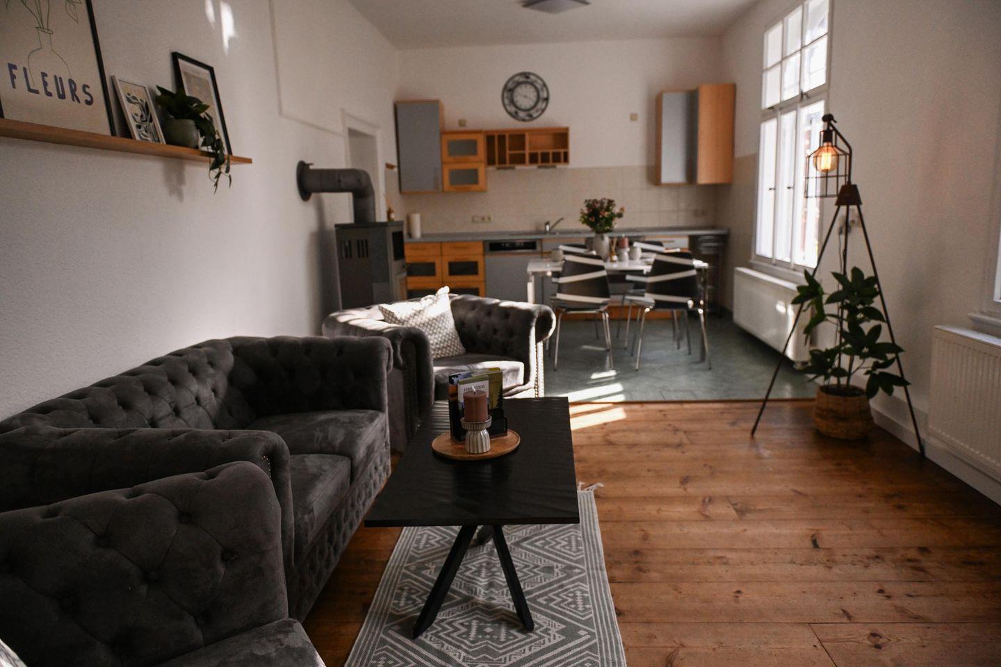 Draußen wartet eine kleine Terrasse mit Tisch und zwei Stühlen auf dich – dein Platz für den Kaffee in der Morgensonne oder für einen stillen Abend im Freien. Auf Wunsch kannst du dir eine Feuerschale dazu buchen und den Tag am knisternden Lagerfeuer ausklingen lassen, während über dir die Sterne stehen. Der Blick schweift über das Grundstück, über alte Bäume, das Mühlenhaus und das satte Grün des Harzvorlands – ein Ort, der sofort Ruhe schenkt. Parken kannst du direkt auf dem Grundstück. Check-in ist ab 15 Uhr möglich, Check-out bis 11 Uhr – beides erfolgt selbstständig über eine Schlüsselbox an der Unterkunft.