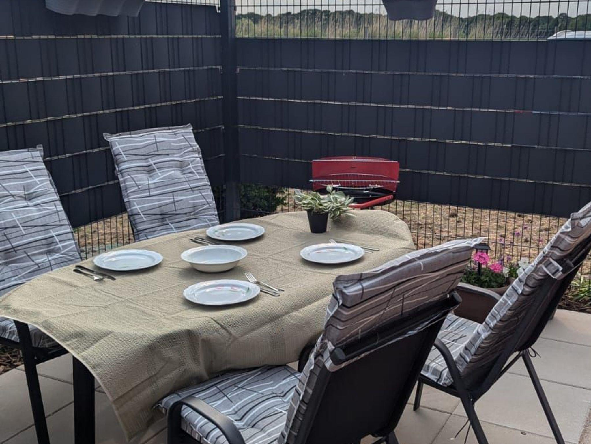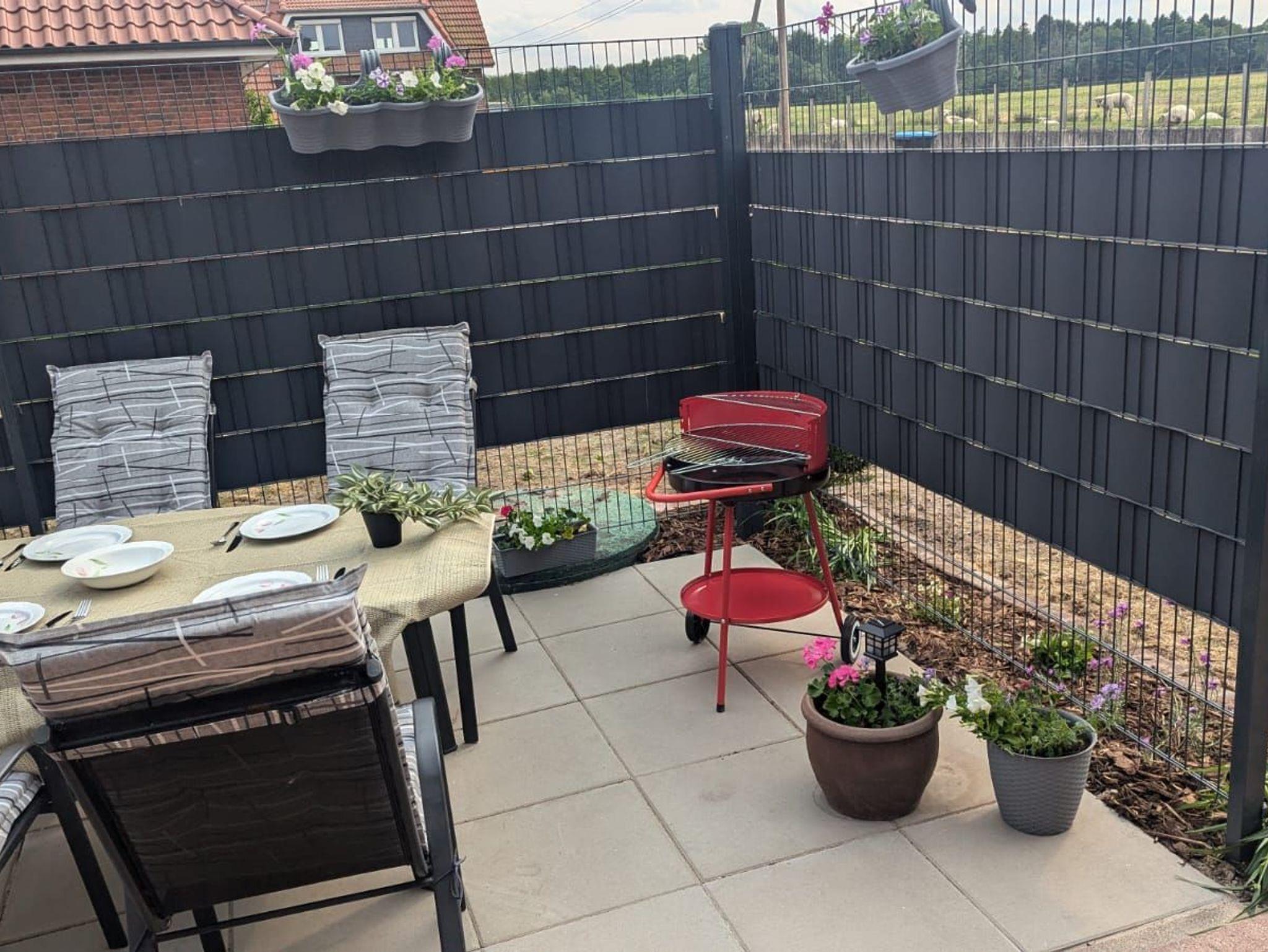 Auf der Terrasse genießen Sie sonnige Stunden im Freien. Die Terrasse ist ausgestattet mit einem Sonnenschirm, Tisch, Stühlen und Grill.