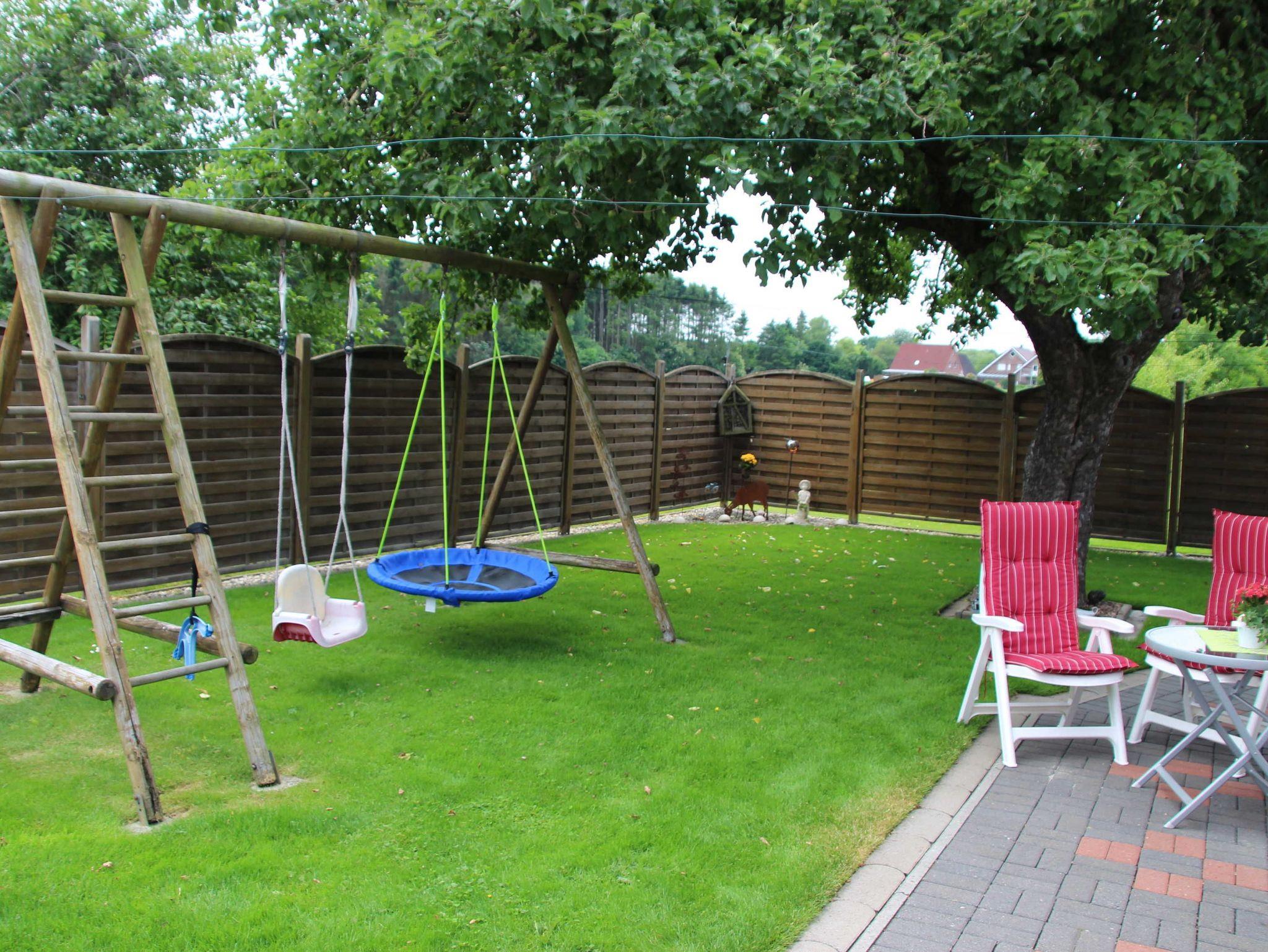Eine Terrasse /Garten mit Gartenmöbeln Spielbereich und Pool lädt zum Verweilen ein.