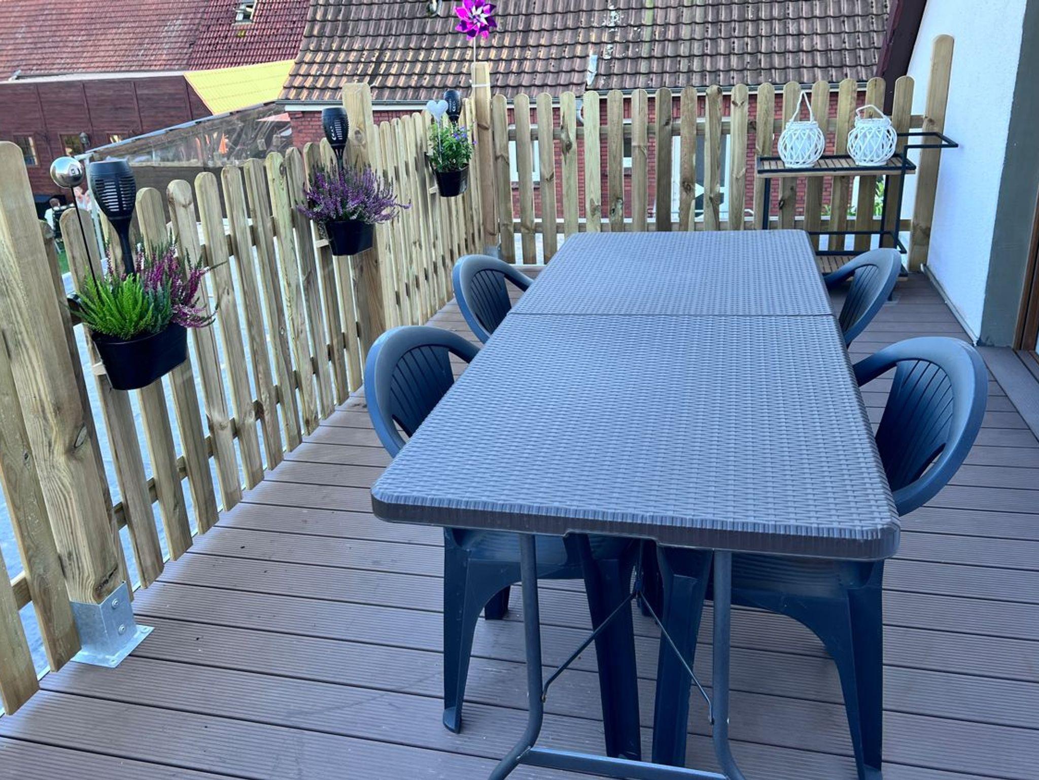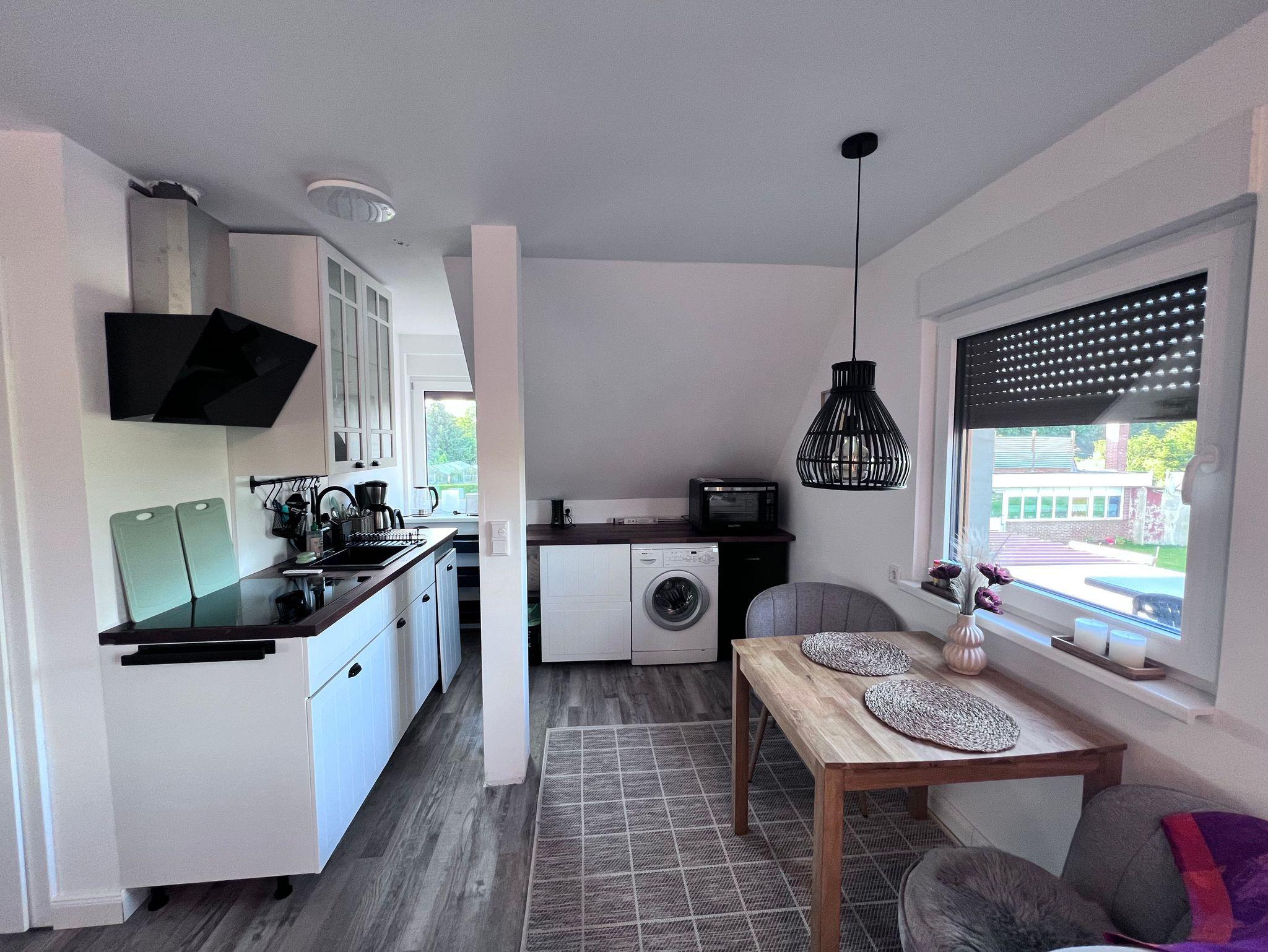 1 Raum Apartment befindet sich im 1. OG auf 46 m². Mit Wasch- und Spülmaschine, voll ausgestattete Küchenzeile, TV, große Dachterrasse, Doppelbett 180 breit, Schlafsofa, Nichtraucherwohnung, begb. Dusche mit viel Tageslicht.