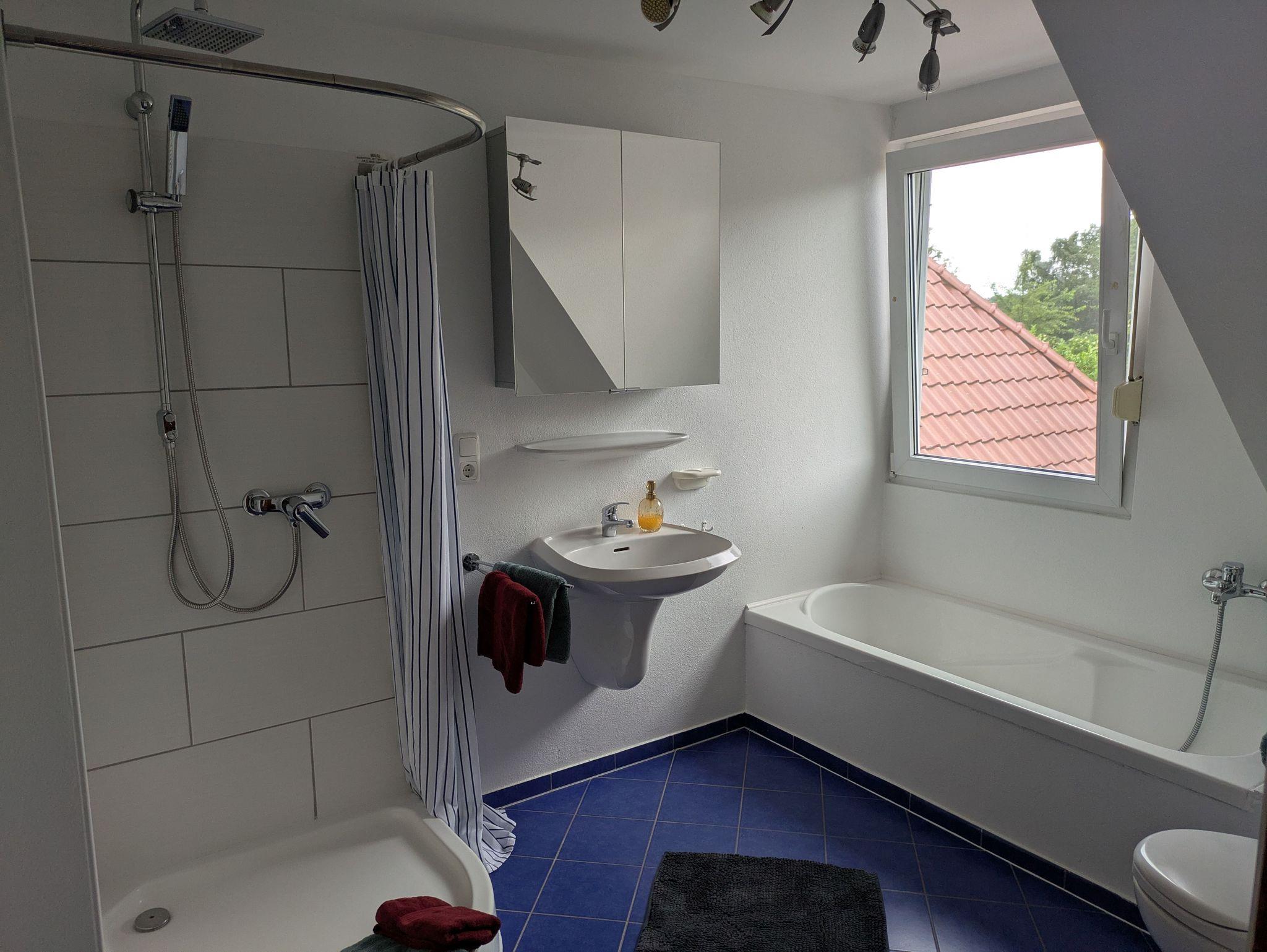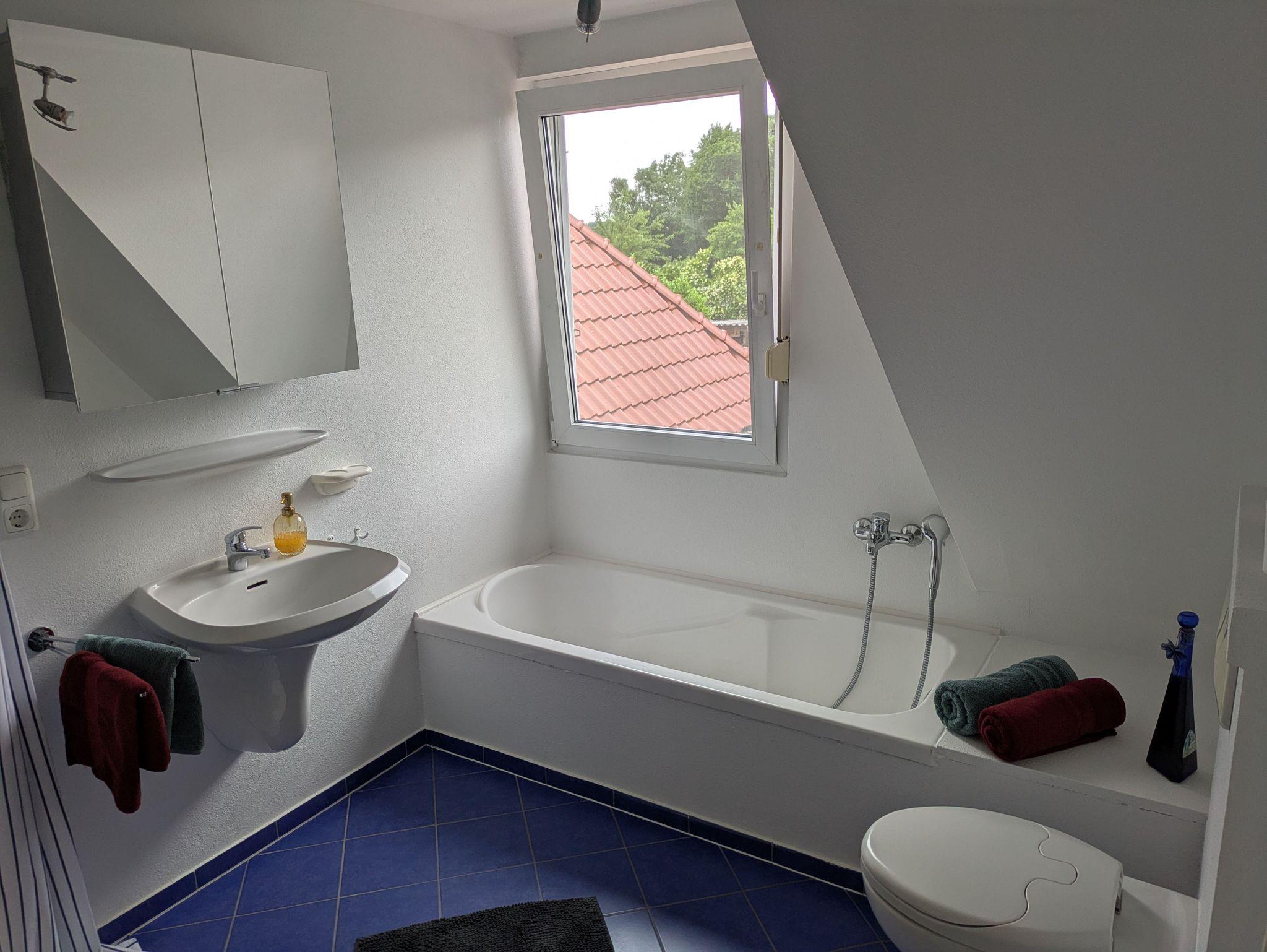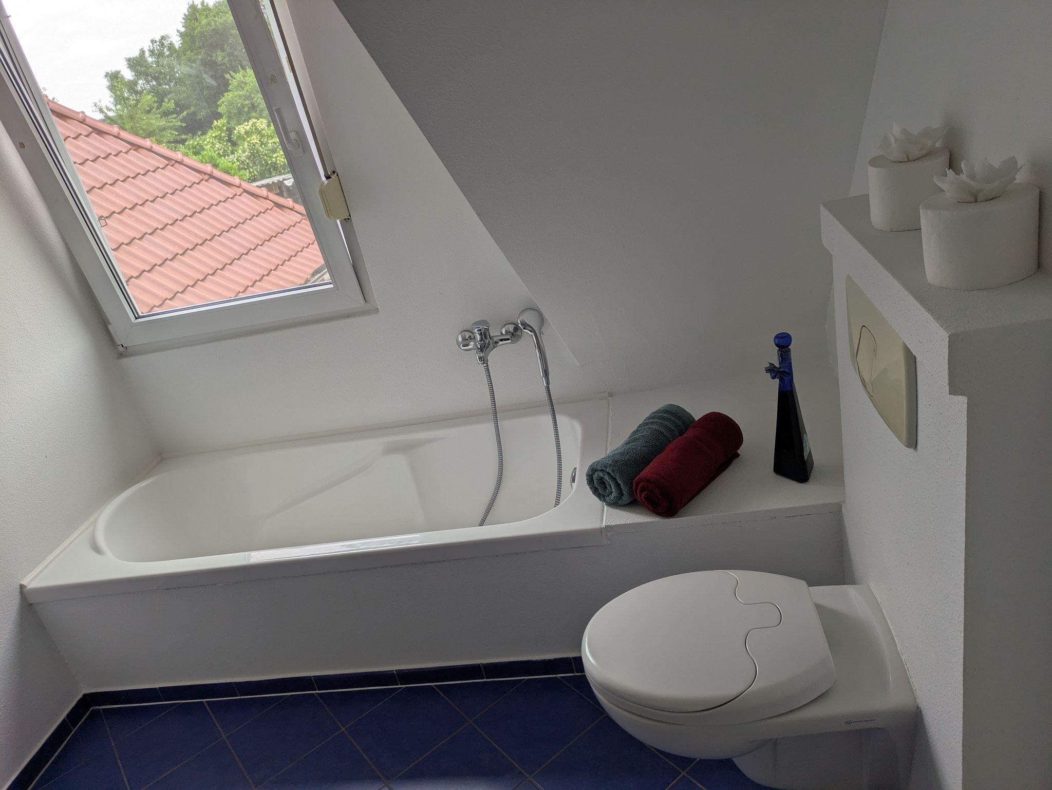 Das Badezimmer ist mit einer Badewanne, Dusche und WC ausgestattet.