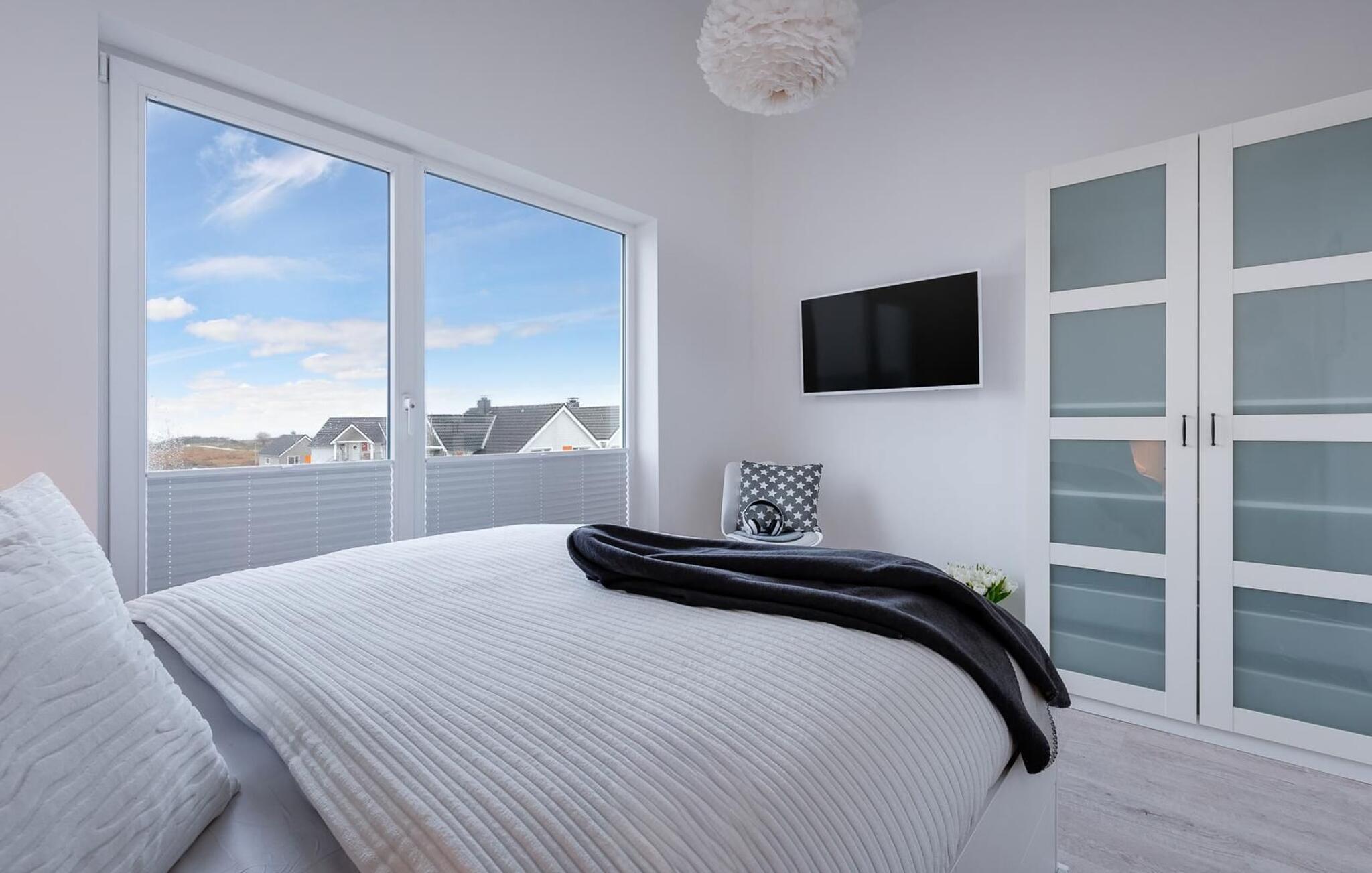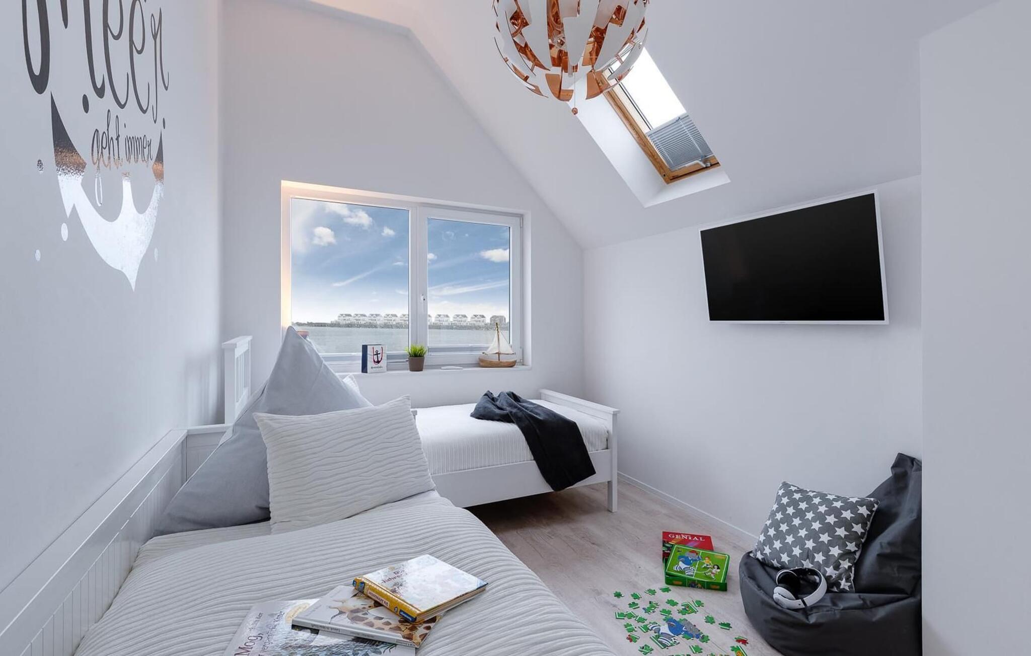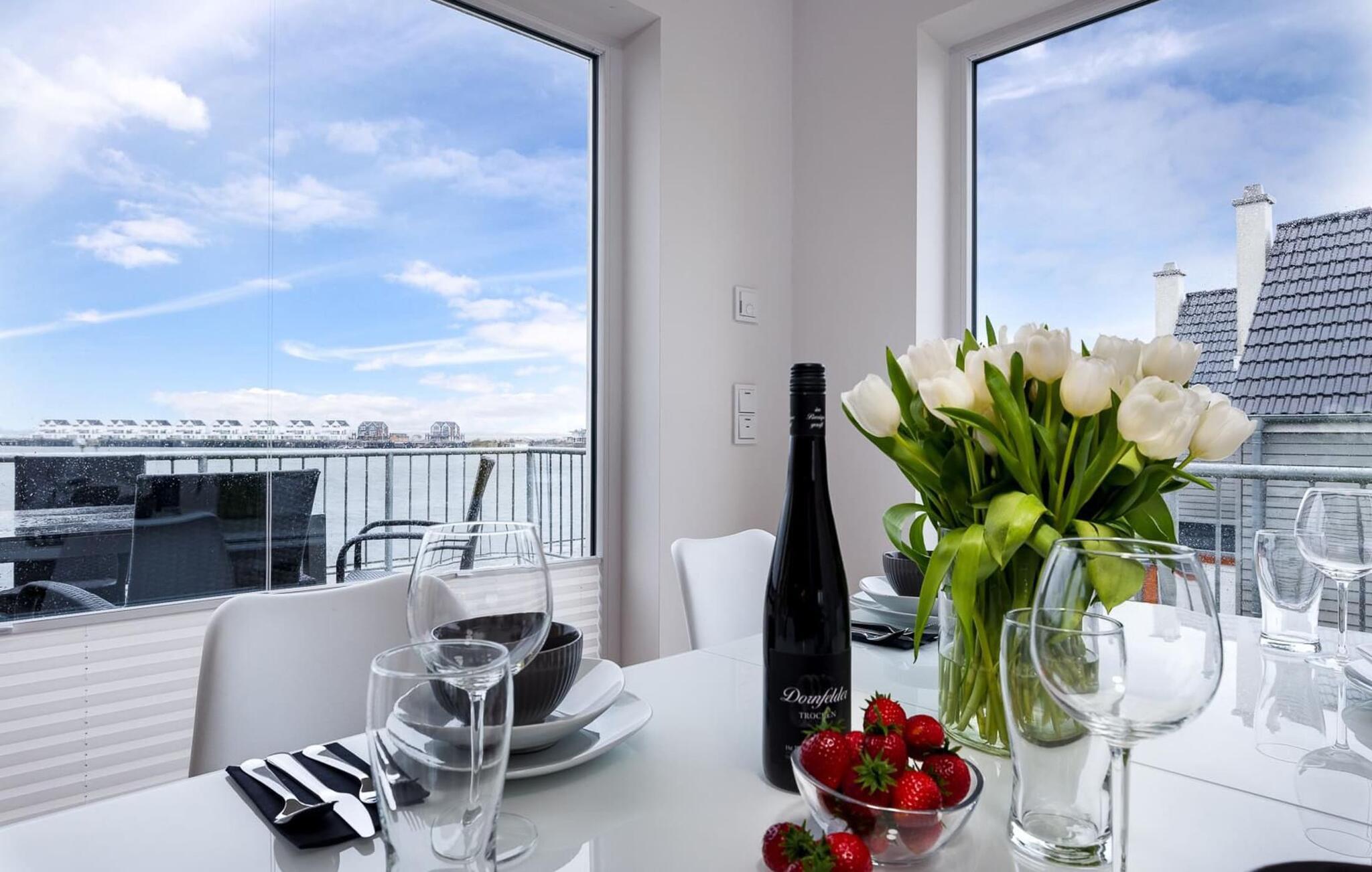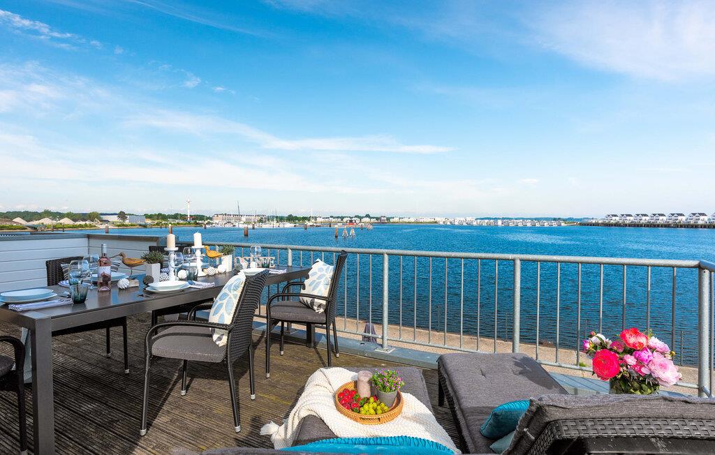 Ferielejlighedens opholds-/spisestue er oversvømmet med lys og har panoramavindue fra gulv til loft mod de tilstødende terrasser på begge sider. En fantastisk udsigt åbner op på terrassen ved siden af spisepladsen med udsigt over sejler- og sportsbådhavnen i OstseeResort Olpenitz. Havnebiograf og romantiske solnedgange er garanteret, og I kan også slappe af her med en god bog.